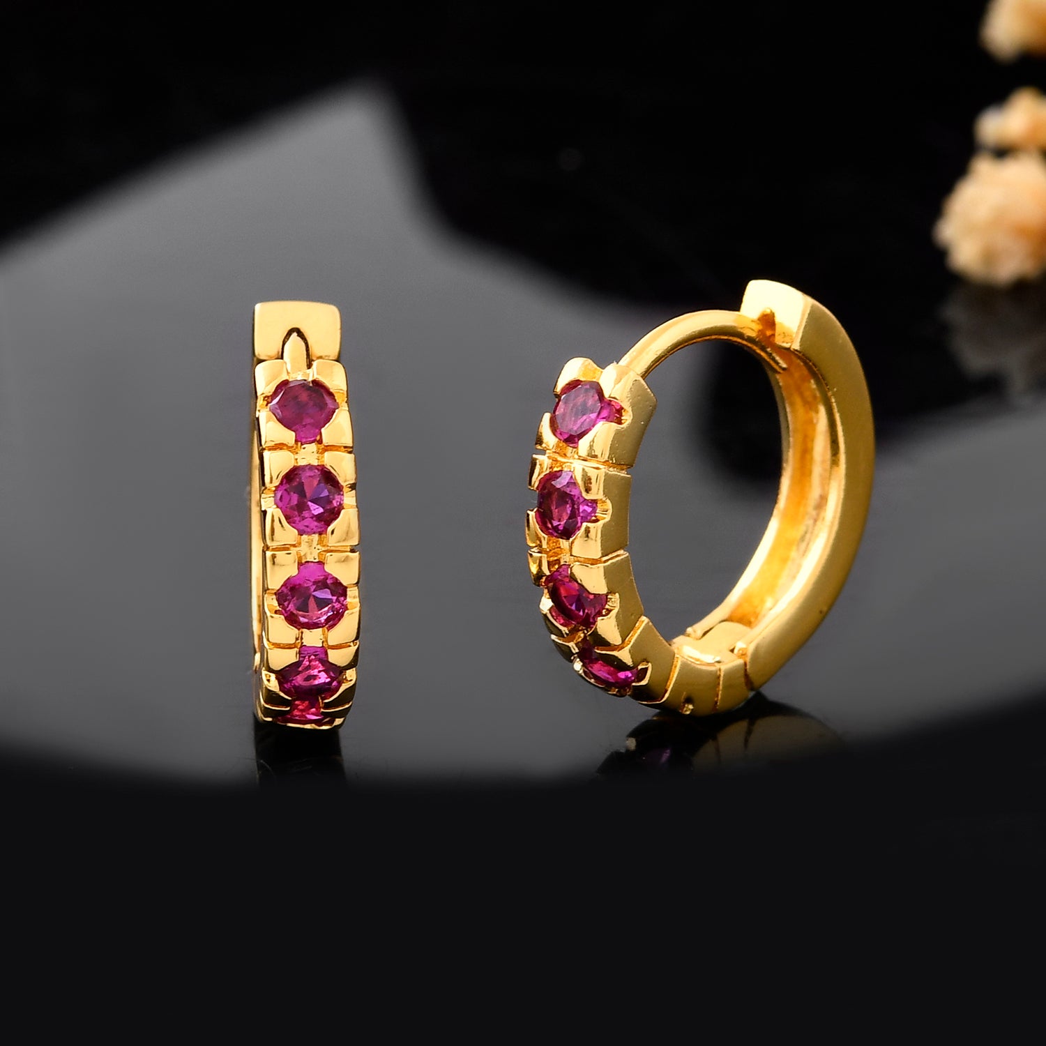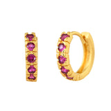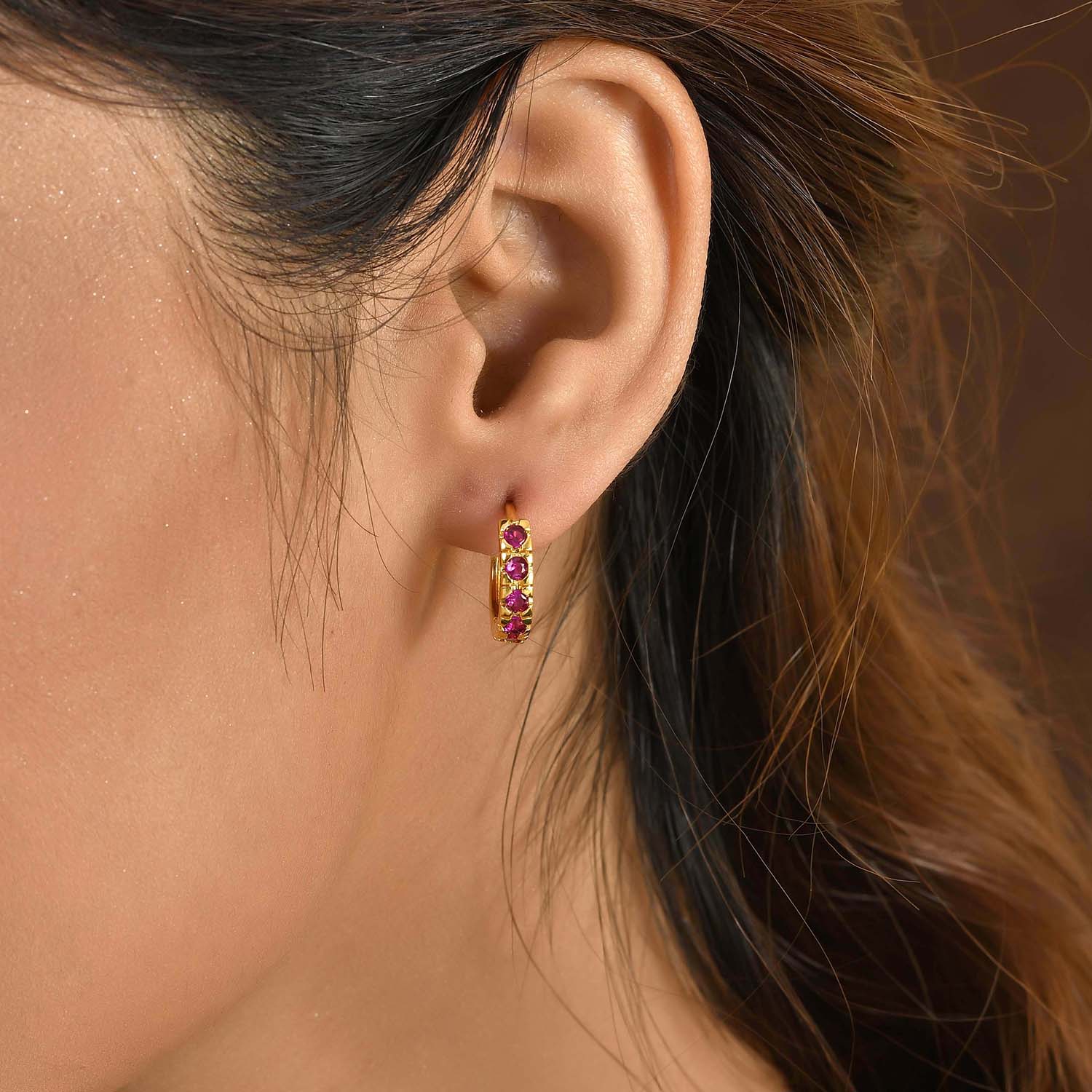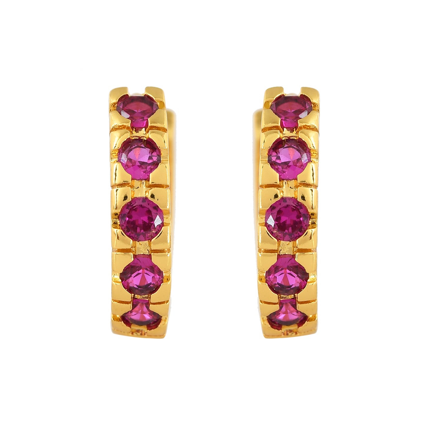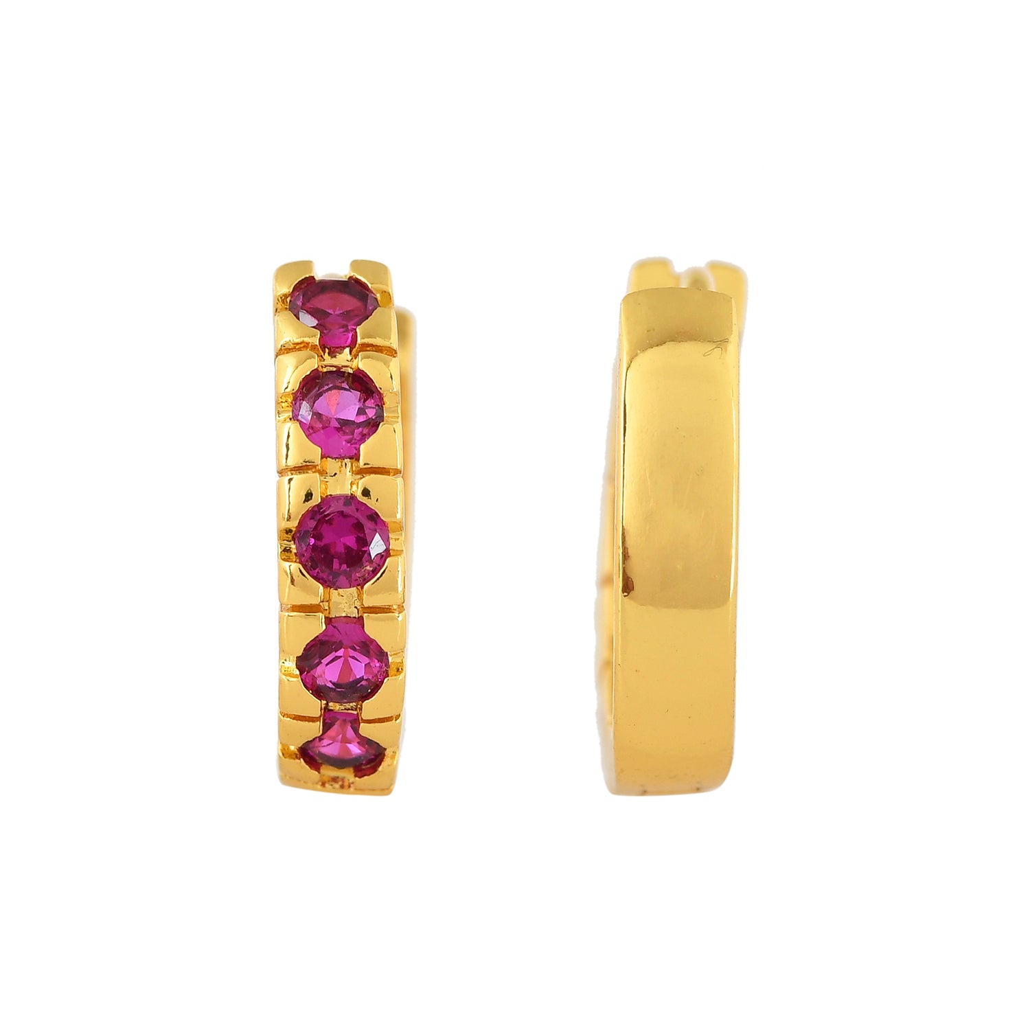 The Sitar Hoop Stud Earrings from the Sparkling Essentials Collection are a stunning blend of elegance and modern design. Crafted from high-quality brass and plated with luxurious gold, these earrings feature a row of vibrant purple gemstones that add a touch of sophistication to any outfit. Perfect for both everyday wear and special occasions, these statement earrings are versatile enough to complement western, ethnic, festive, and workwear styles. Whether you're dressing up for a wedding, a festive celebration, or simply adding a touch of glamour to your daily look, these earrings are a must-have accessory. They make an excellent gift for women on occasions like Valentine's Day, Diwali, Rakshabandhan, Christmas, New Year, and more. Ideal for gifting to sisters, girlfriends, wives, mothers, and lovers, these trendy earrings are sure to be cherished.