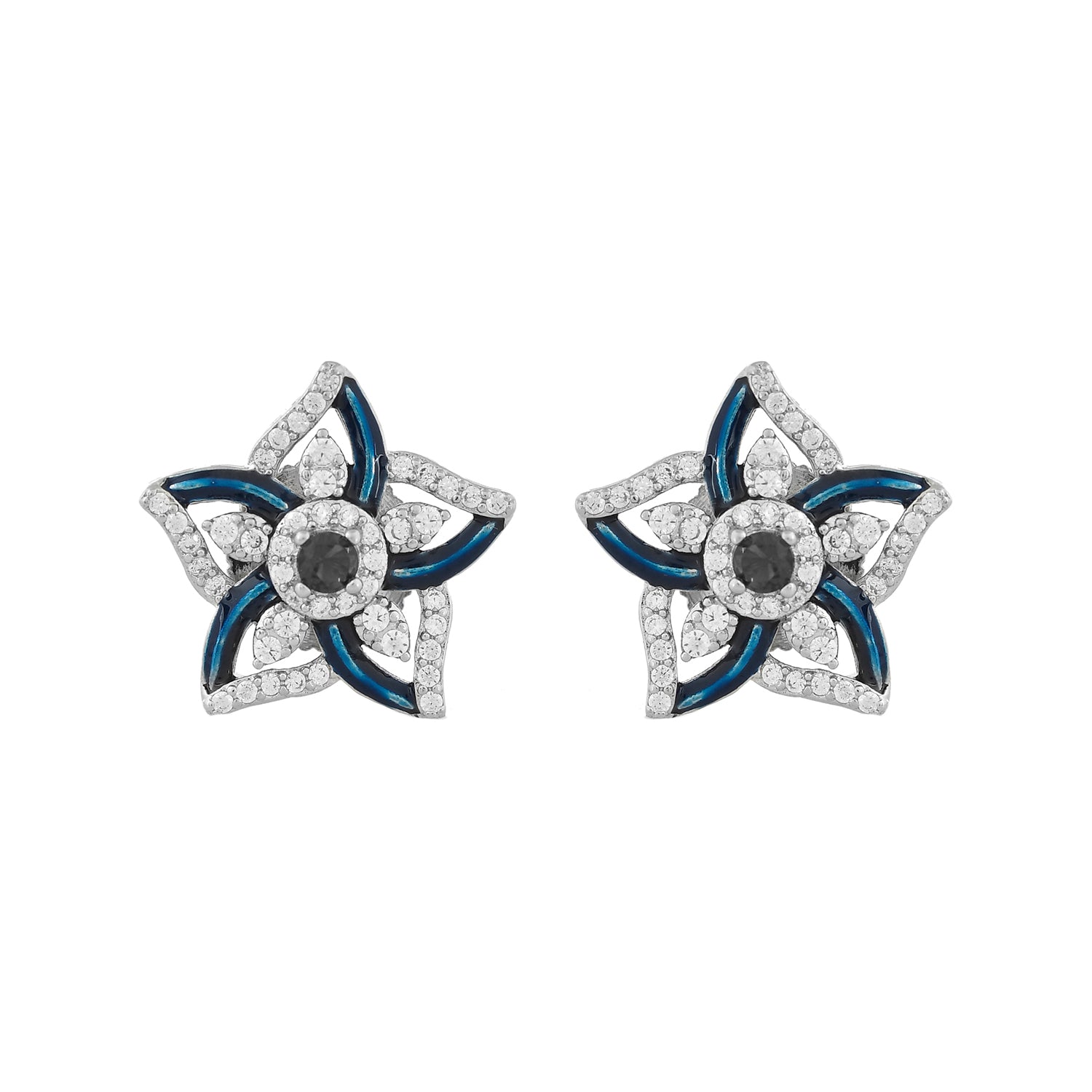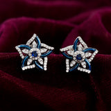 Introducing the Starlight Stud Earrings, a stunning piece from the Sparkling Essentials collection that promises to add a touch of elegance and glamour to any outfit. These earrings are meticulously crafted from high-quality brass and plated with rhodium to ensure durability and a luxurious finish. The centerpiece is a captivating blue stone, surrounded by delicate petals encrusted with shimmering American diamonds, creating a beautiful floral design that captures the light brilliantly.Whether you're dressing up for a festive event, a wedding, a cocktail party, or simply enhancing your daily workwear. Pair them with elegant dresses, blouses, sarees, or lehengas to create stunning looks that draw admiration.Their elegant deep purple hue adds a touch of sophistication, making them an ideal gift for women on occasions like Valentine's Day, Diwali, Rakshabandhan, Christmas, and New Year. Whether for a girlfriend, wife, mother, or sister, these trendy earrings are sure to impress and delight.