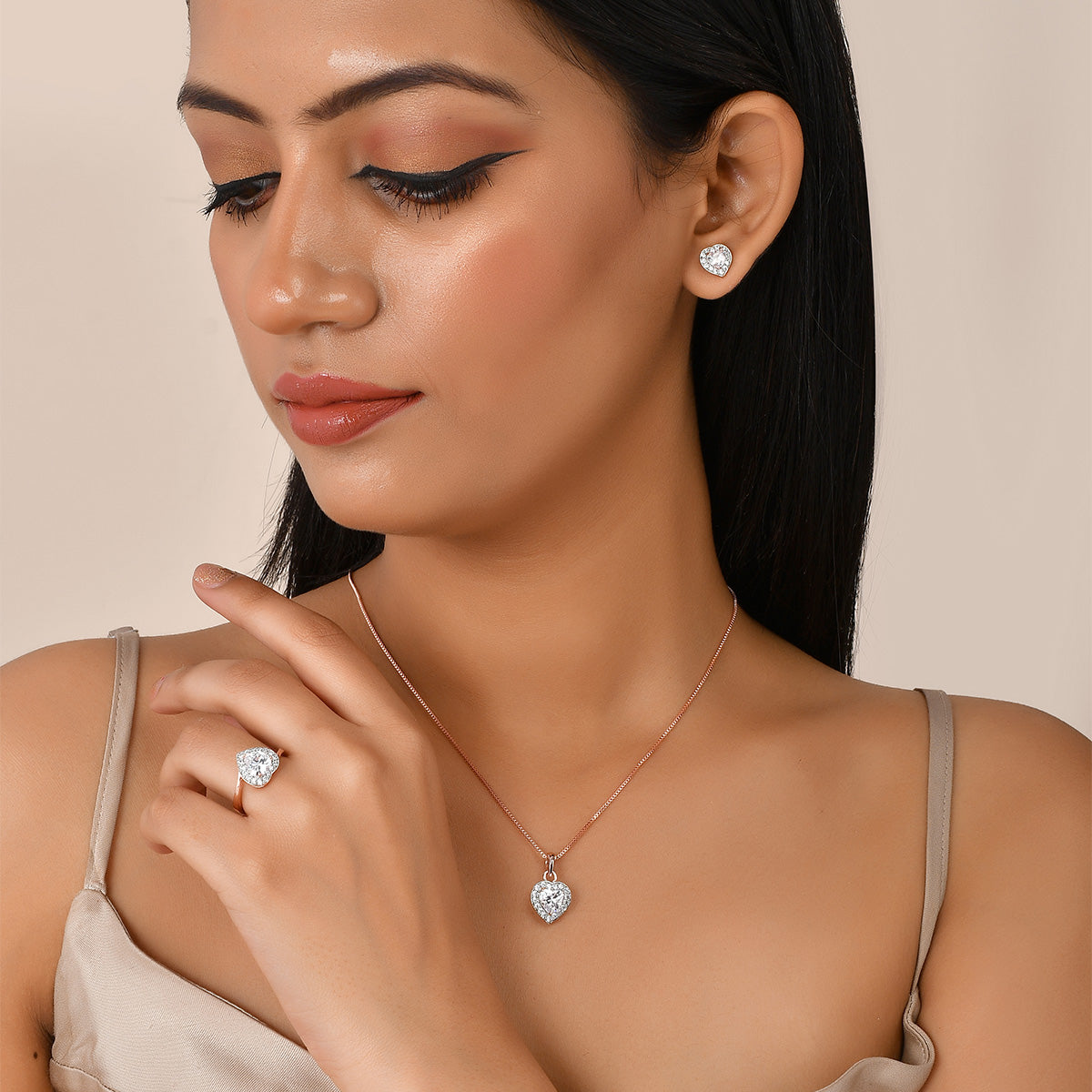 A complete jewellery box set, consisting of pendant with Chain, earrings and ring. Made from brass and two tone plated, each piece has been embellished with a cluster setting, heart shaped white zirconia gemstone. Pair with any of your favourite outfits.