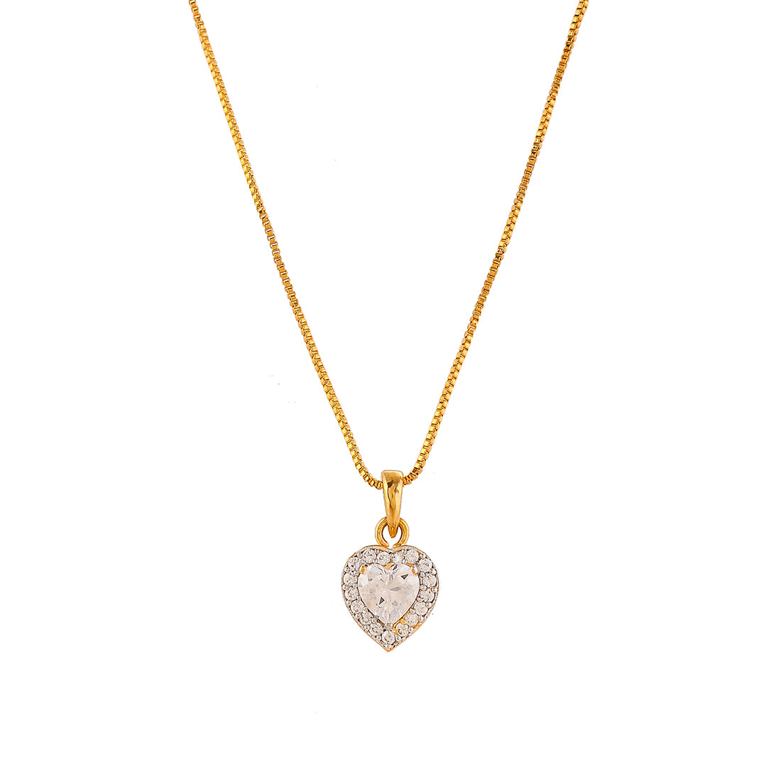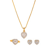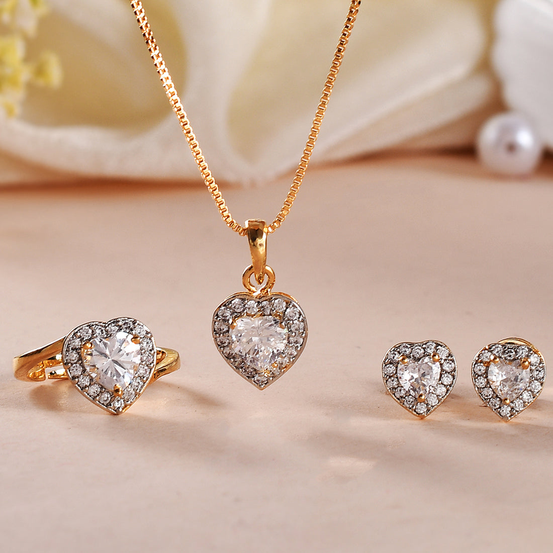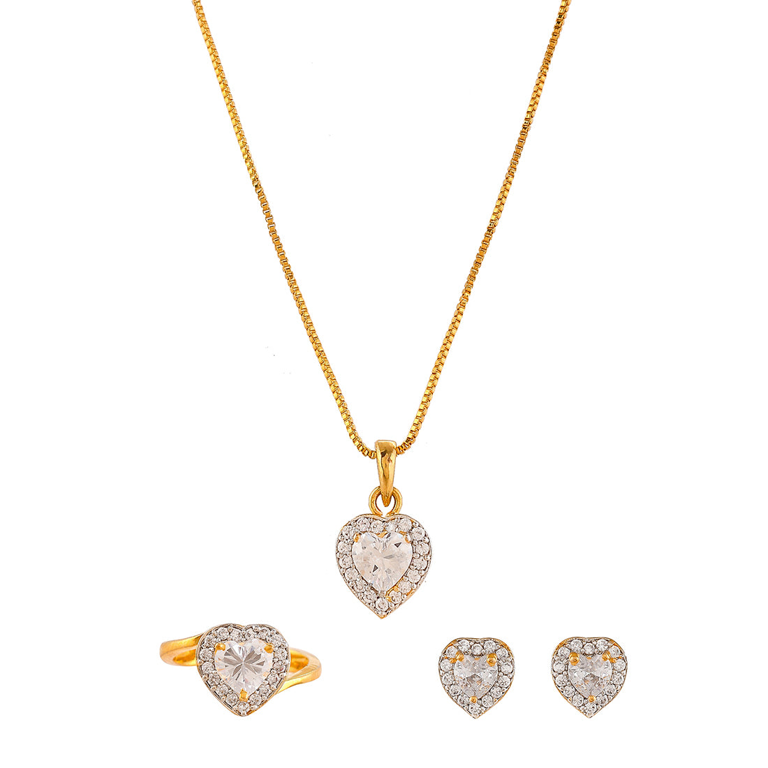 A complete jewellery box set, consisting of pendant with Chain, earrings and ring. Made from brass and two tone plated, each piece has been embellished with a cluster setting, heart shaped white zirconia gemstone. Pair with any of your favourite outfits.