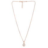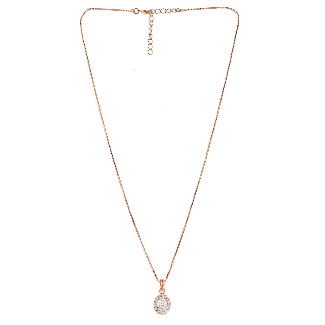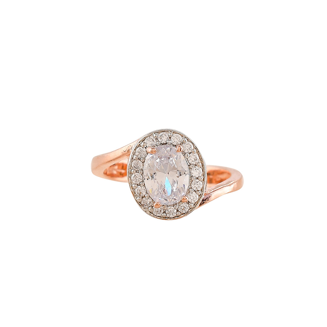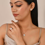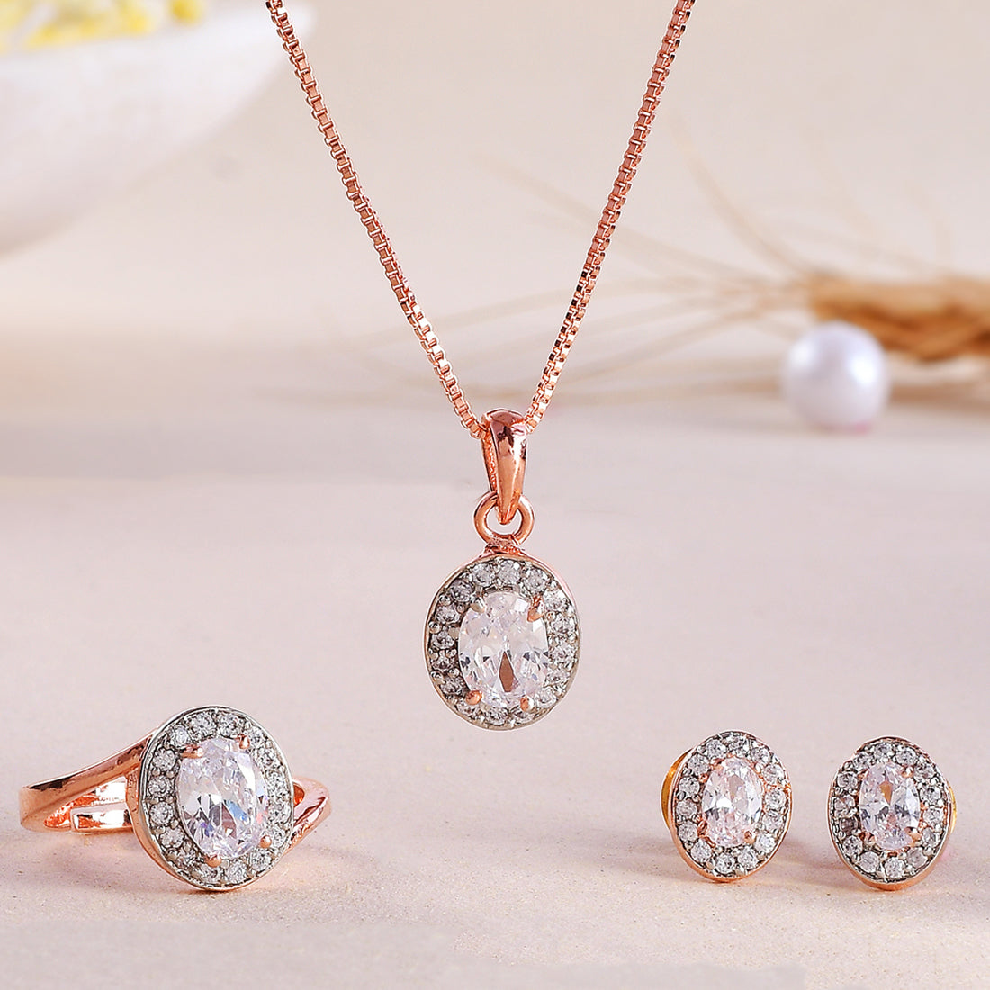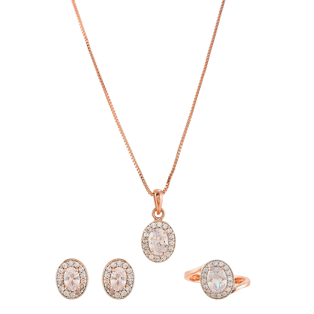 Brass jewellery box set, inclusive of a pendant with Chain, stud earrings and ring. Each piece has been given a two tone plating and embellished with white, oval cut zirconia gemstone in a cluster setting. A good match for outfits and looks of all kinds.