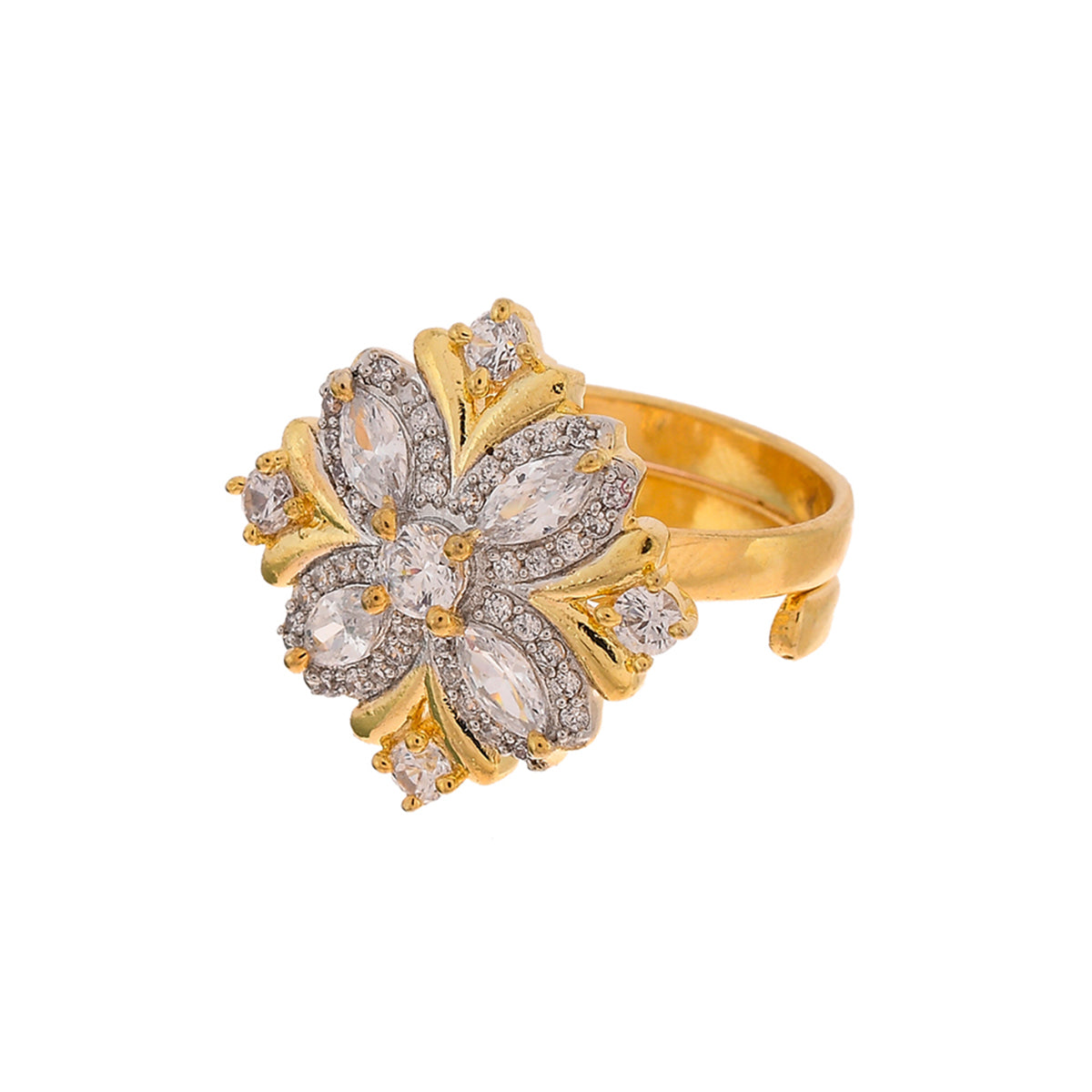 Classic mangalsutra box set with matching earrings and an adjustable finger ring. Made from brass and adorned with clear cubic zirconia gemstones in a cluster setting. Oxidised silver plated and a good match for ethnic looks.