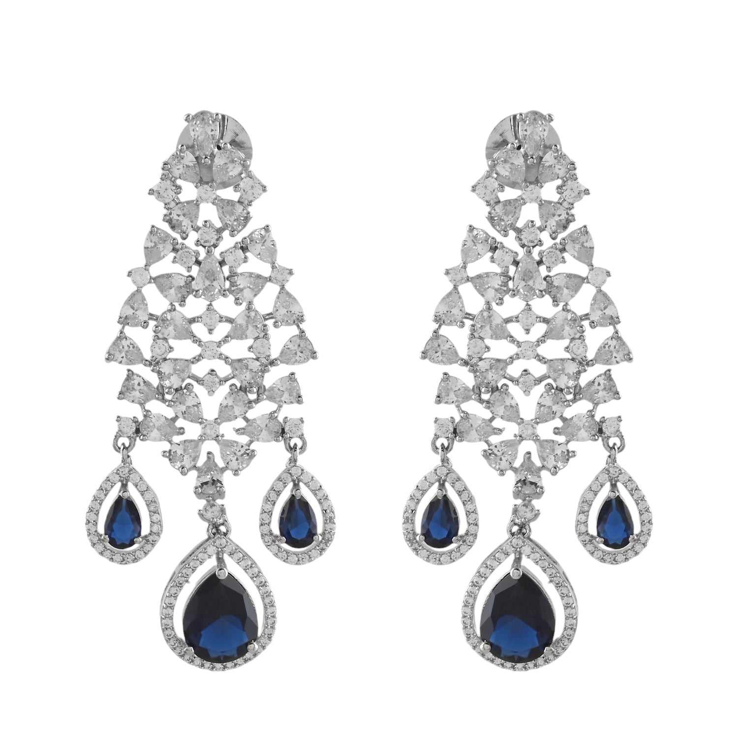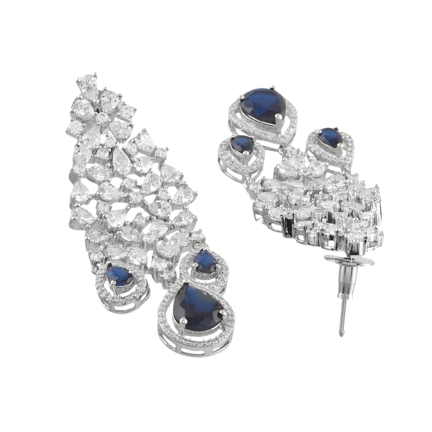 Elevate your festive look with the exquisite Voylla American Diamond Necklace Set, meticulously crafted for women who cherish elegance and sophistication. This stunning set, perfect for Navratri, Diwali, Durga Puja, Rakhi, and other festive celebrations, features a luxurious necklace and matching earrings. The necklace is adorned with shimmering cubic zirconia stones, set in a high-quality brass base with a rhodium plating that ensures lasting shine and durability. The intricate design showcases a beautiful arrangement of sparkling stones, culminating in a striking blue teardrop centerpiece that adds a touch of regal charm. The matching earrings mirror the necklace's design, creating a harmonious and elegant ensemble. This set is an ideal gift for your wife, sister, girlfriend, mother, or friend, making it a perfect choice for any festive occasion. Celebrate the joy of the season with the Voylla American Diamond Necklace Set, a timeless addition to any jewelry collection.