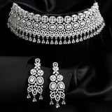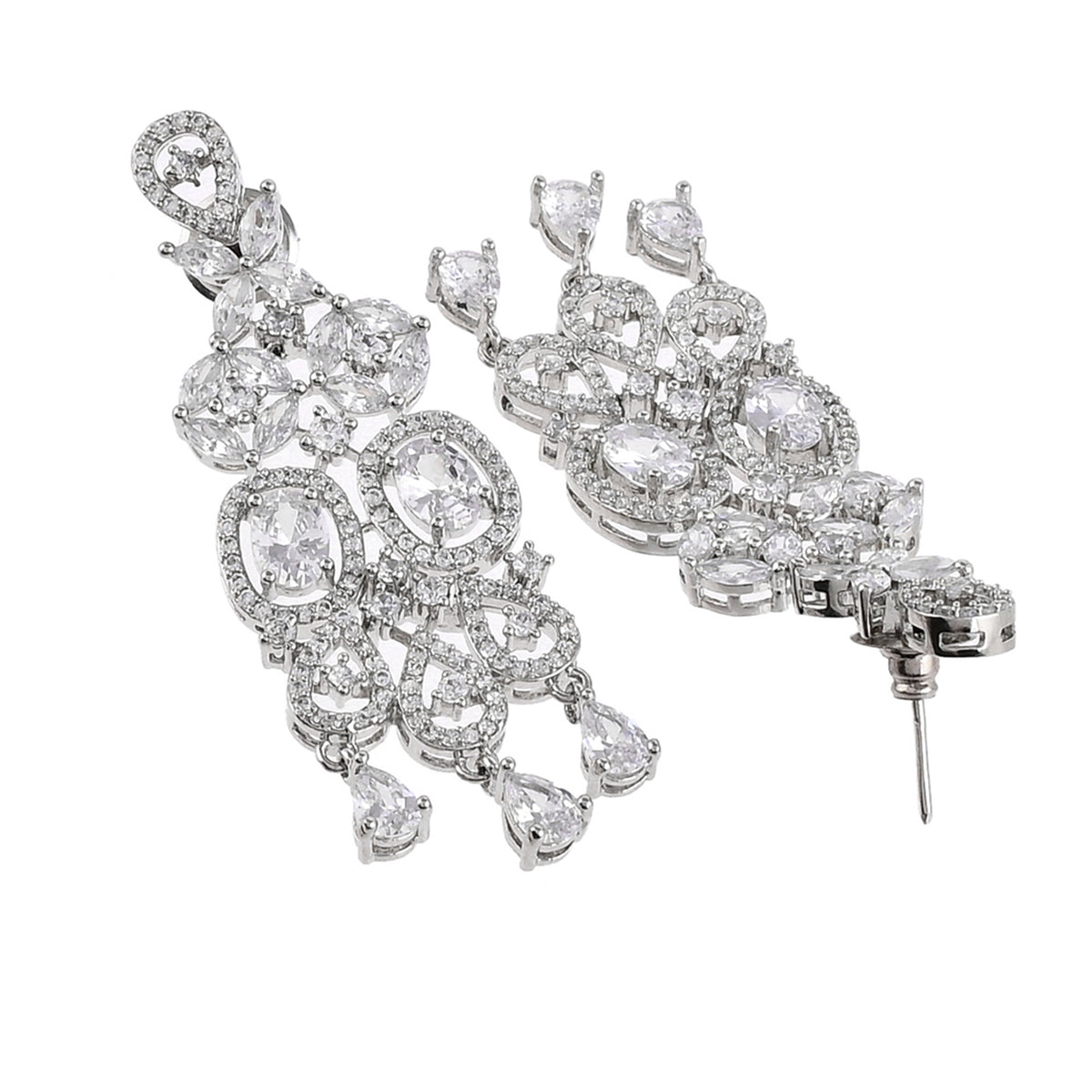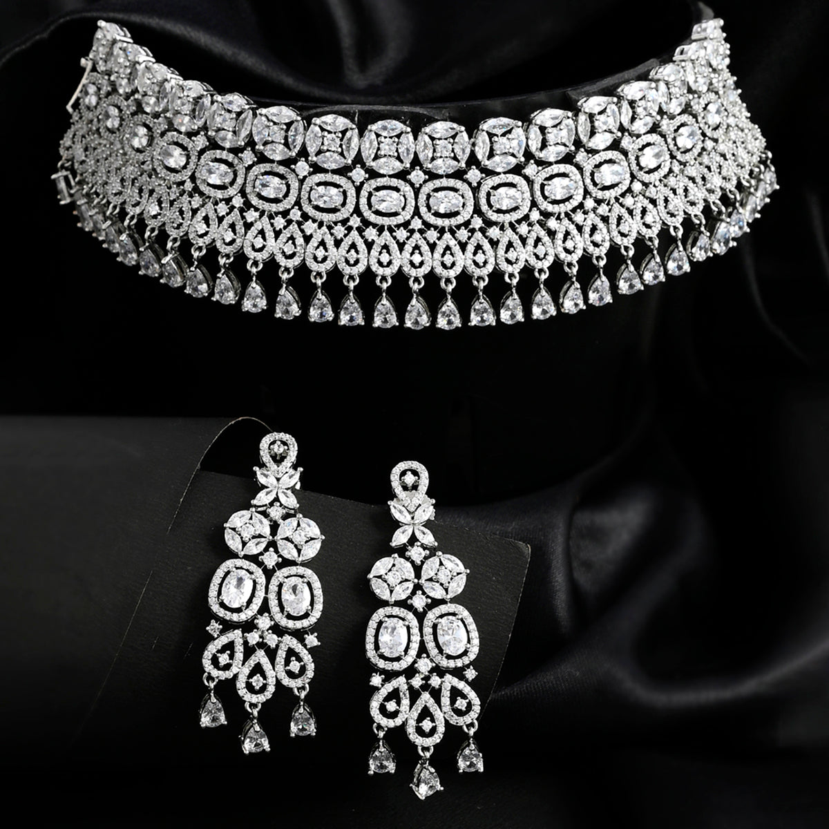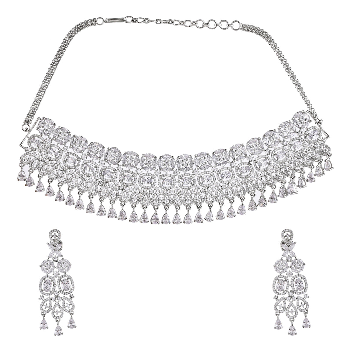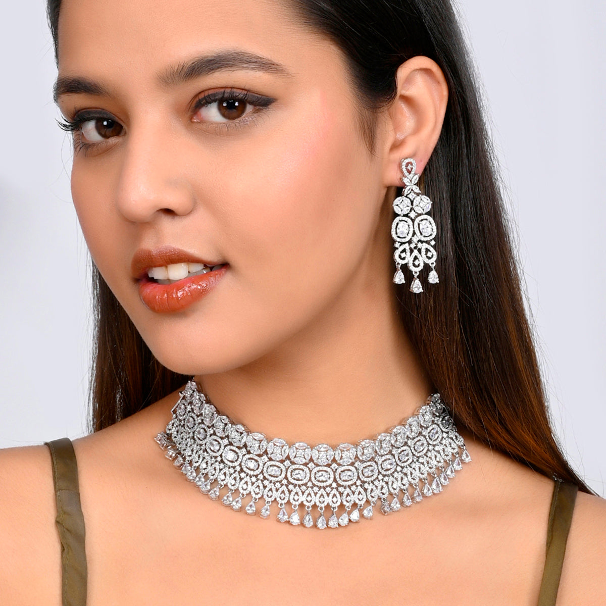 Heavily embellished zirconia gemstones jewellery set made from brass. Silver plating adds to the grace of this set, which will look splendid when paired with formal attire.