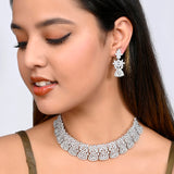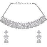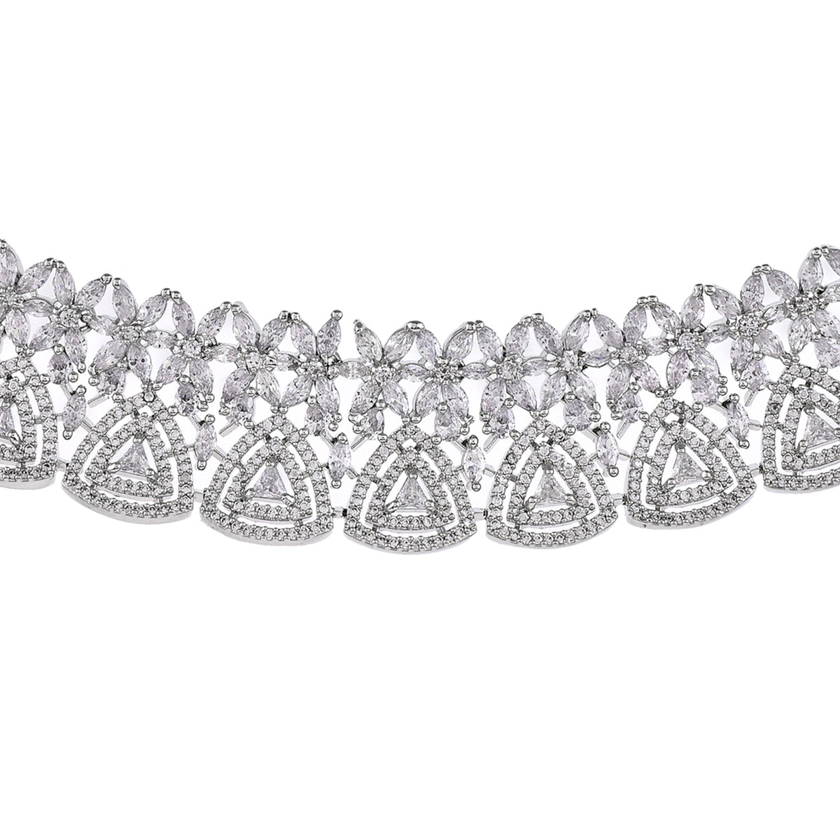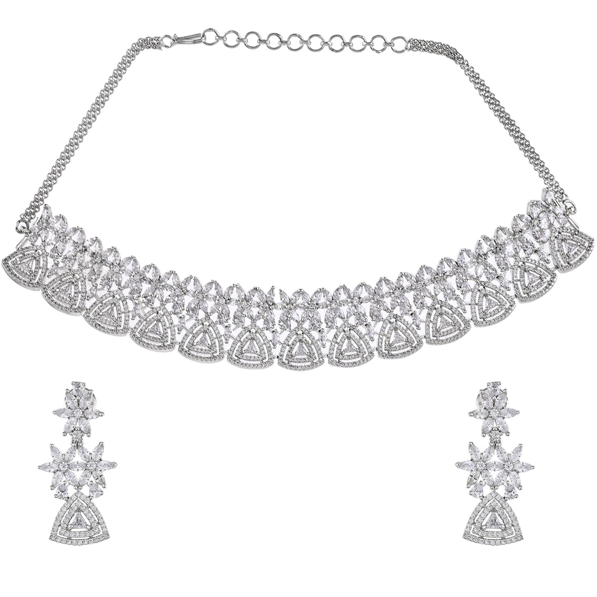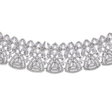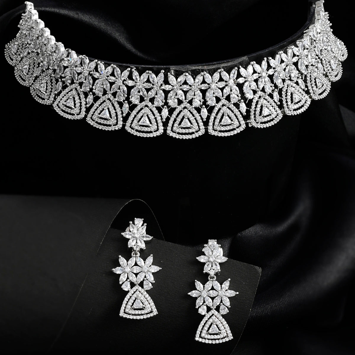 Triangles zircons adorned choker jewellery set made from brass. Silver plated for added sparkle. A good match for formal looks of all kinds.