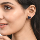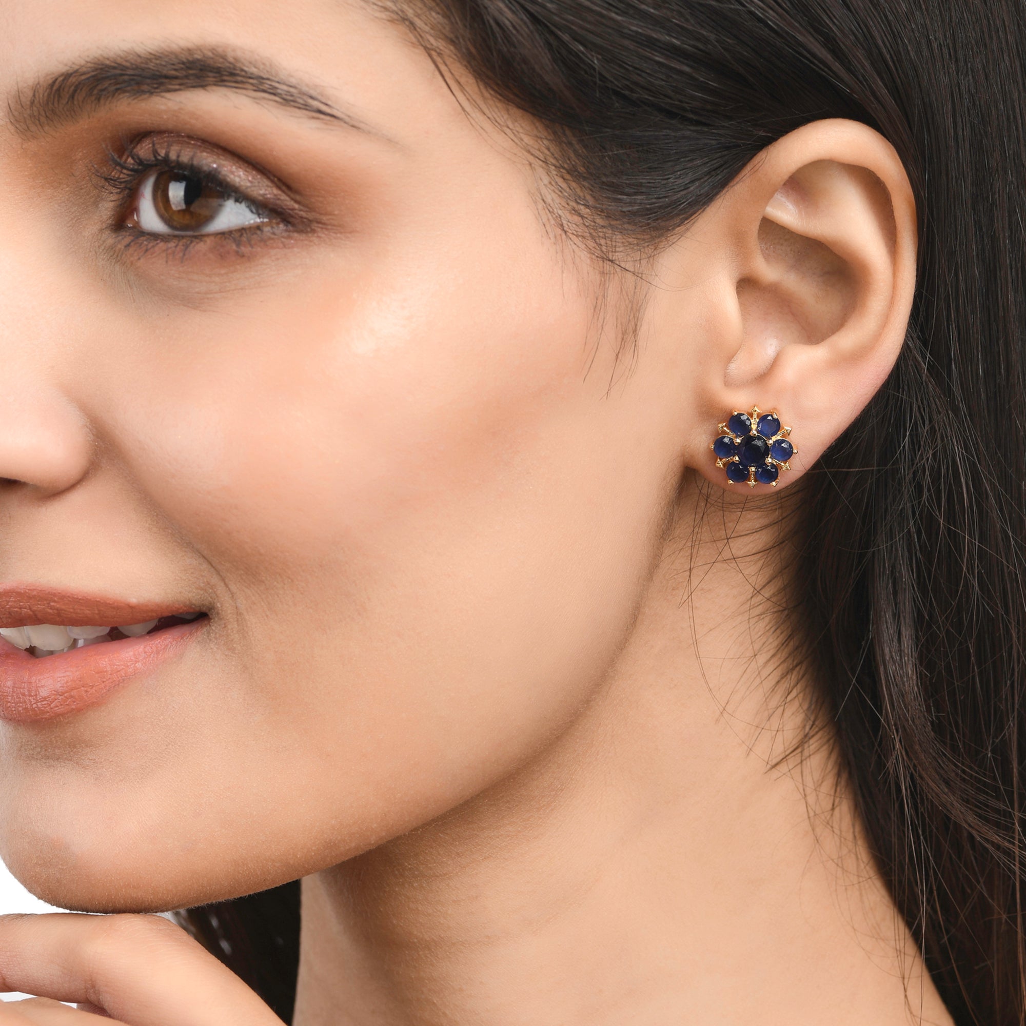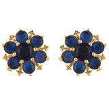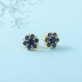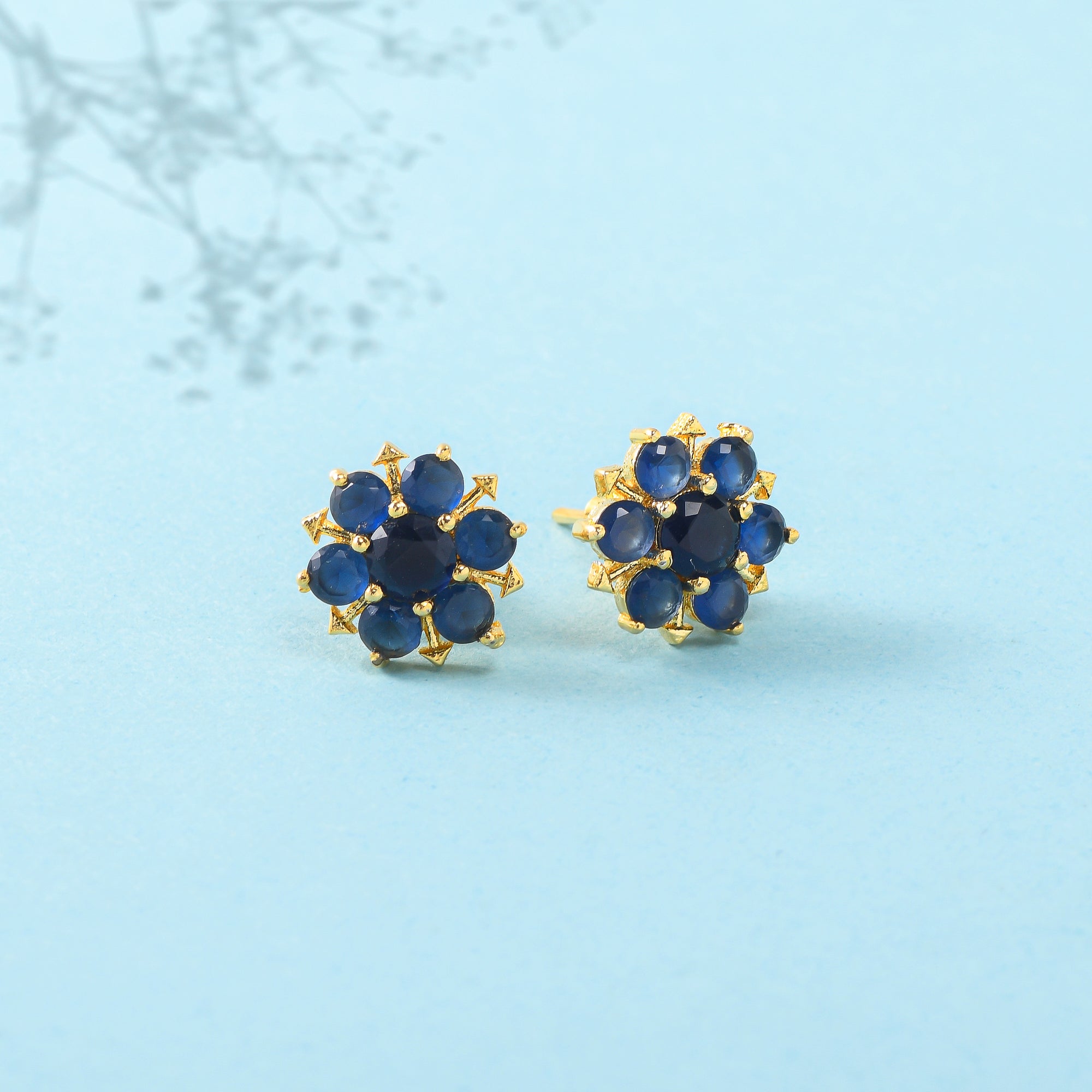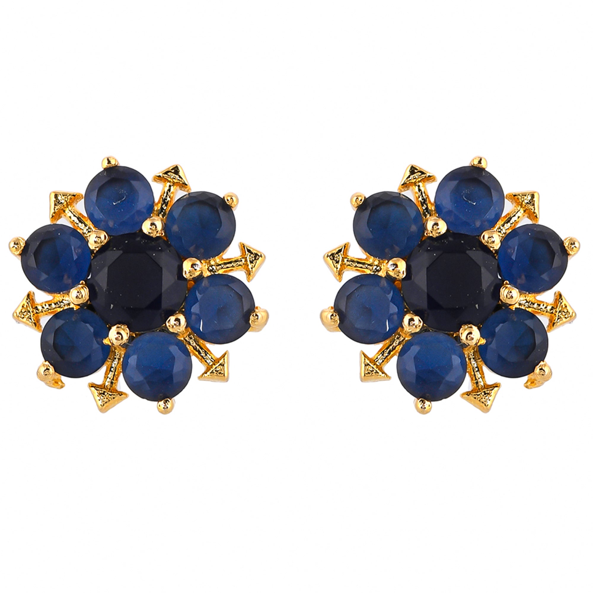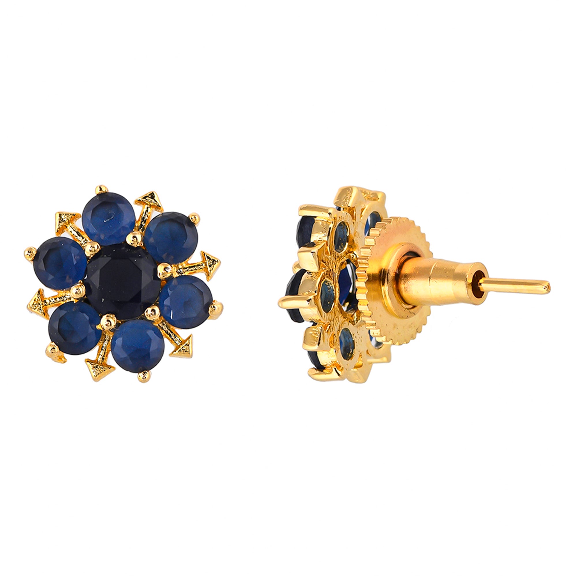 Spokes pattern stud earrings with blue zirconia gems. Gold plated and made from brass. Match for everyday looks.