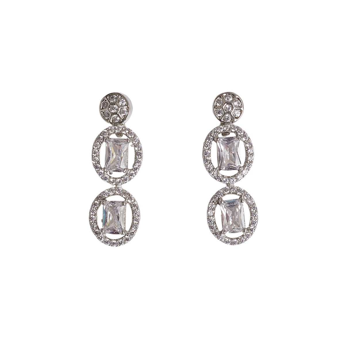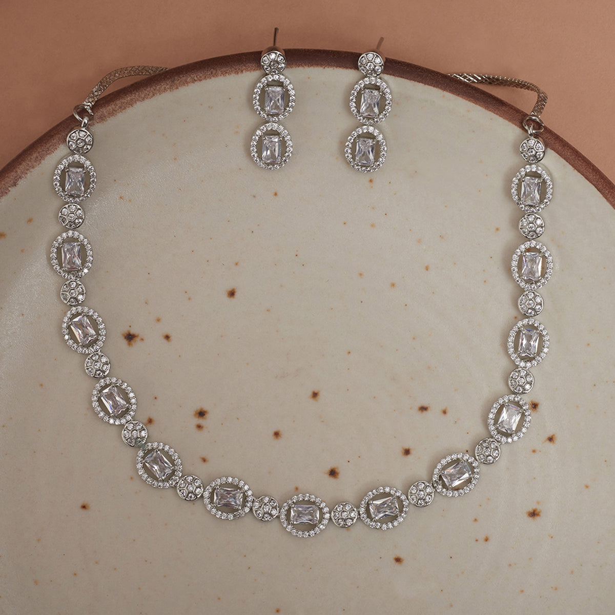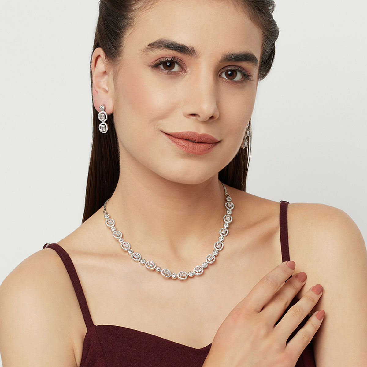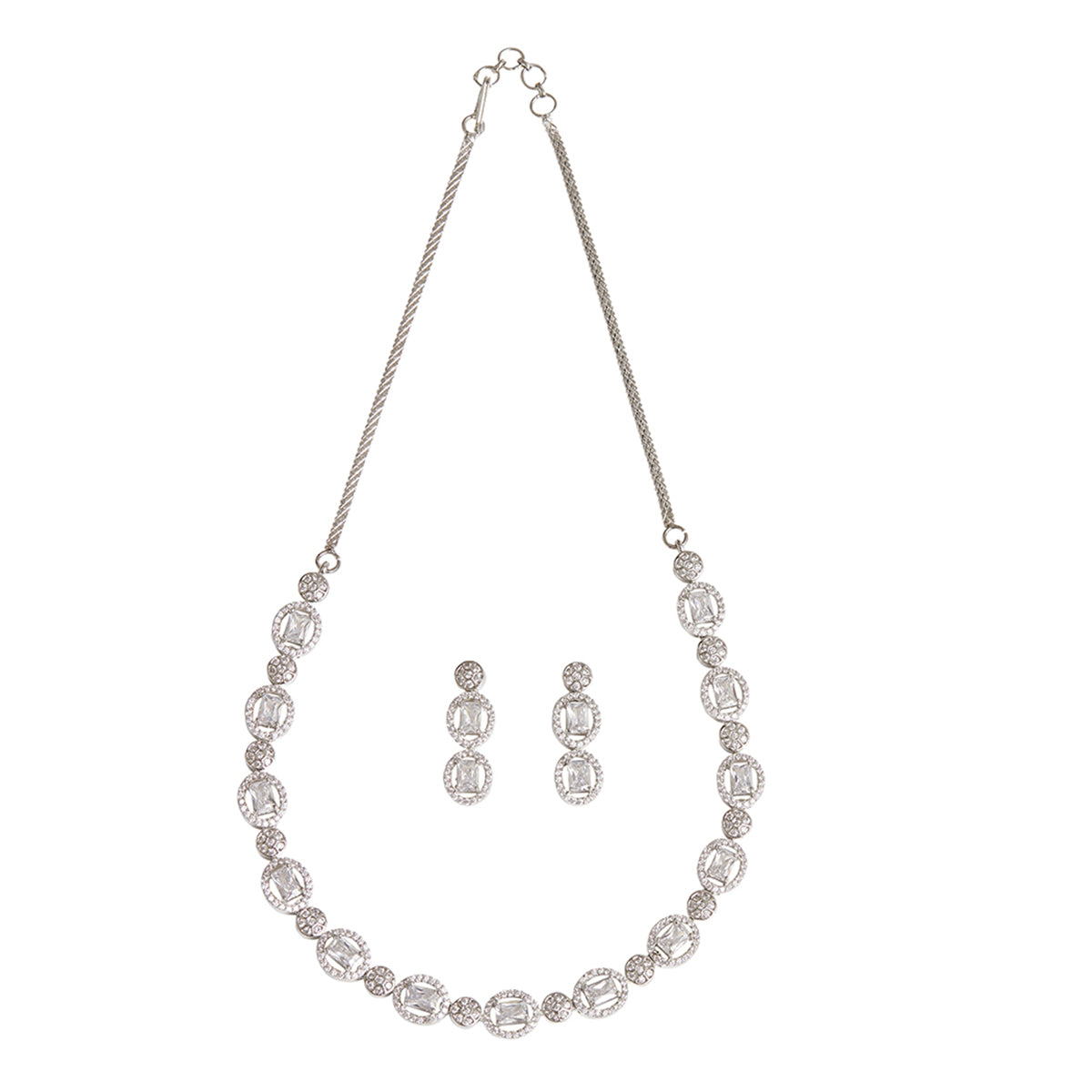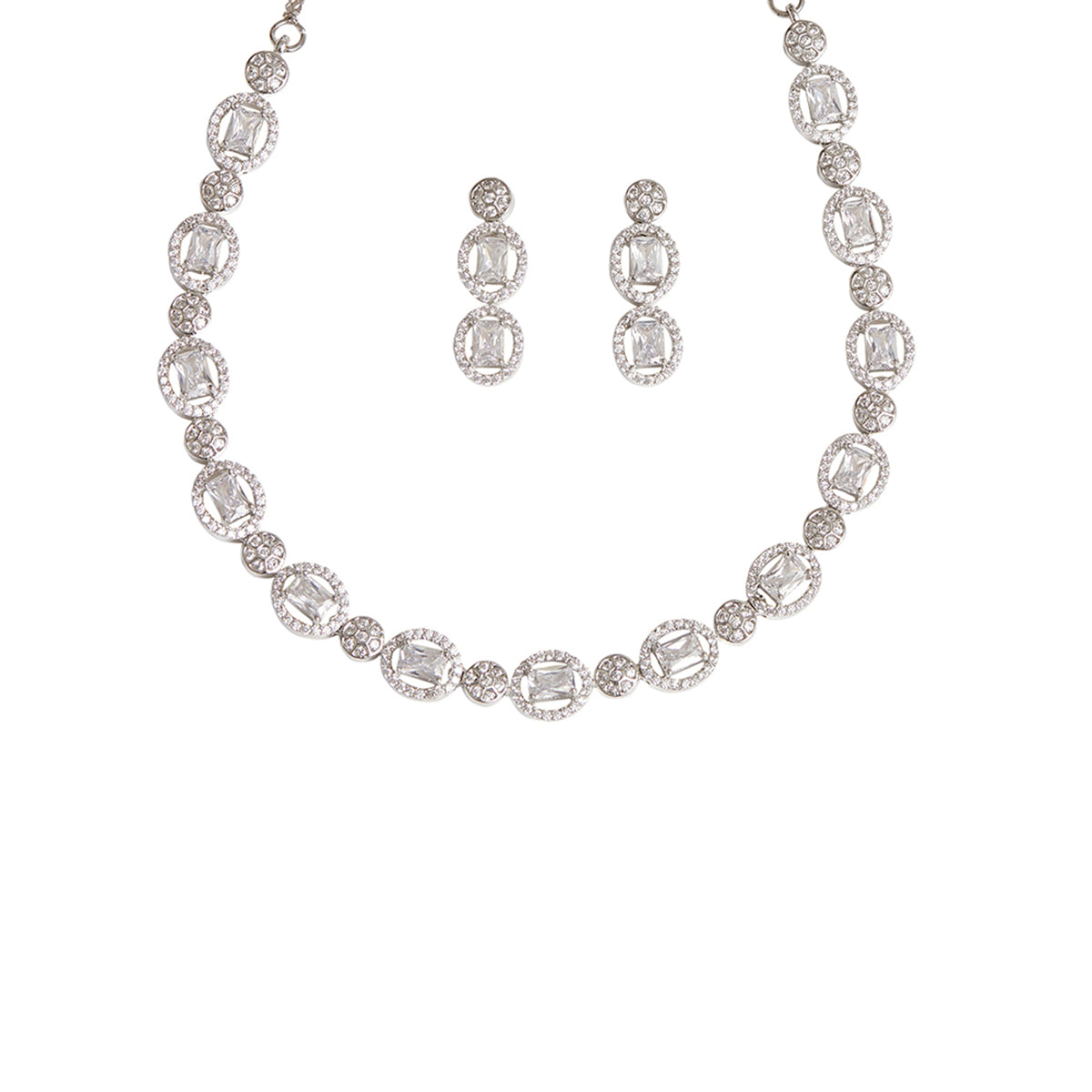An opulent jewellery set, fashioned out of brass and featuring a classic silver plating. Embellished with square cut CZ gemstones in a cushion setting, the necklace and matching drop earrings will make a splendid addition to your jewellery box. Pair the set with any of your favourite formal outfits.