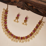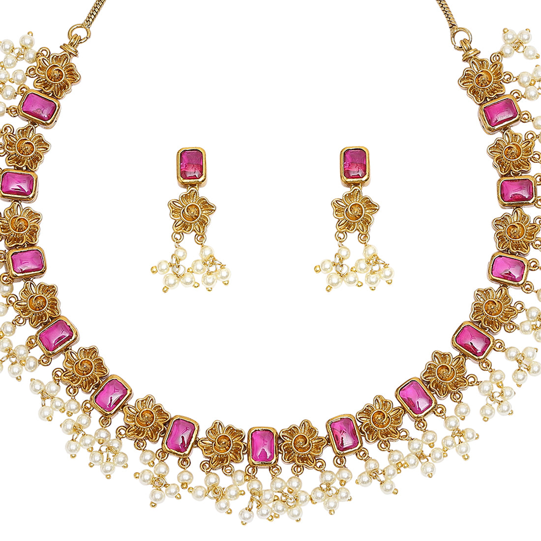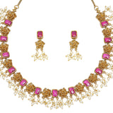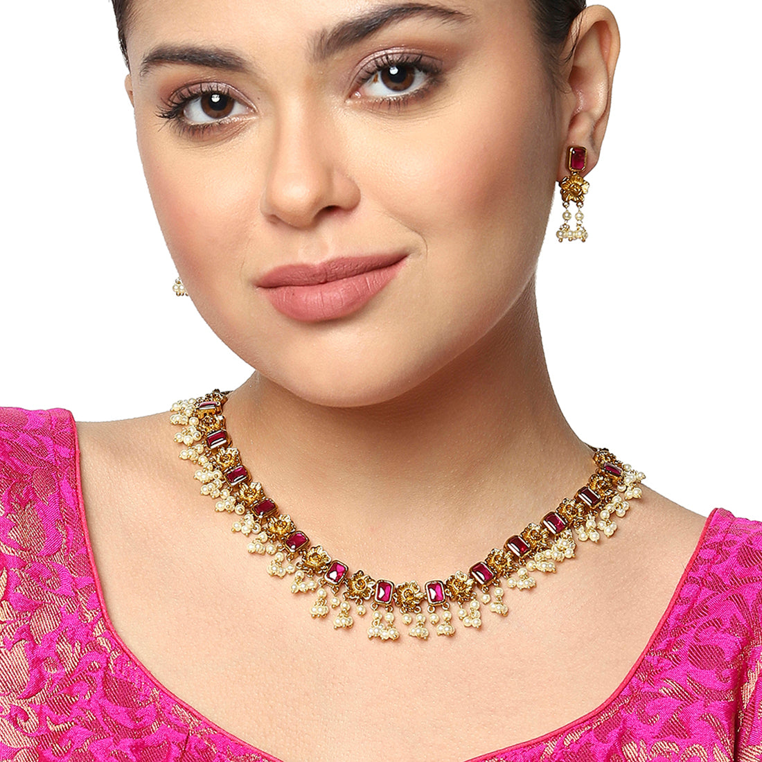 Embellished with square cut zircon gems and faux white pearls, this jewellery set has been fashioned out of quality brass. Yellow gold plating adds to the opulence of the necklace and matching earrings, which are lightweight and comfortable. Pair with a silk saree or formal lehenga.