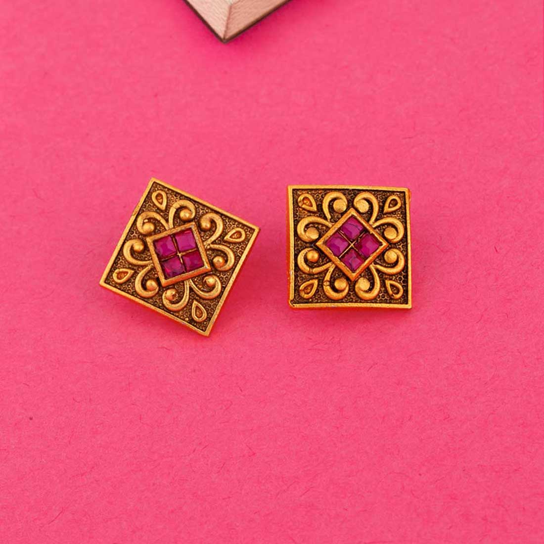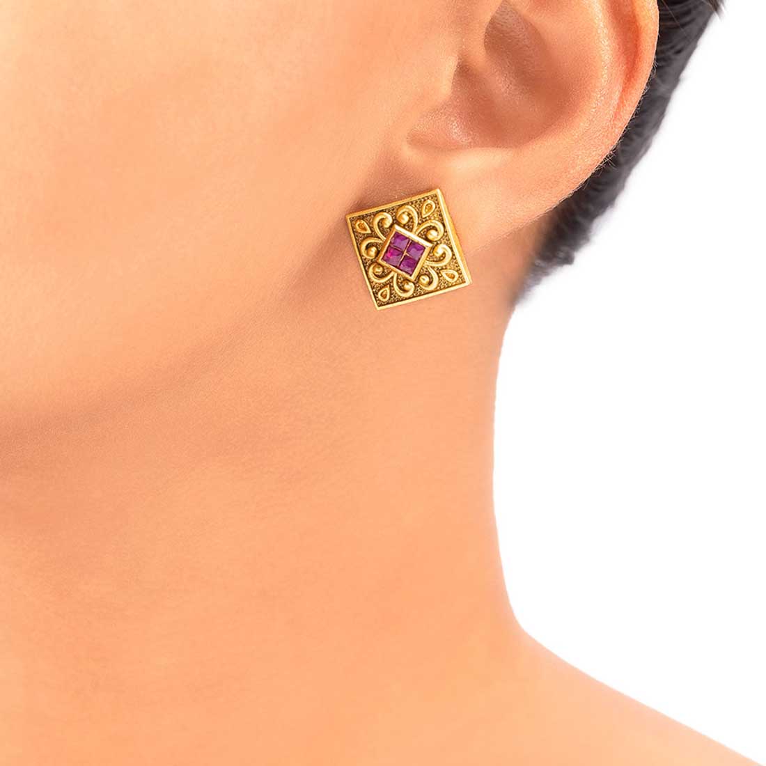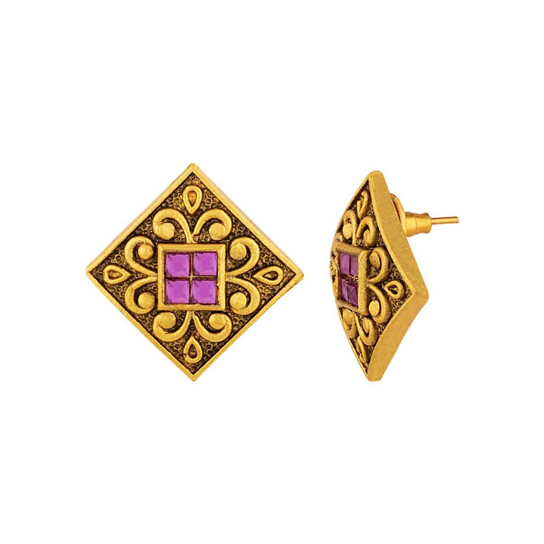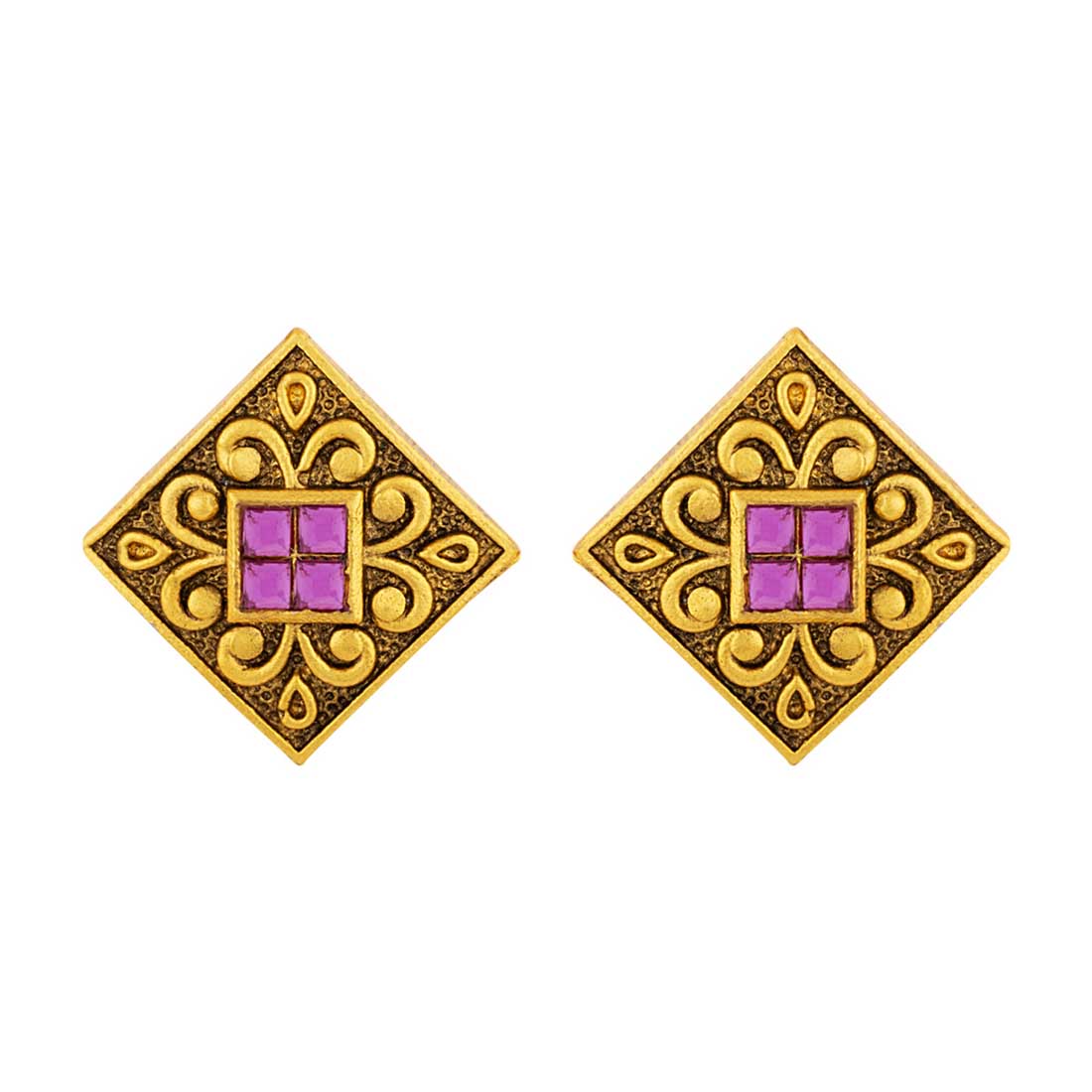 Square cut gemstone adorned brass stud earrings. Yellow gold plated and good for casual looks. This piece of jewelry comes with the Voylla assurance of quality and durability.