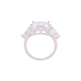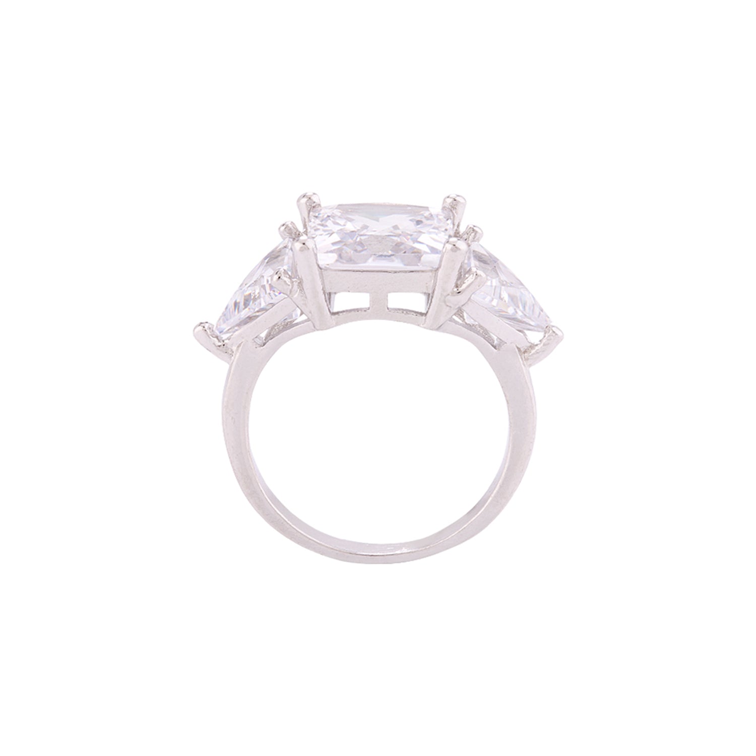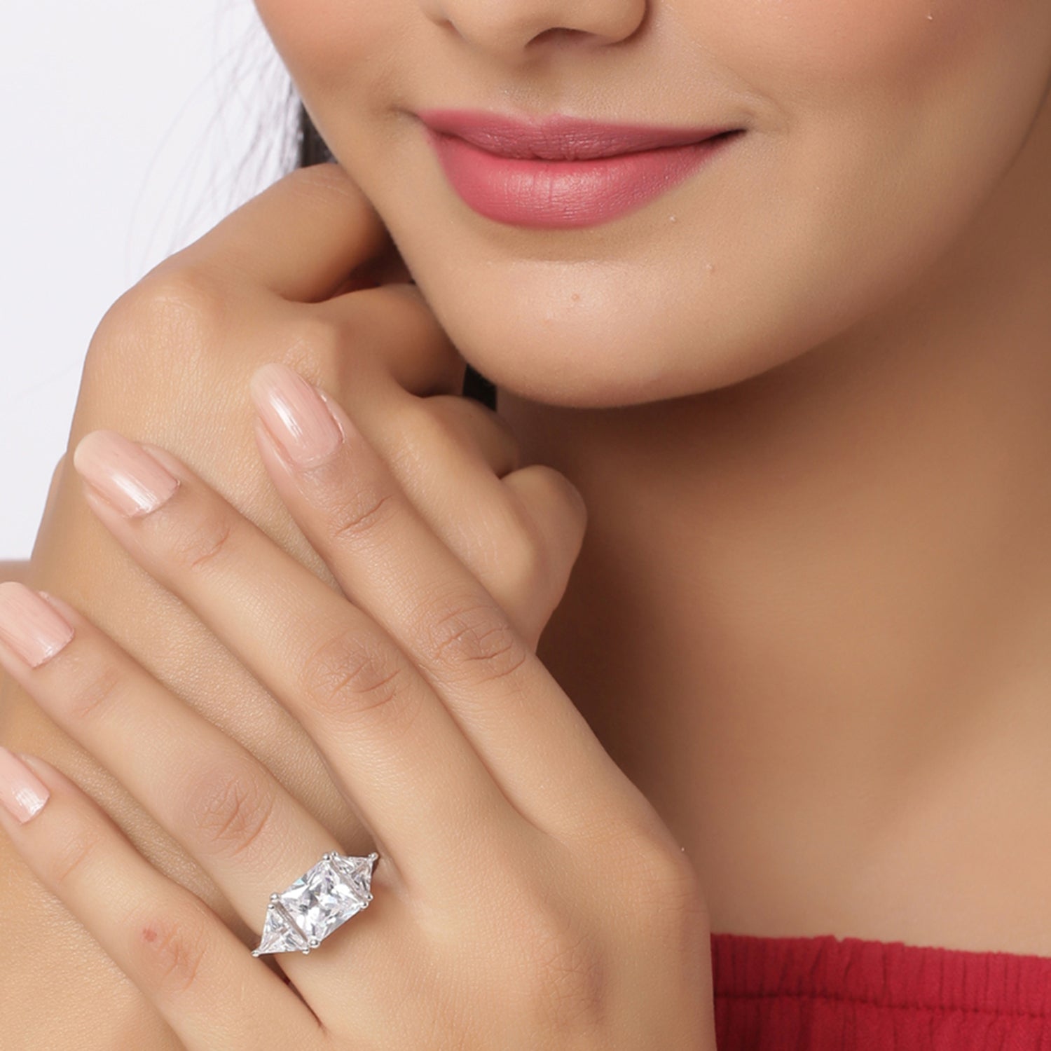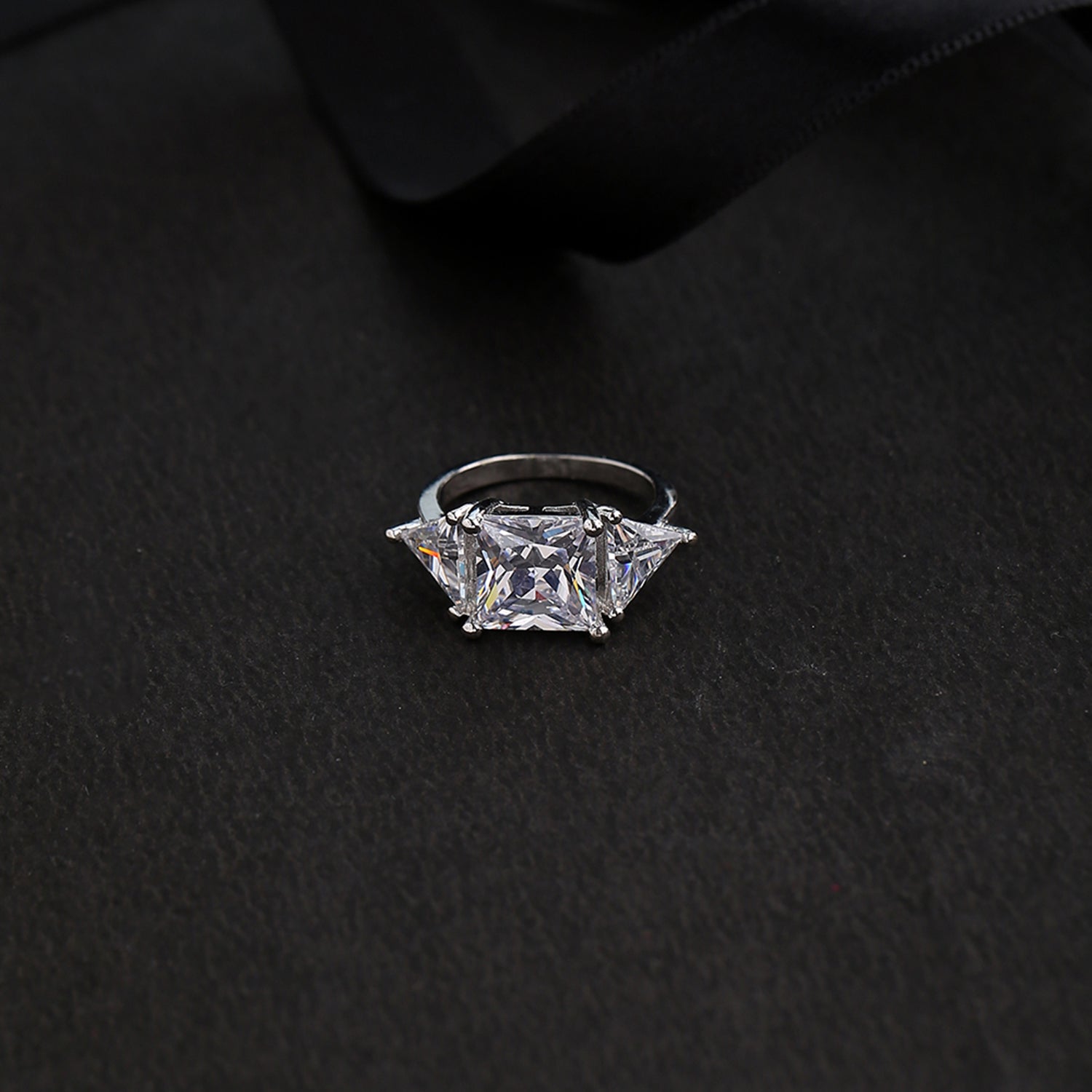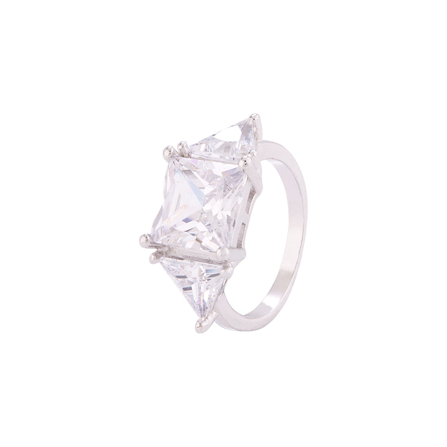 Women's brass ring adorned with a square cut zircon gemstone. Silver plated and can be paired with casual and formal looks.