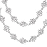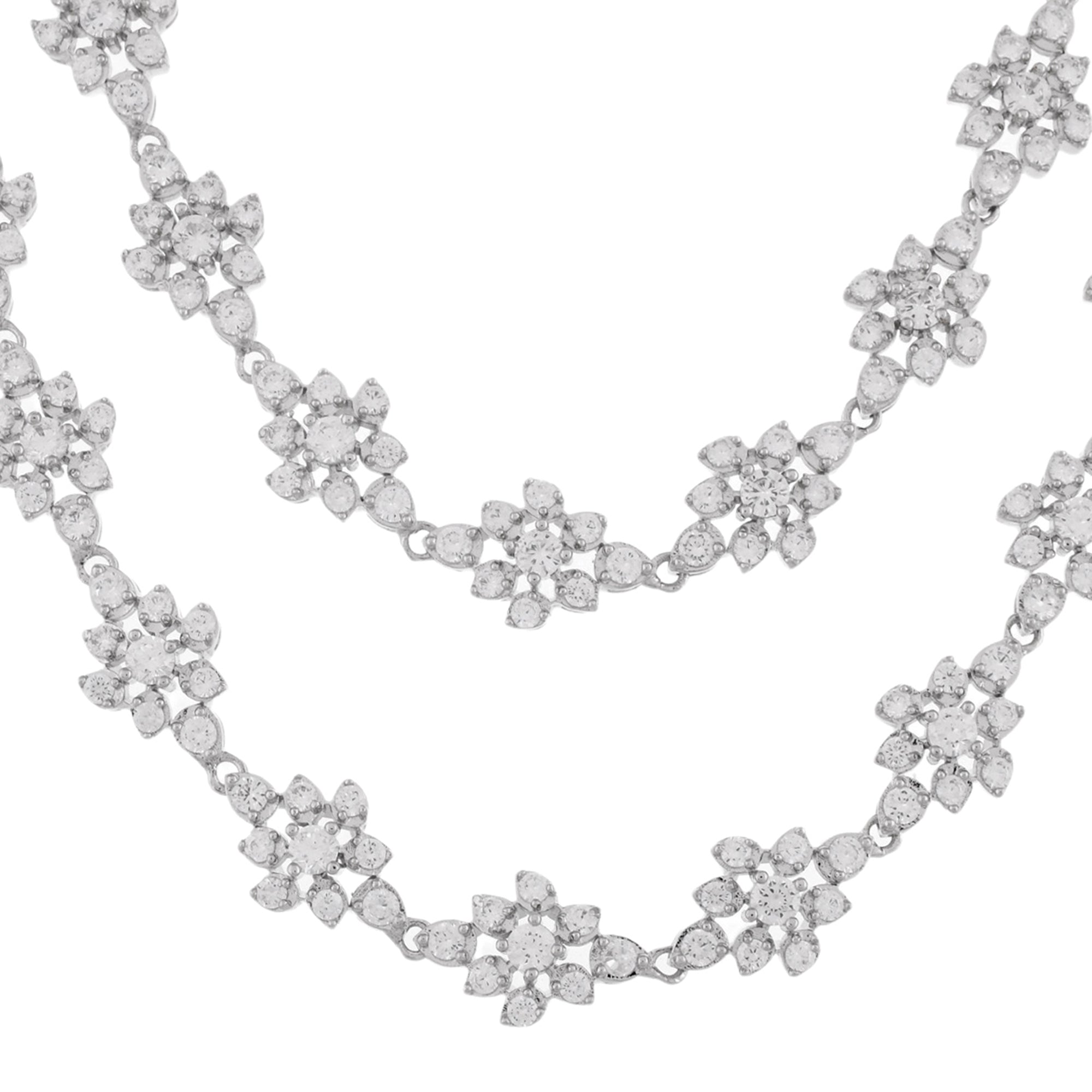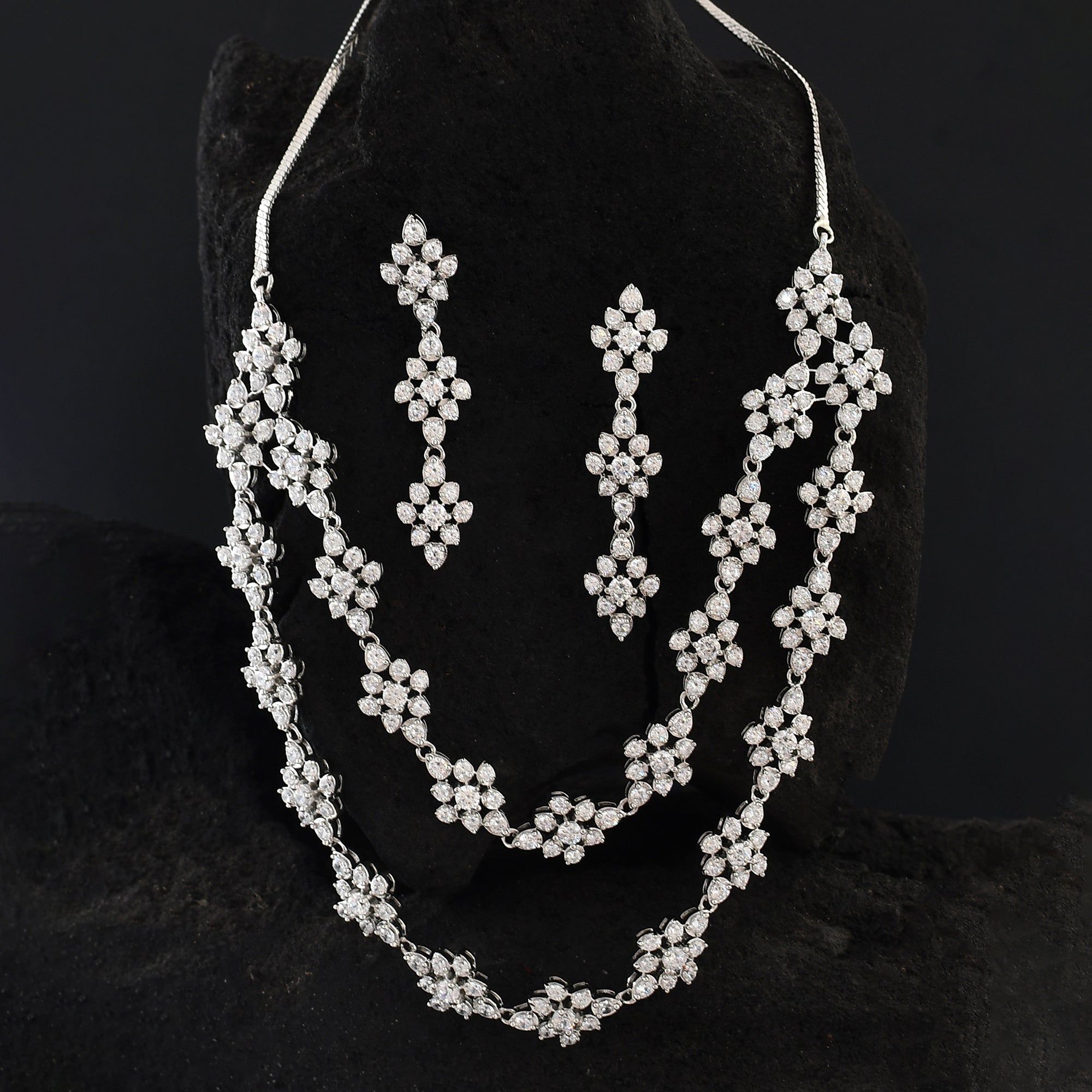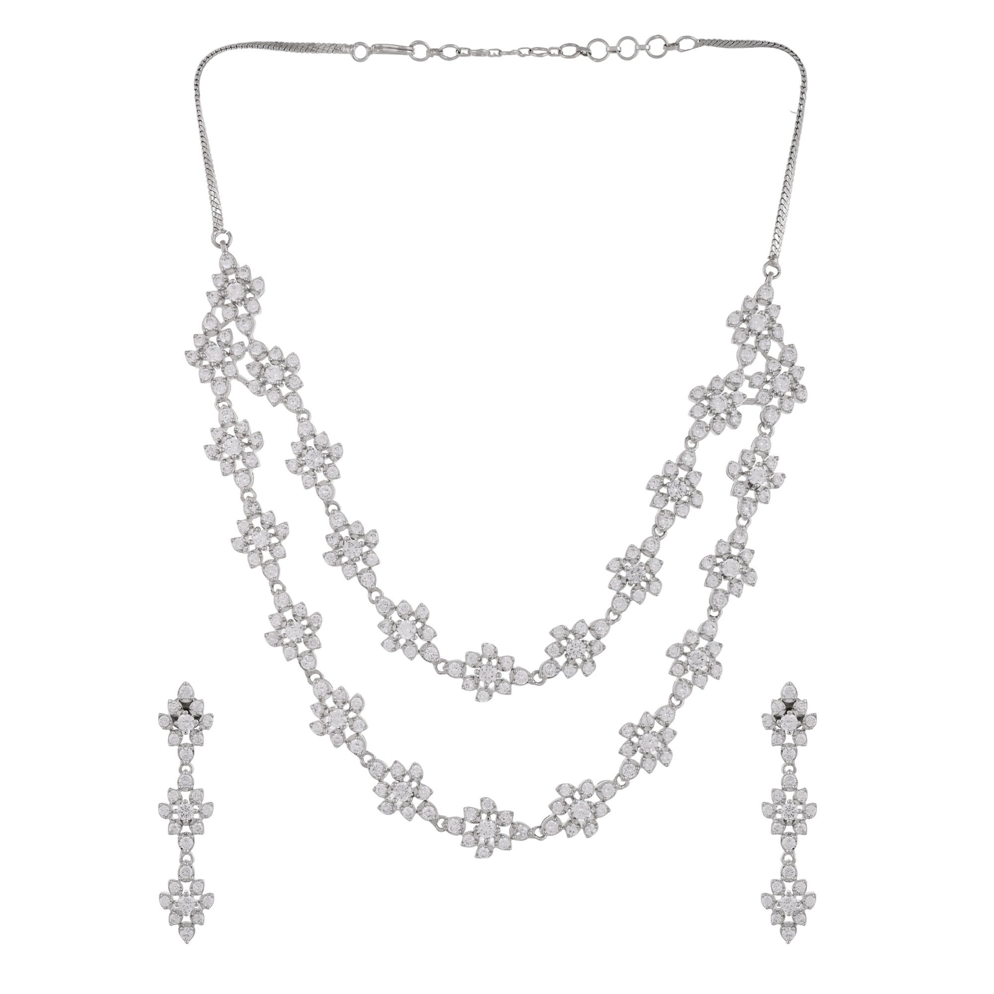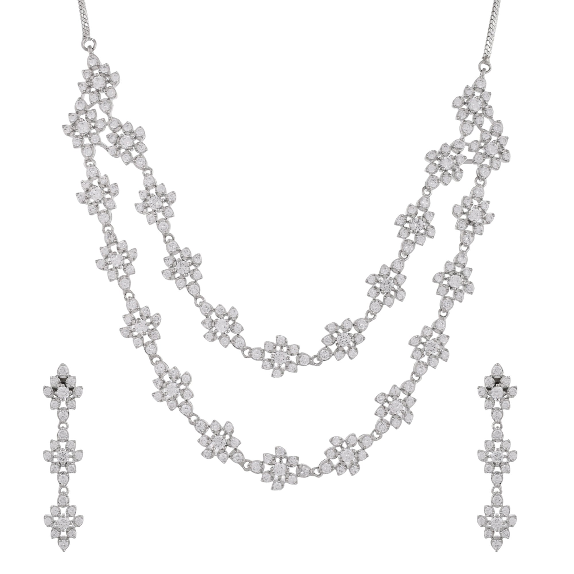 Two strand necklace and drop earrings jewellery set encrusted with round cut zirconia gemstones in a classic cluster setting. Made from brass and white rhodium plating, the charming set can be paired with formal outfits of all kinds,