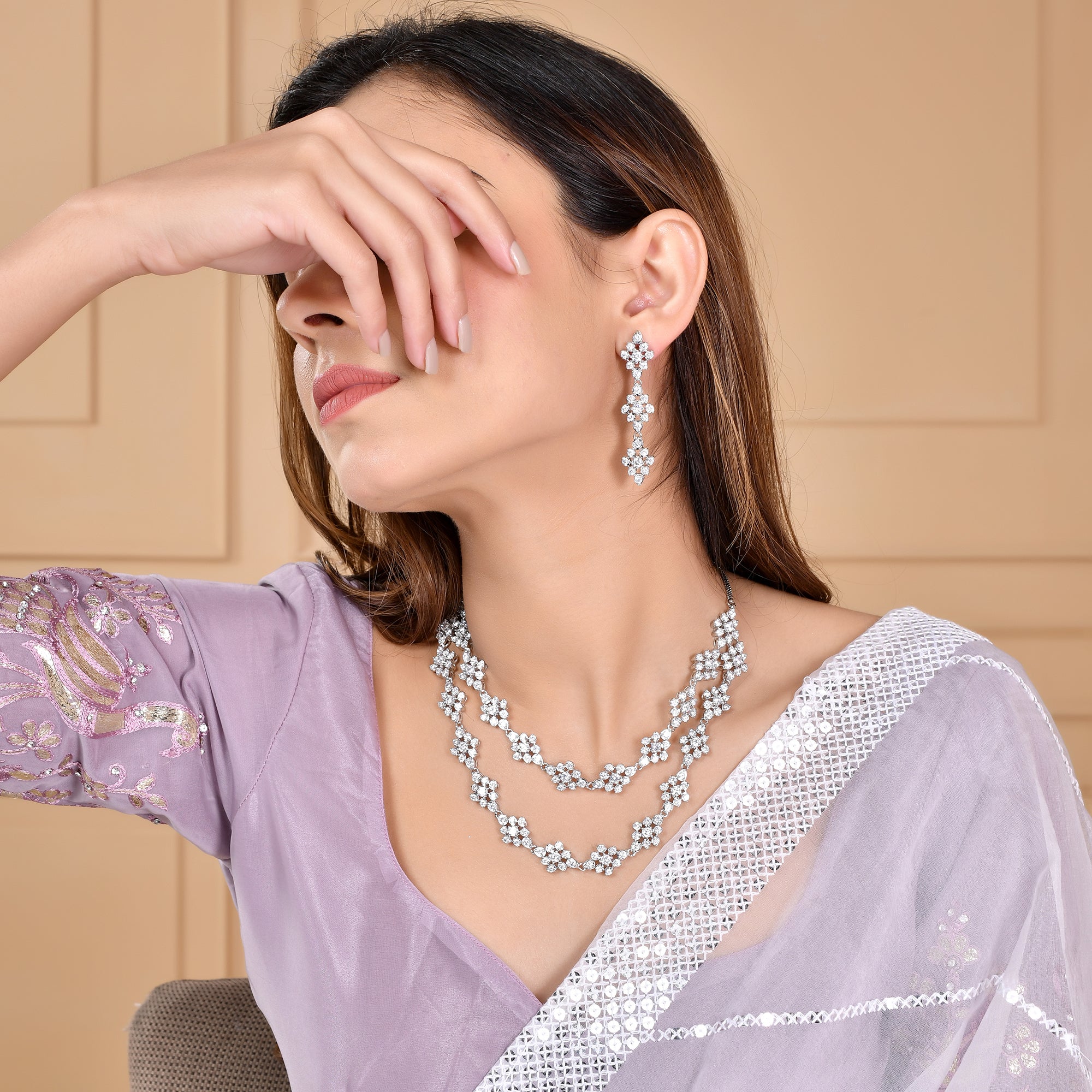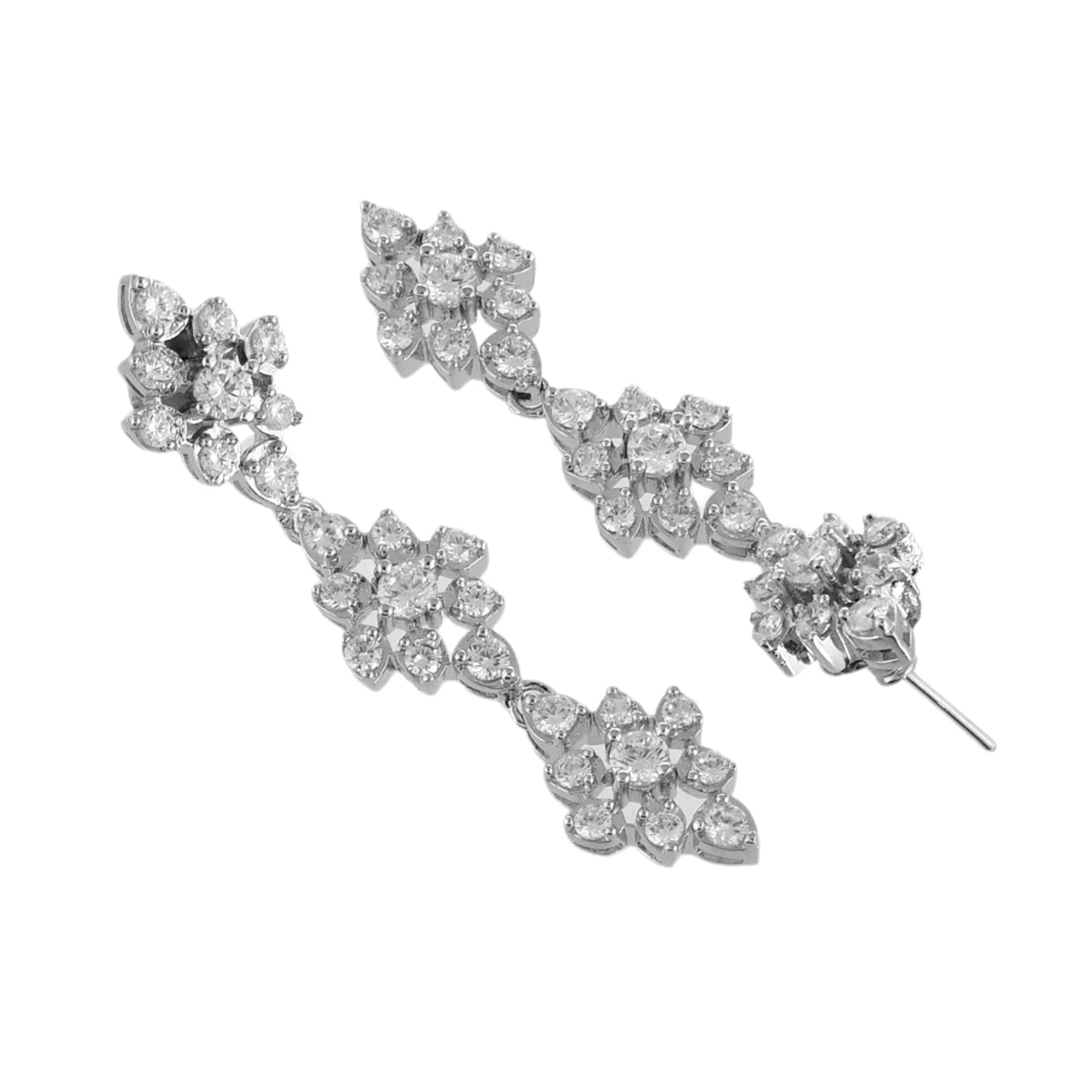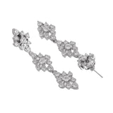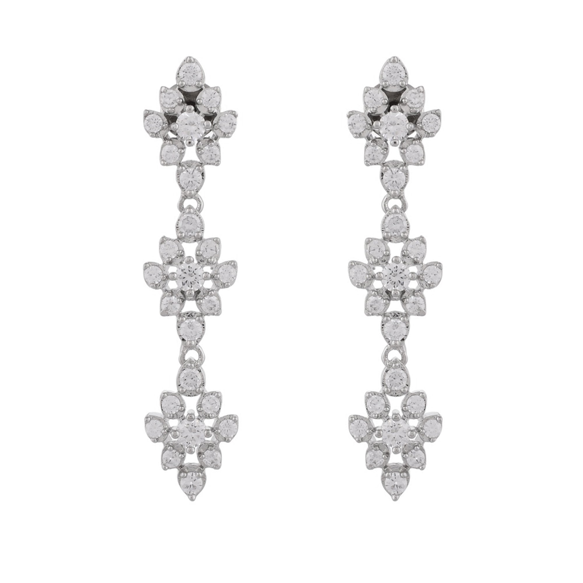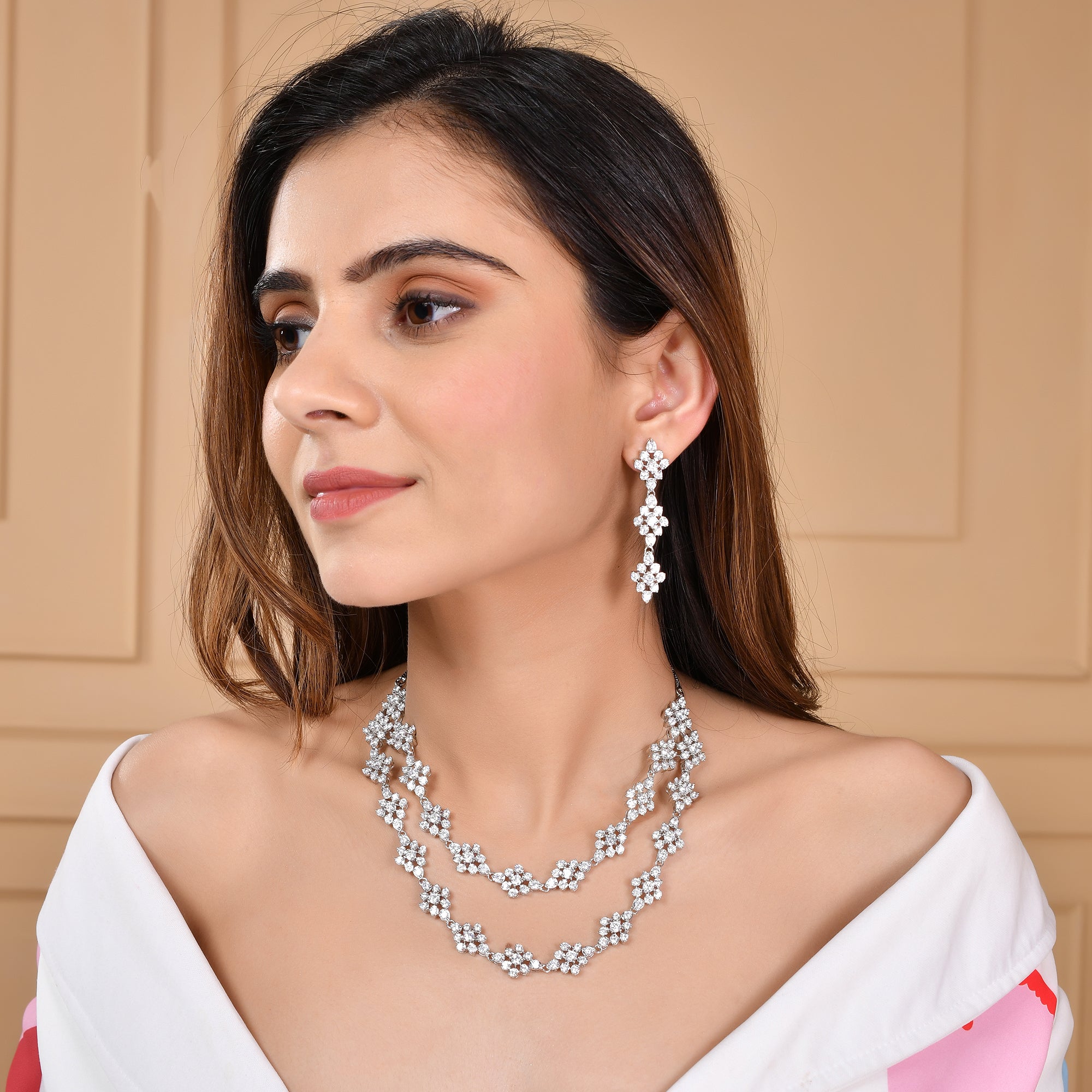 Two strand necklace and drop earrings jewellery set encrusted with round cut zirconia gemstones in a classic cluster setting. Made from brass and white rhodium plating, the charming set can be paired with formal outfits of all kinds,