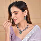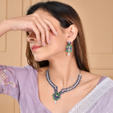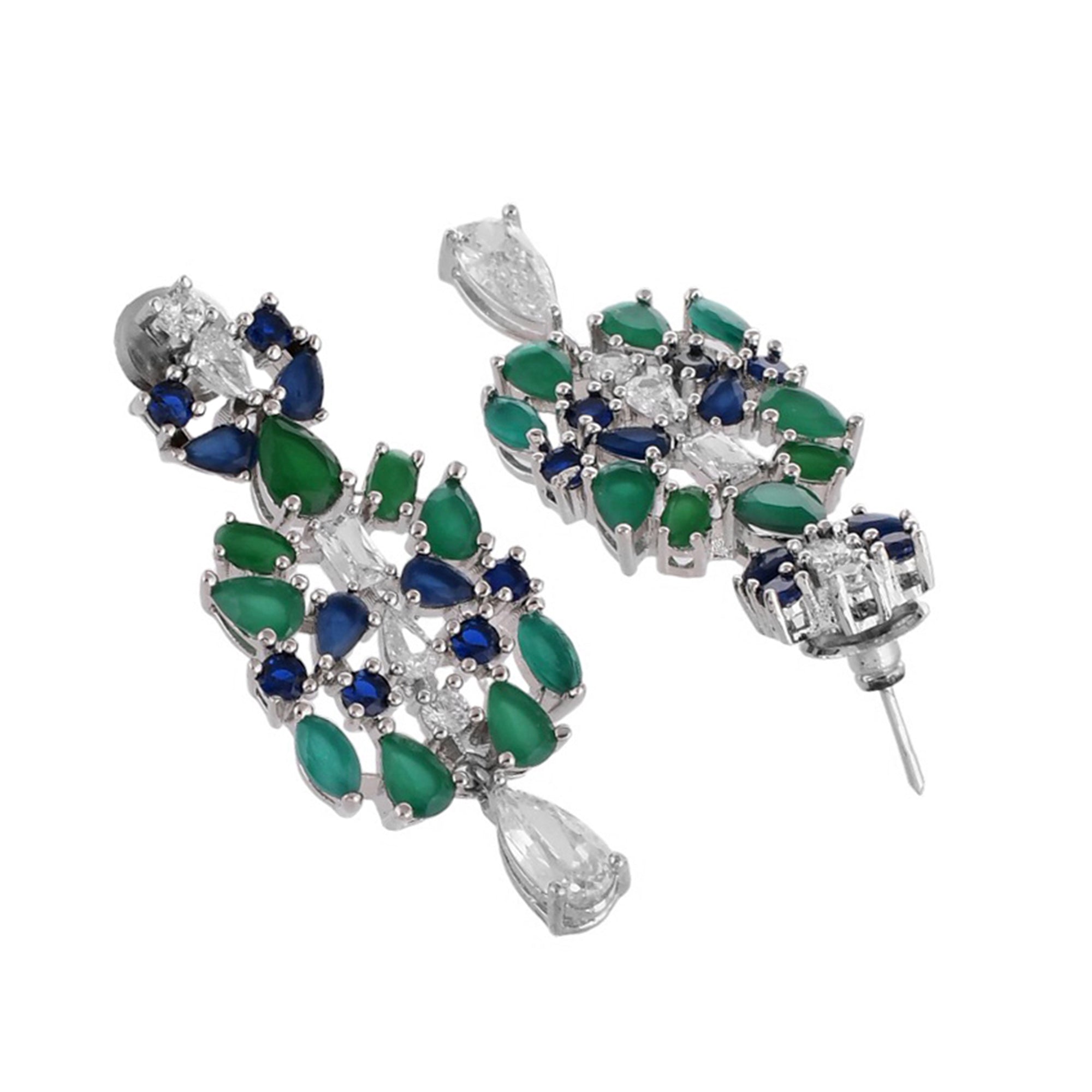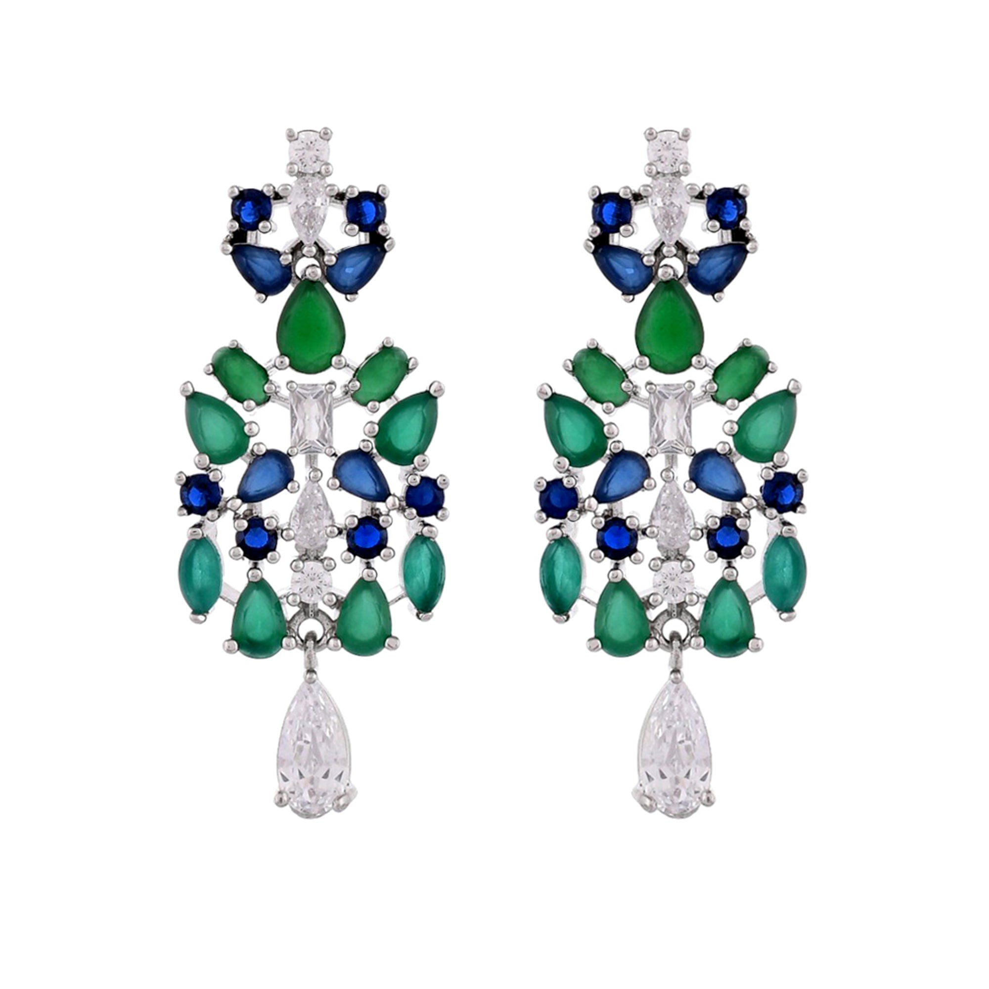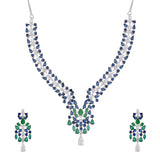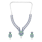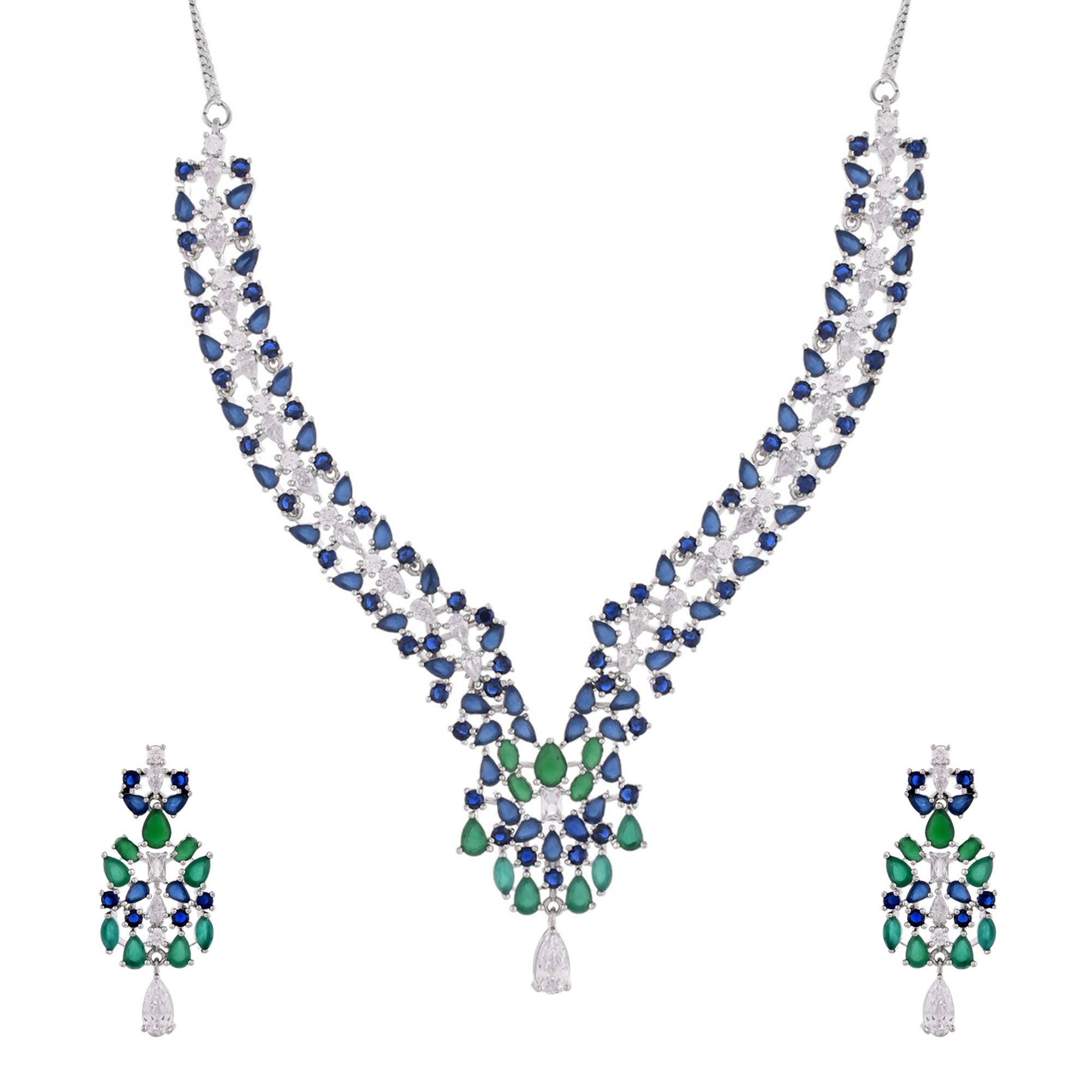 A quirky and colourful necklace set, designed to add a sparkle to all your formal and semi-formal looks. Made from brass and white rhodium plated, the necklace and earrings have been embellished with blue, green and white CZ gems. A perfect match for cocktail dresses.