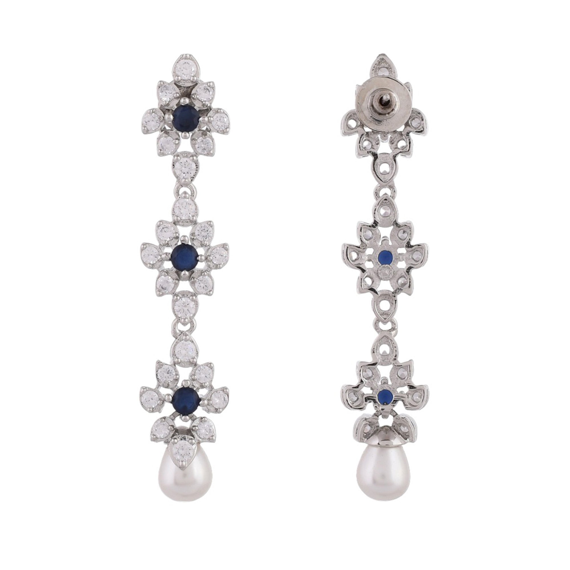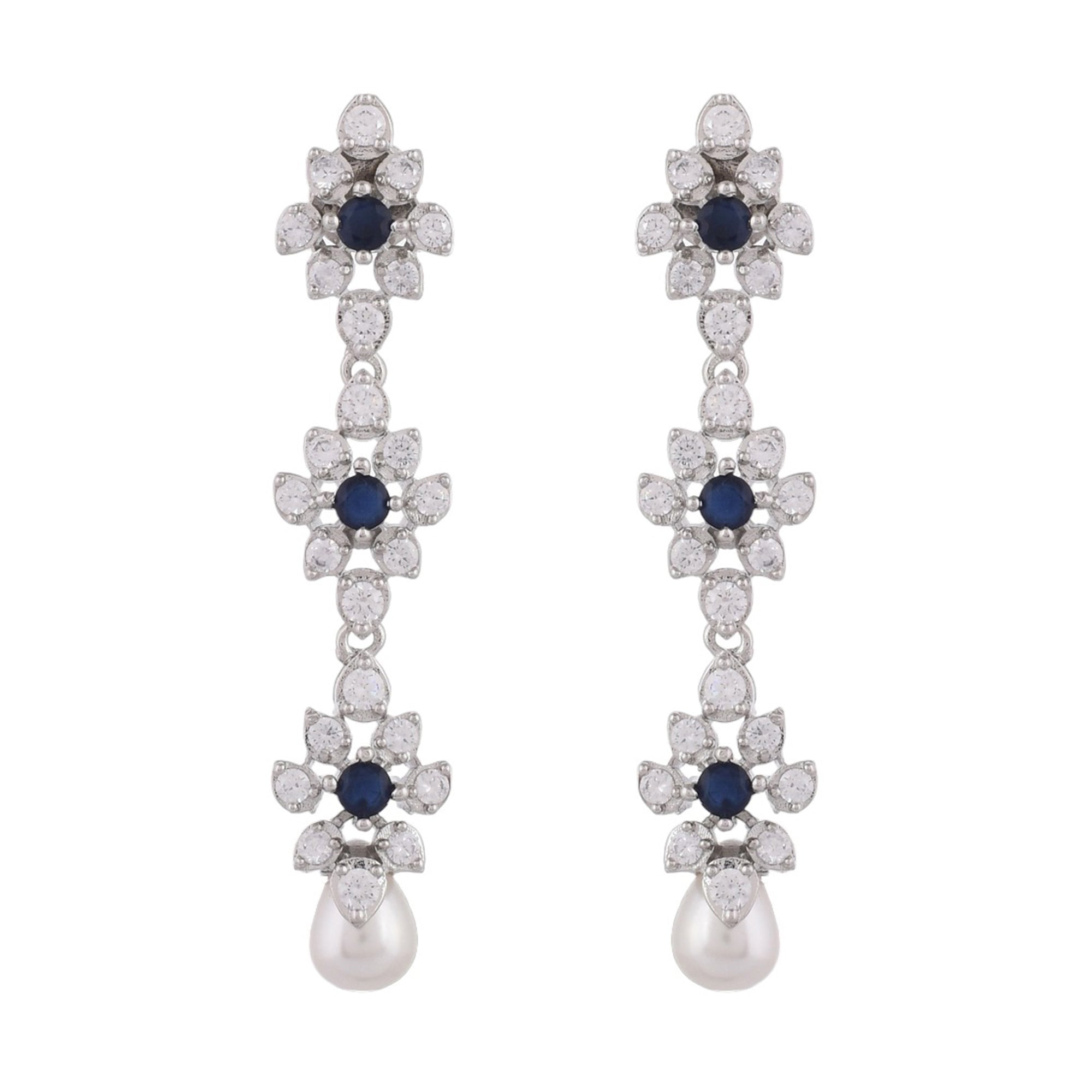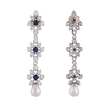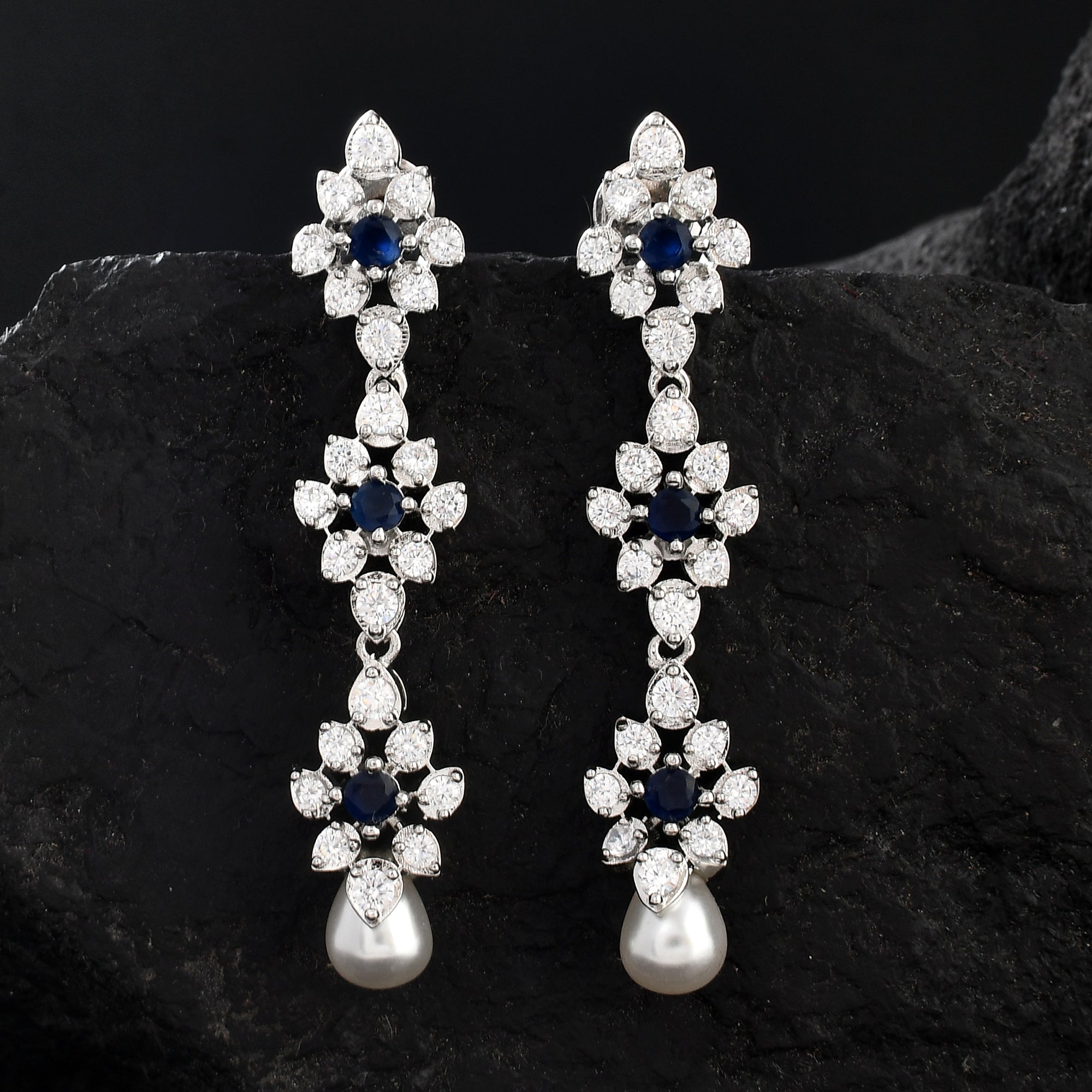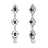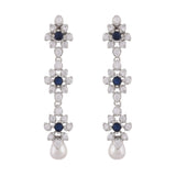 Gorgeous and eye-catching cocktail earrings, made from brass and white rhodium plated. Embellished with blue and white zirconia gemstones and white pearls, the earrings are lightweight and versatile.