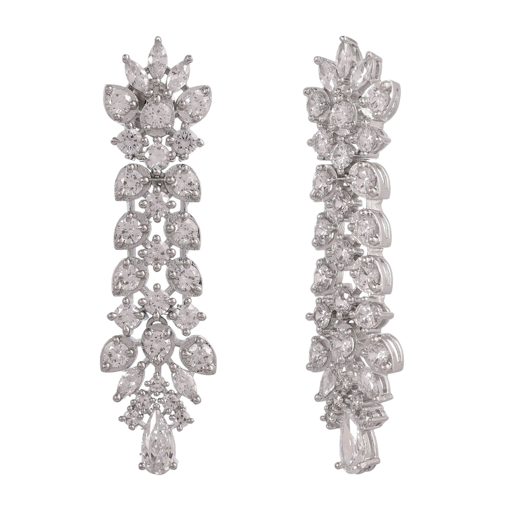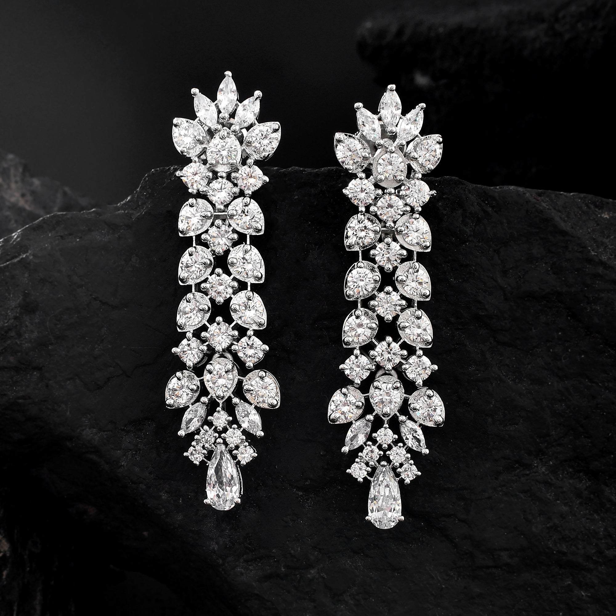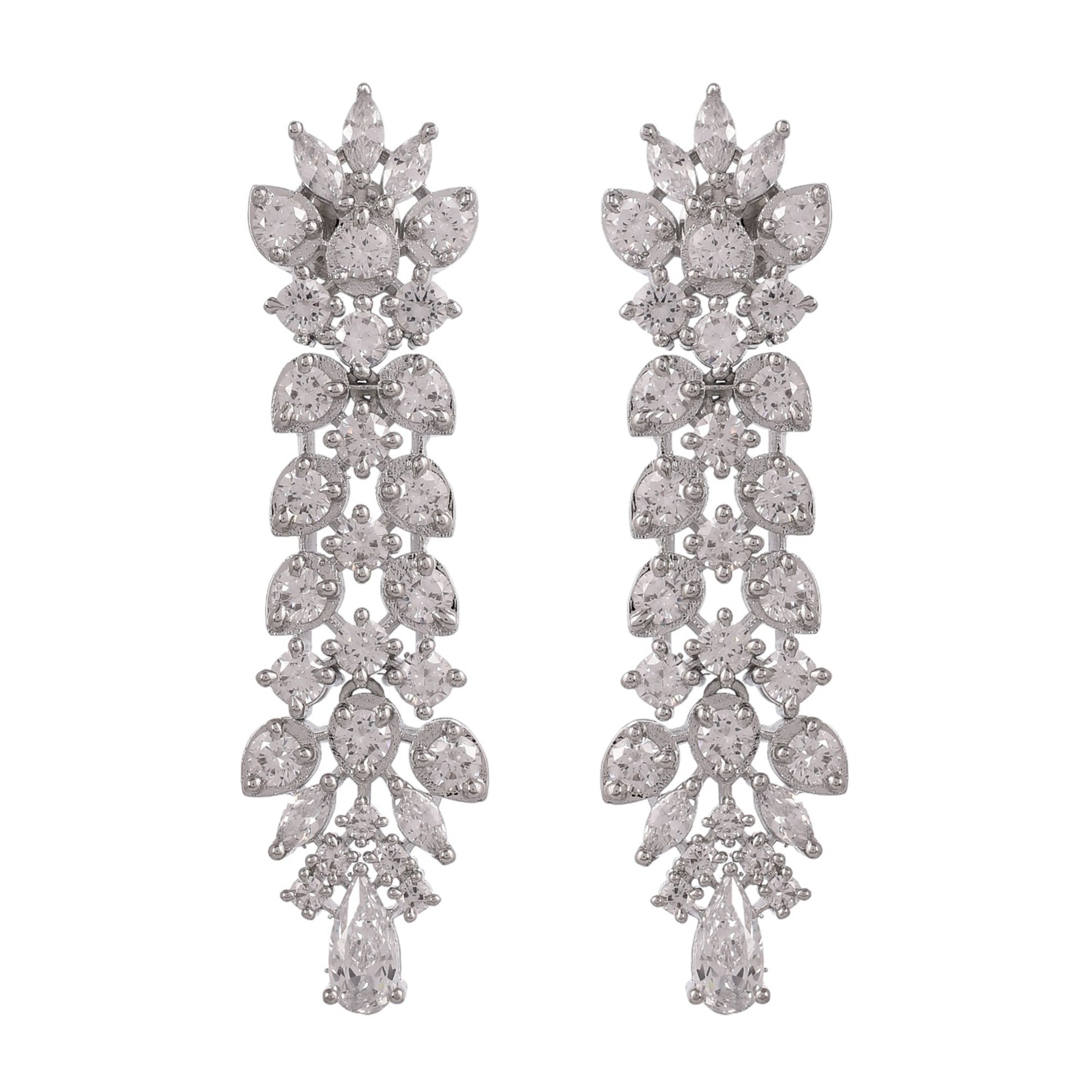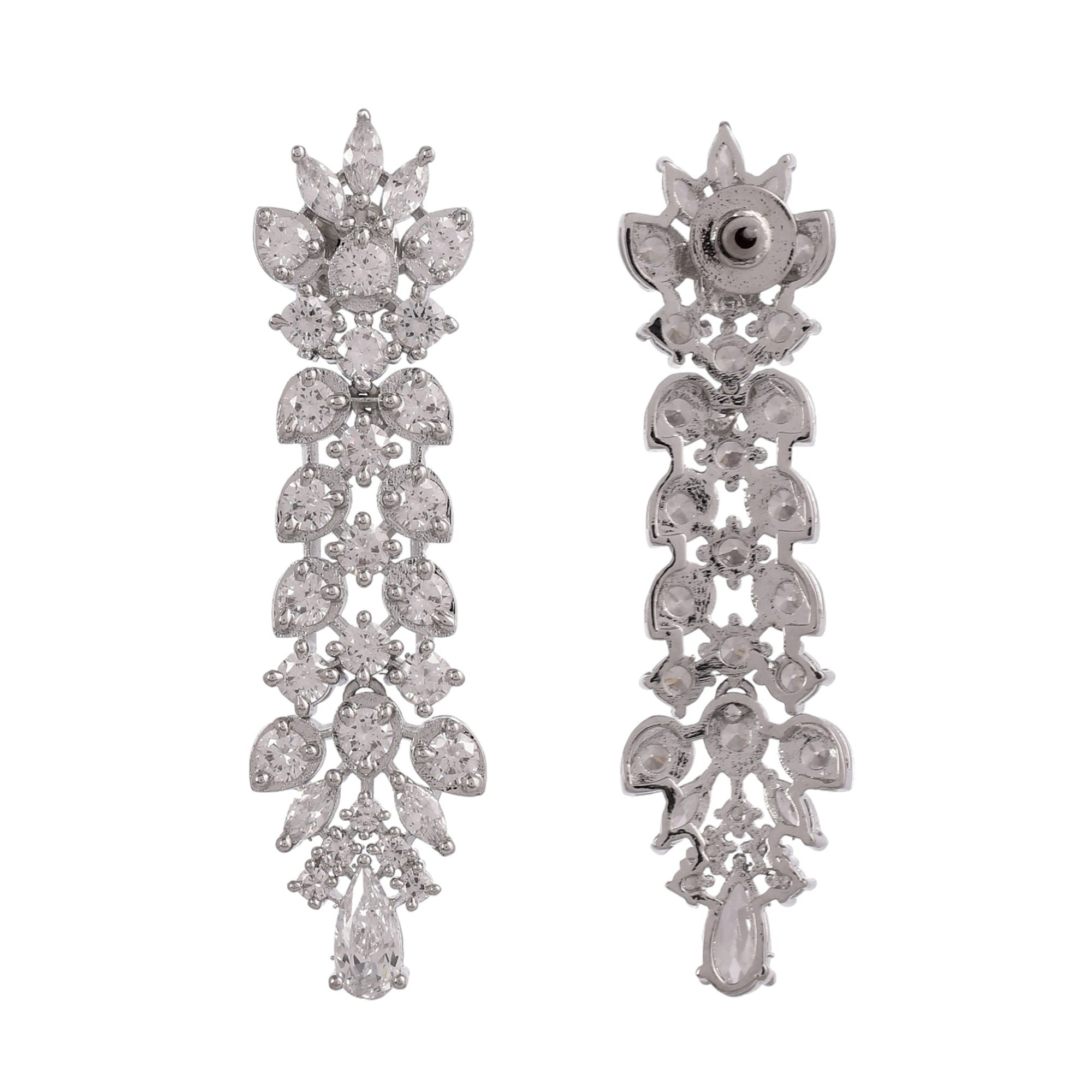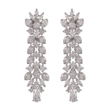 Drop earrings made from brass and white rhodium plated. The luxurious pair has been heavily embellished with perfectly cut and set zirconia gemstones. Pair with a formal cocktail gown or dress.