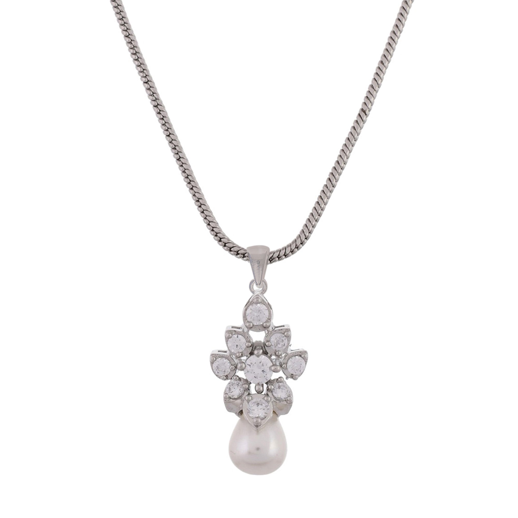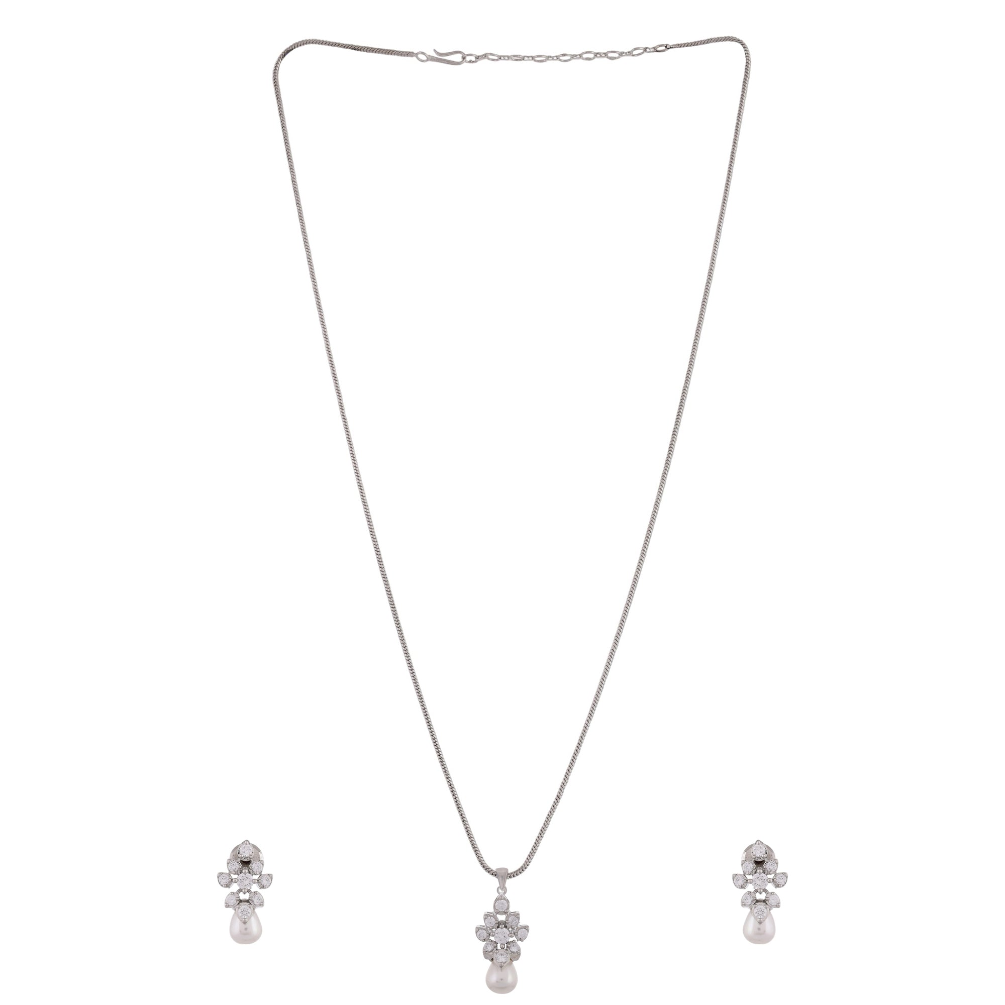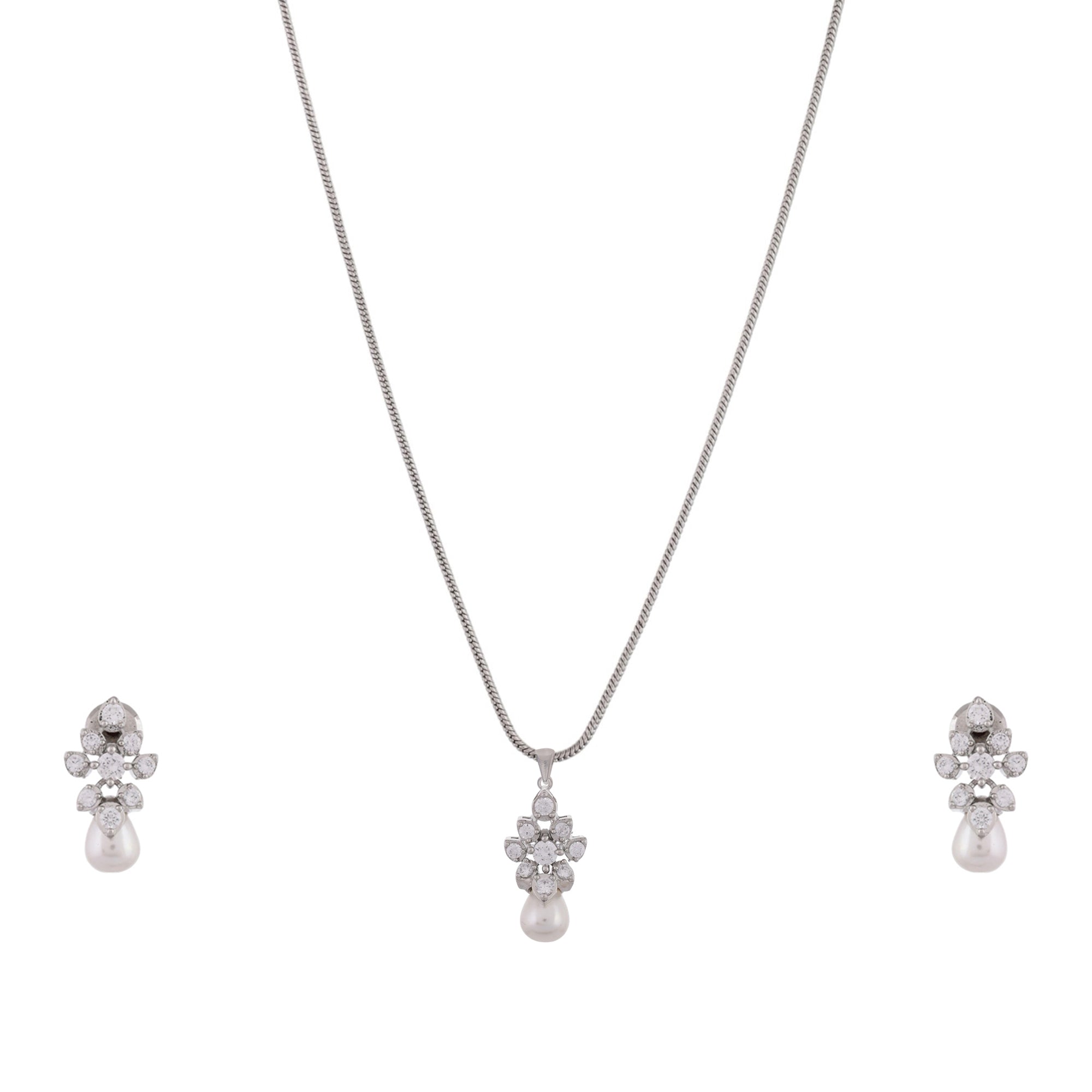 Dainty and charming, this pendant set has been fashioned out of brass. White rhodium plating adds to the grace of this set, which comprises of a white pearls and zirconia gems encrusted pendant and matching earrings embellished with CZ gems and white pearls. Pair with any of your favourite outfits.