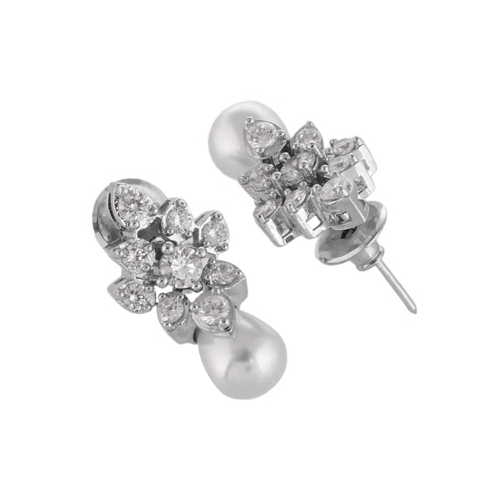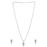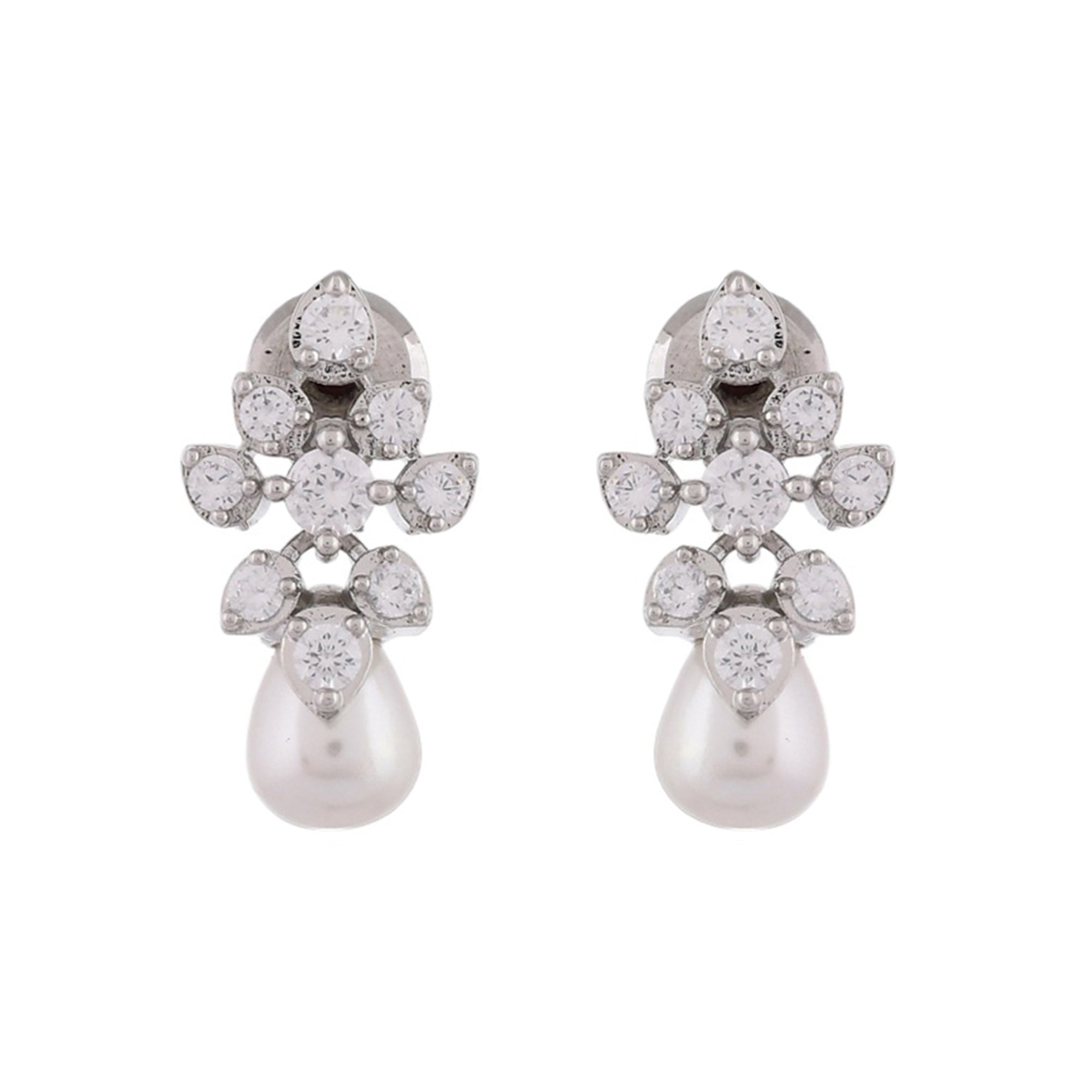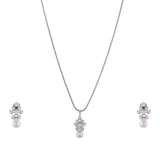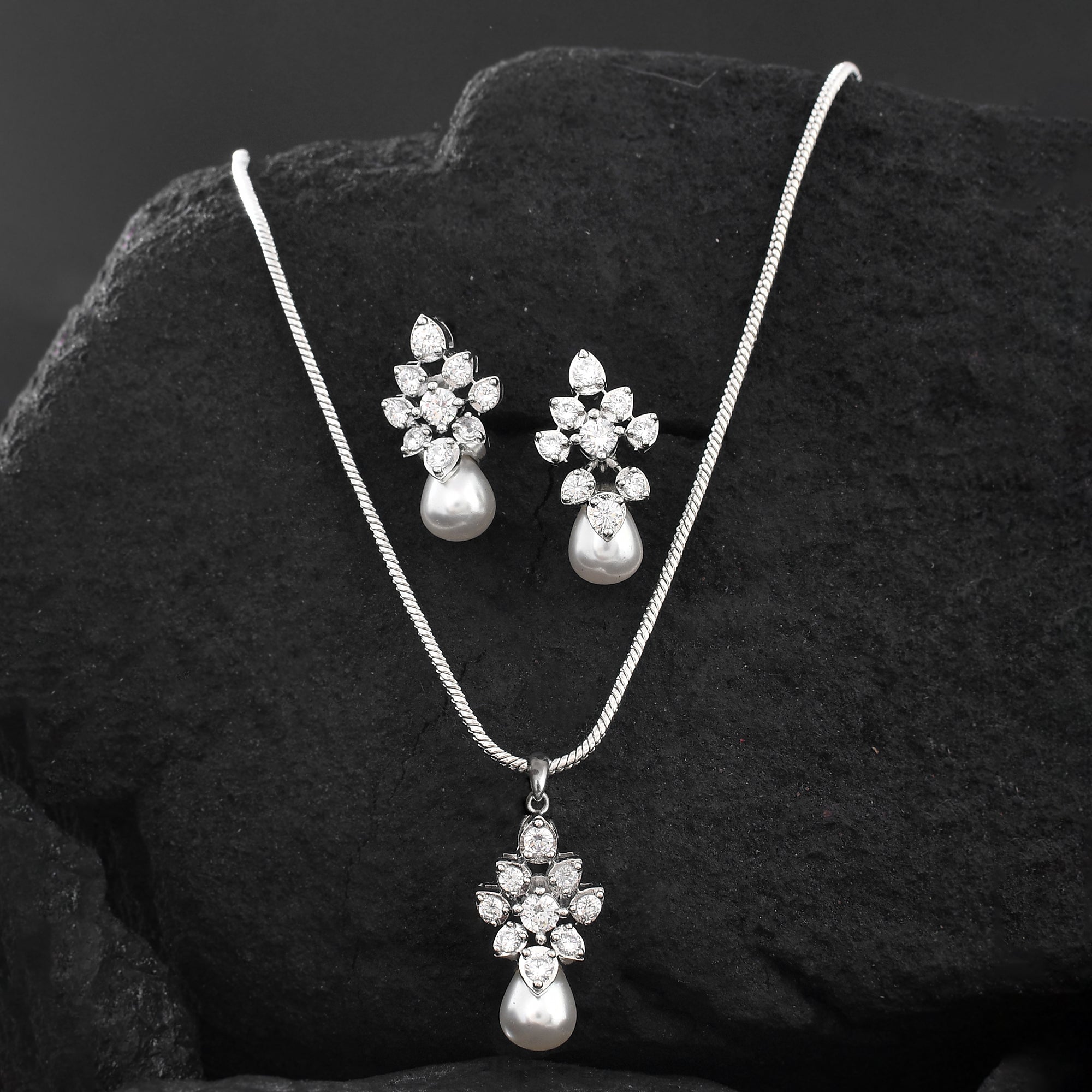 Dainty and charming, this pendant set has been fashioned out of brass. White rhodium plating adds to the grace of this set, which comprises of a white pearls and zirconia gems encrusted pendant and matching earrings embellished with CZ gems and white pearls. Pair with any of your favourite outfits.