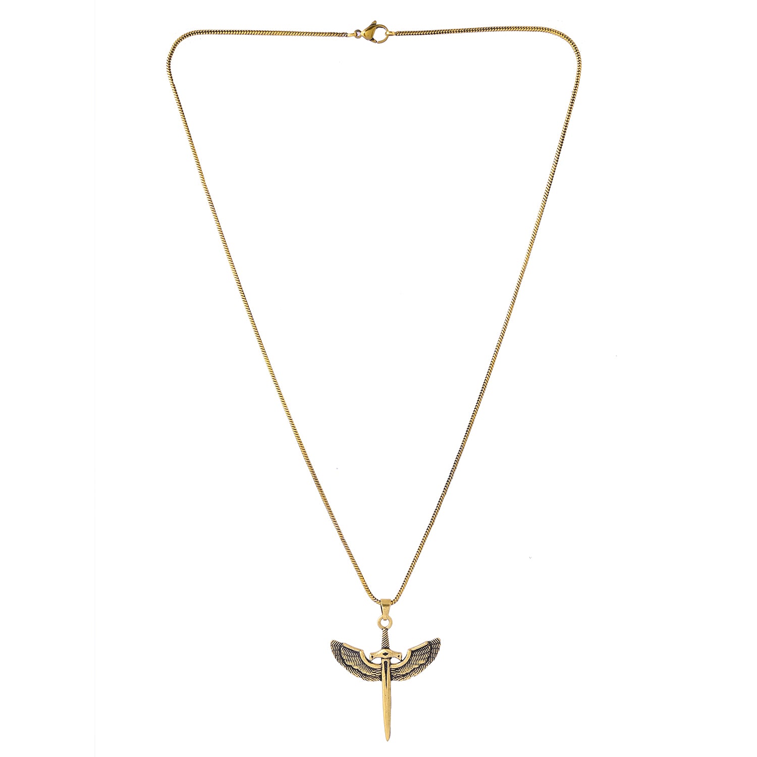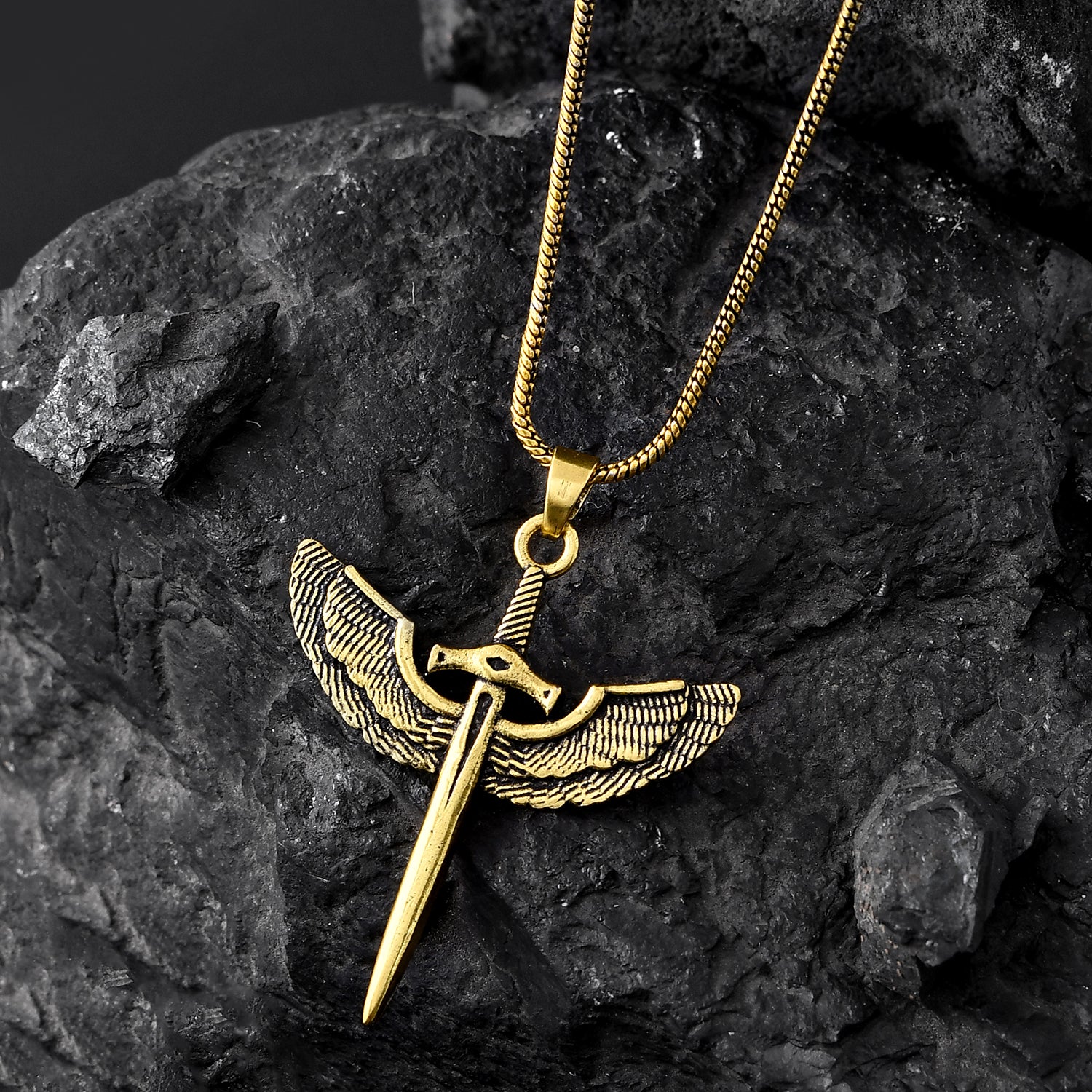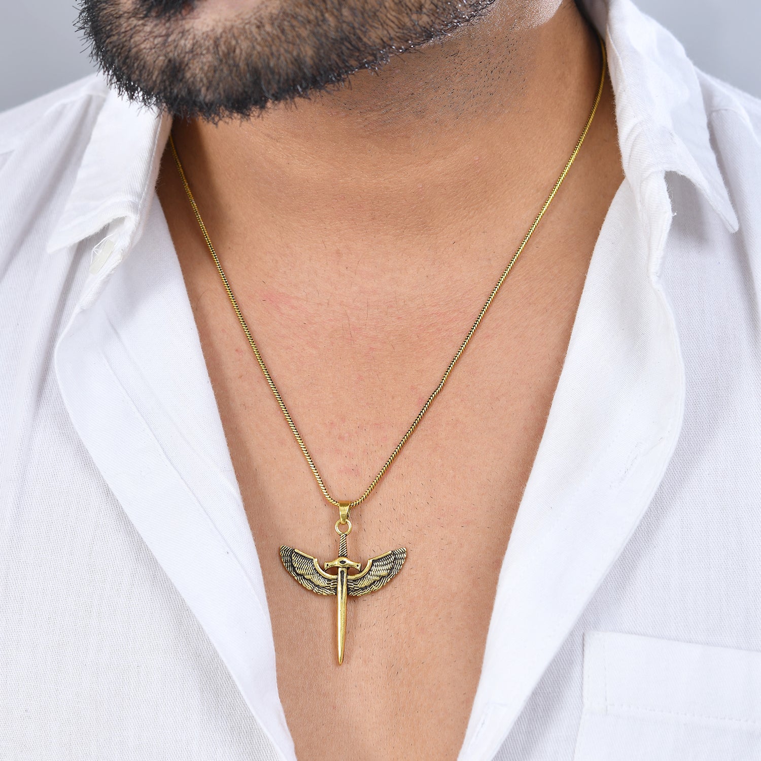 Channeling the spirit of a warrior and the elegance of timeless Indian artistry, the Guardian Blade Vow Men's Pendant is a bold tribute to strength, style, and symbolic devotion. Crafted from solid brass with a striking gold oxidised finish, this statement pendant for men blends intricate blade and winged motifs that echo ancient guardianship and honor. Designed as part of the Statement Collection, this stylish pendant for men hangs from a classic link chain, balancing masculine form with finely detailed craftsmanship. Its antique gold tones pair effortlessly with casual black tees, crisp white shirts, or even layered over ethnic kurta sets for festive occasions. Ideal as a Valentine’s gift pendant for men or an anniversary gift for him pendant, it’s more than jewellery—it’s a vow of individuality and style. Whether you're shopping for yourself or searching for the best pendant for men online, this is a must-have fashion jewellery men accessory that combines vintage soul with contemporary attitude.