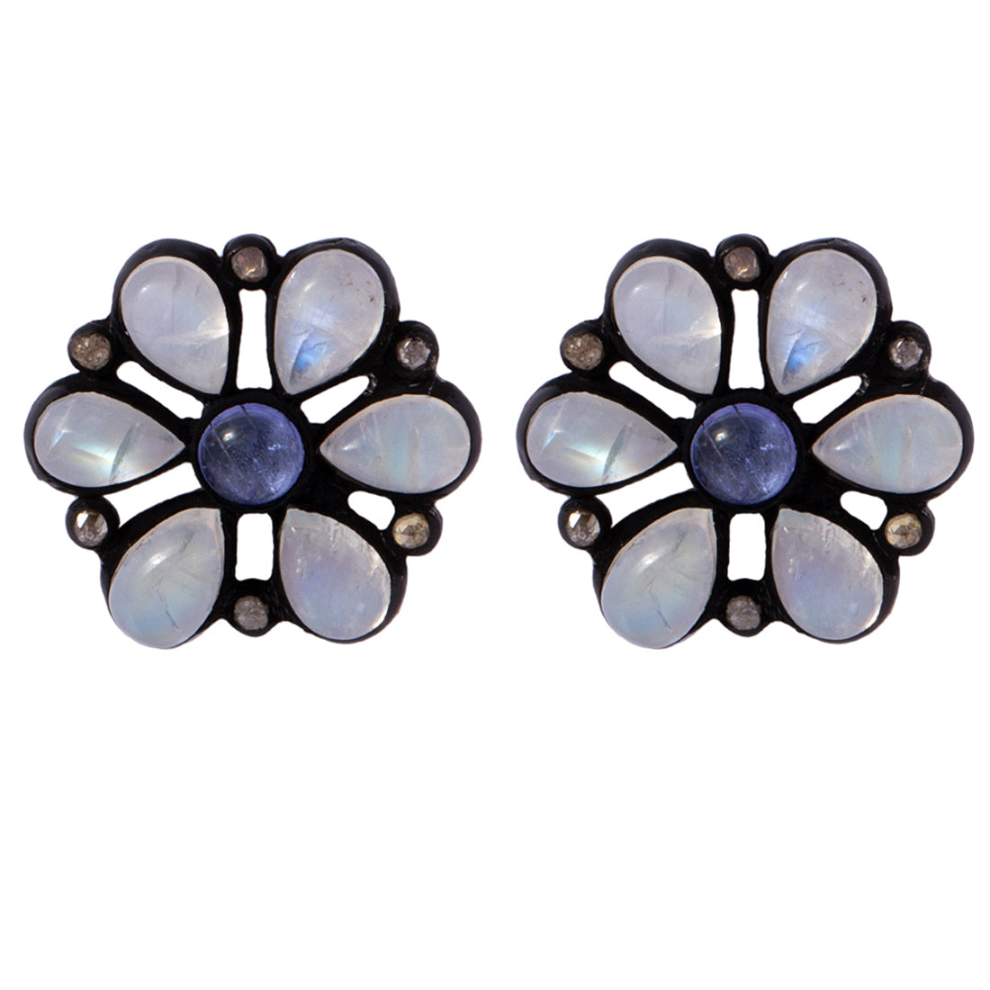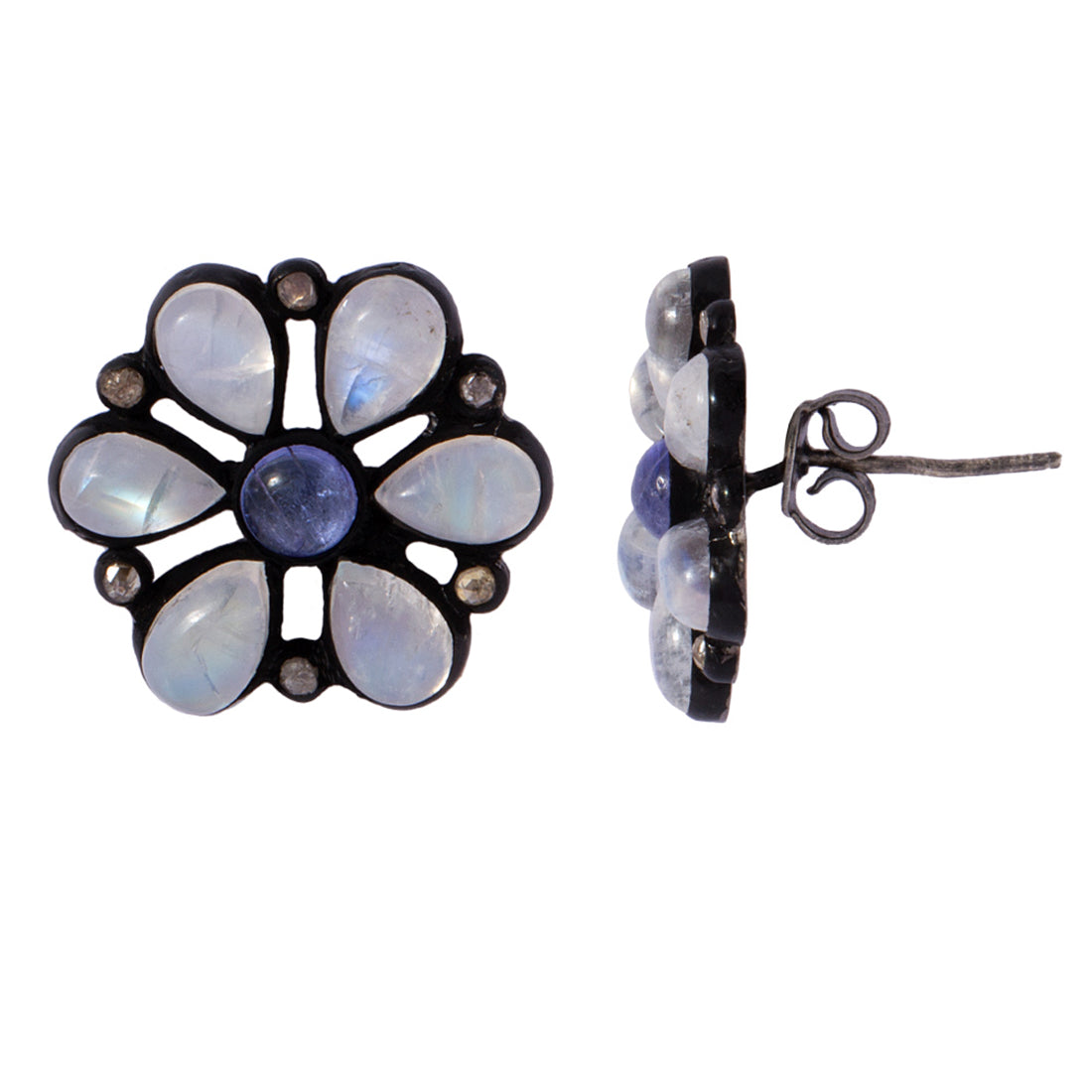 Sterling Silver Floral Ear Studs Embellished With Real Diamonds And Natural Multy Stones