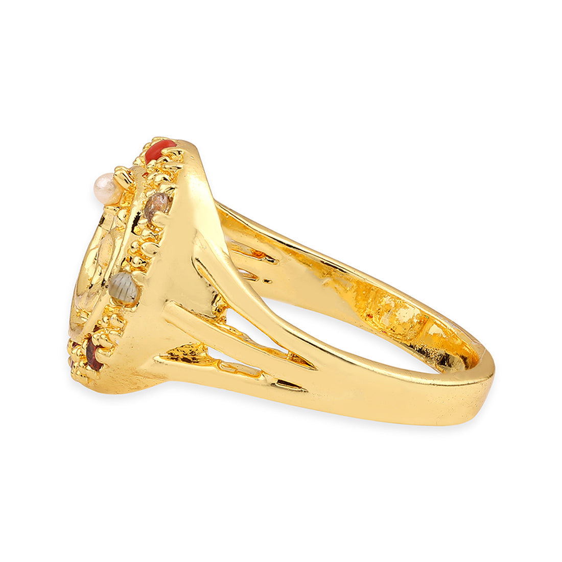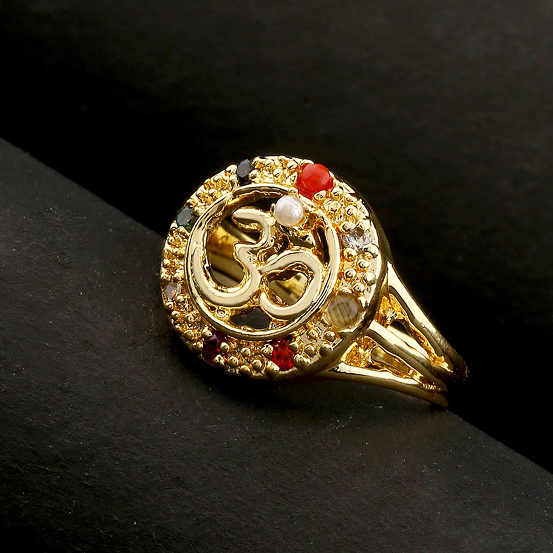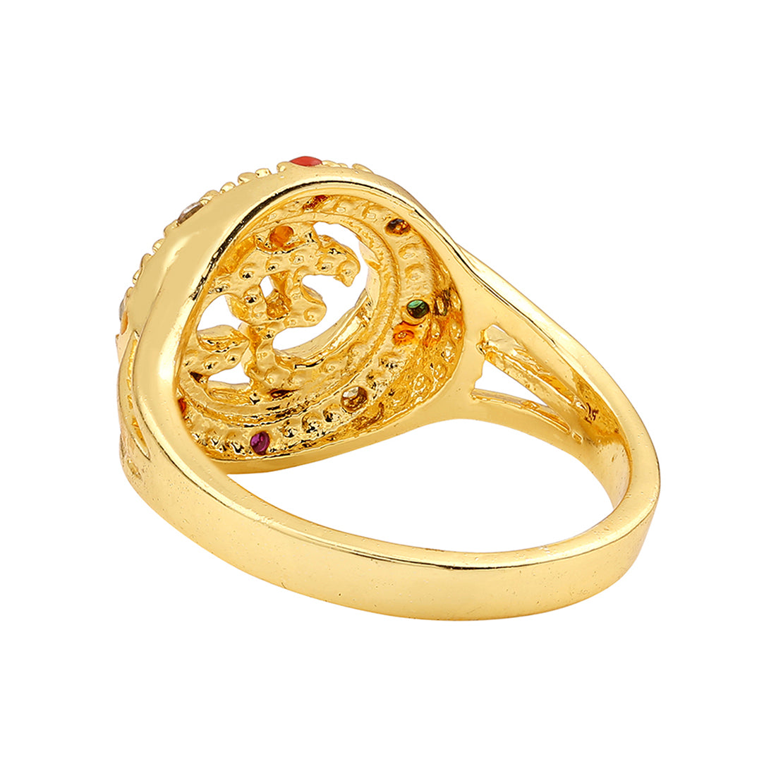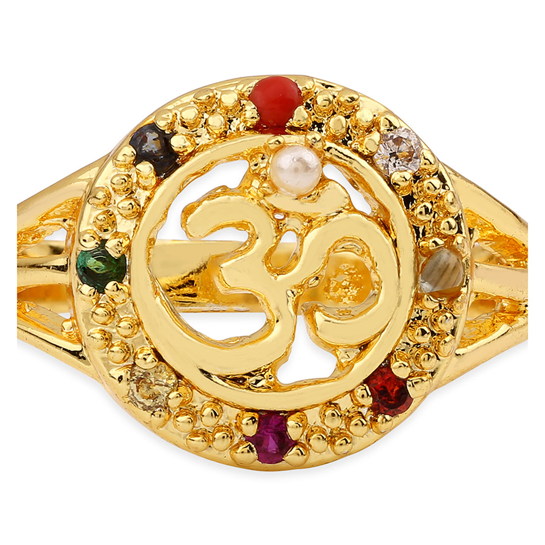 The Accessory: This divine ring is engraved with OM and studded with colorful stones. How to Wear : Wear it with any of your outfits. Own the Part: Best for daily wear.