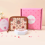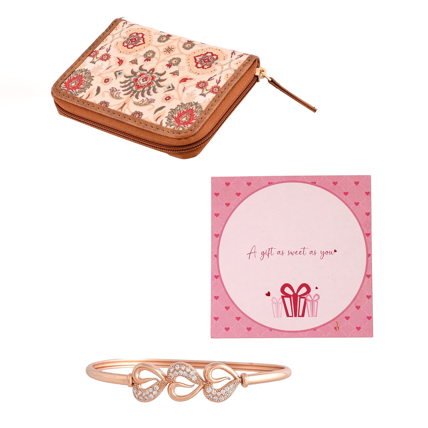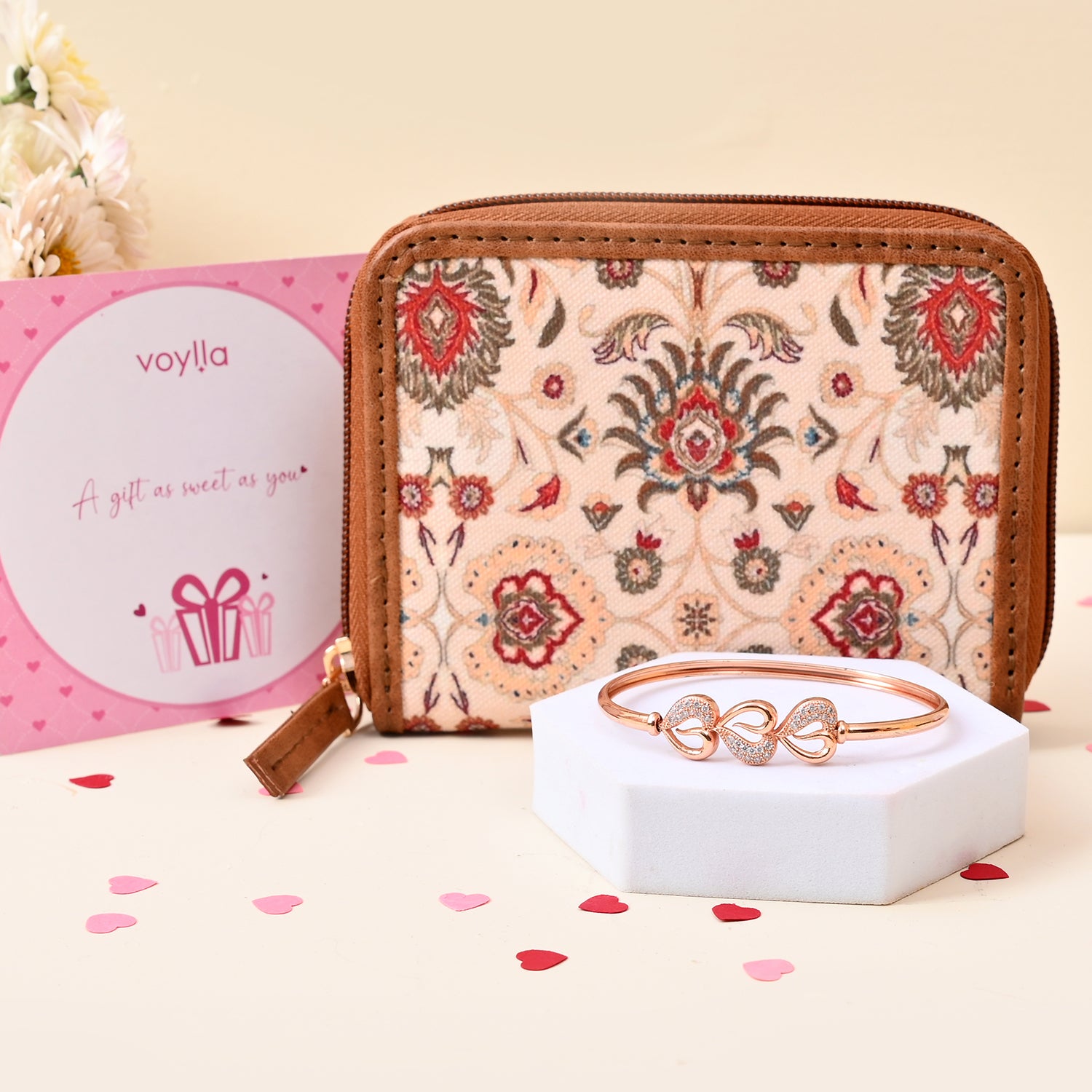 The Style & Substance Valentine Hamper is the perfect blend of elegance and functionality, making it a top pick for a women's Valentine's gift. This thoughtfully curated set includes a stylish wallet adorned with beautiful floral and geometric patterns complemented by a brown leather trim and zipper, a chic gold-colored bracelet with intertwined loops and shimmering american diamond stones, and a heartfelt card with a sweet message that reads "A gift as sweet as you." The wallet's intricate design and high-quality craftsmanship ensure it’s both durable and fashionable. The bracelet is versatile enough to jazz up both party outfits and everyday looks. The romantic card adds a personal touch to this well-rounded gift. Whether it's for a lover, girlfriend, or wife, this hamper is a fantastic choice for Valentine's Day, ensuring she'll feel truly special.