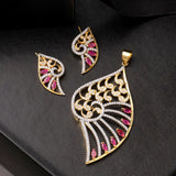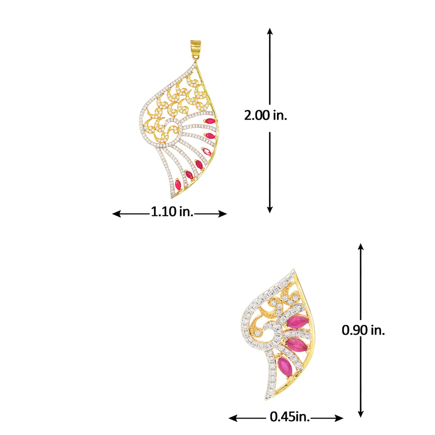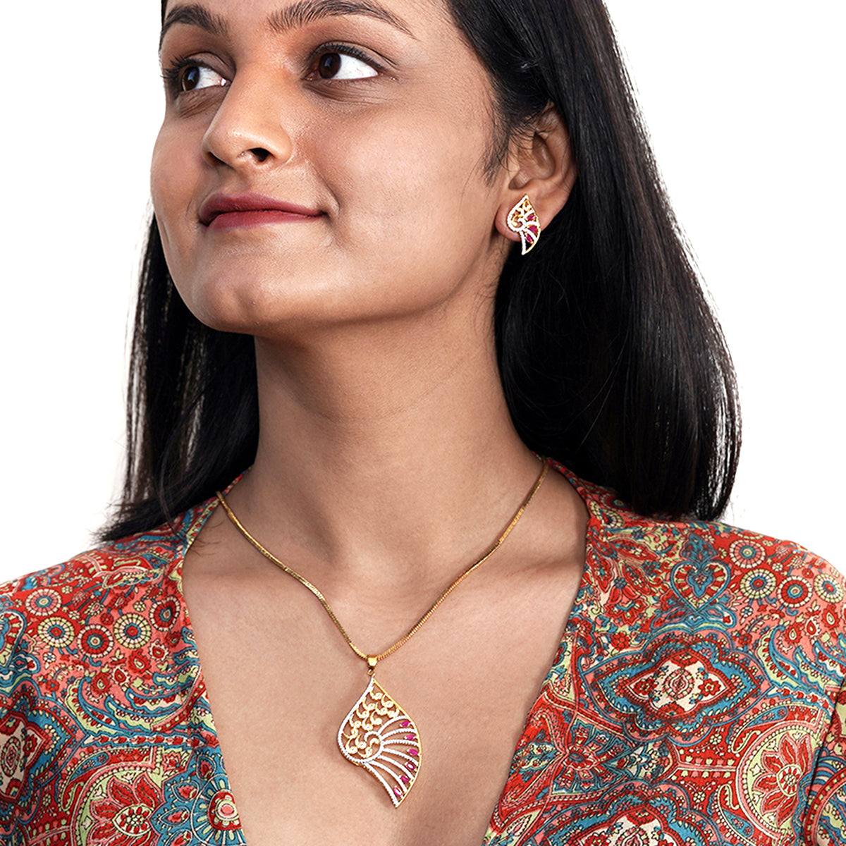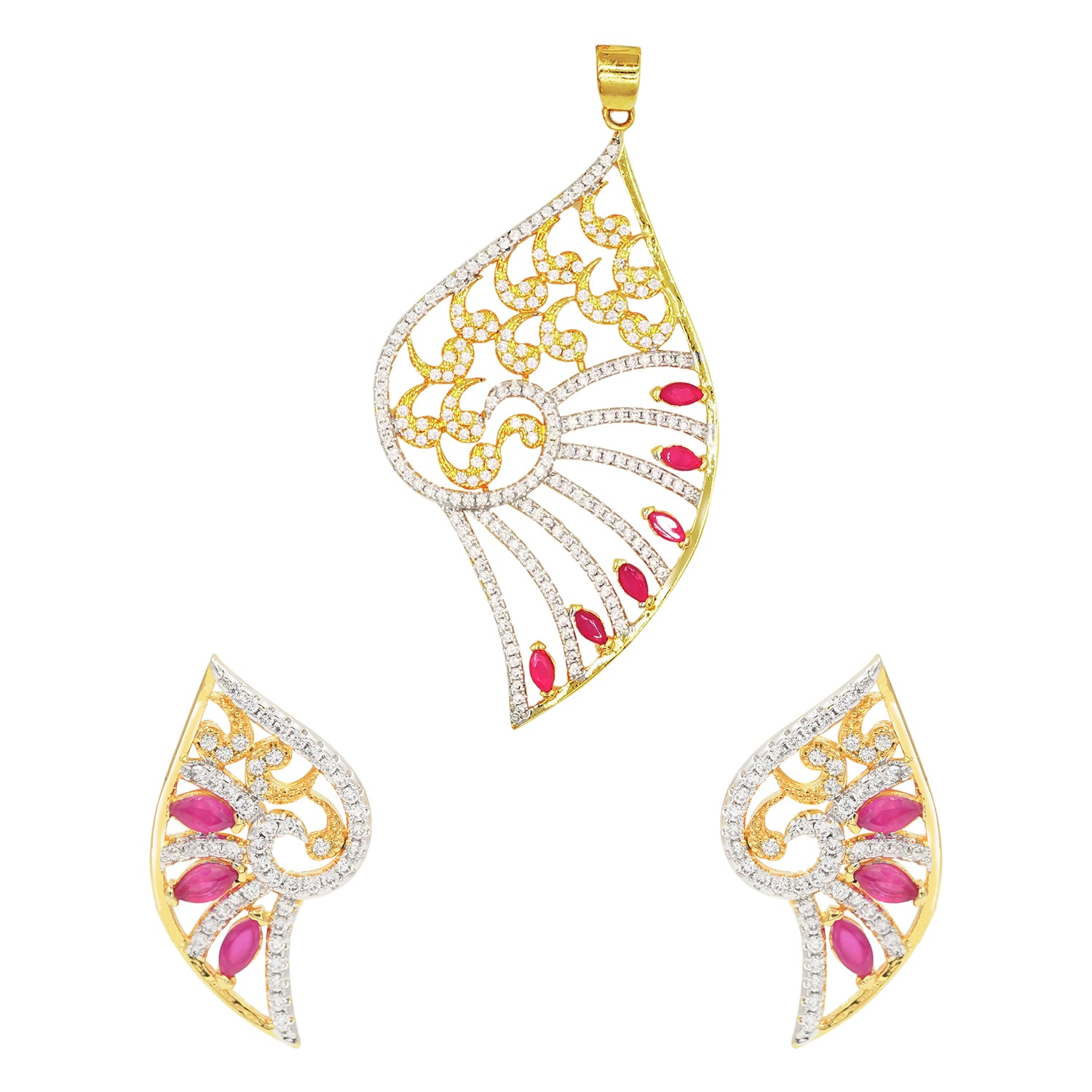 A brilliant pendant set featuring delicate patterns. This gorgeous set is exquisitely crafted using American Diamond stones and finished with gold plating. Intricate in design, extremely lightweight, and comfortable to wear.