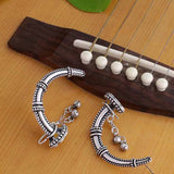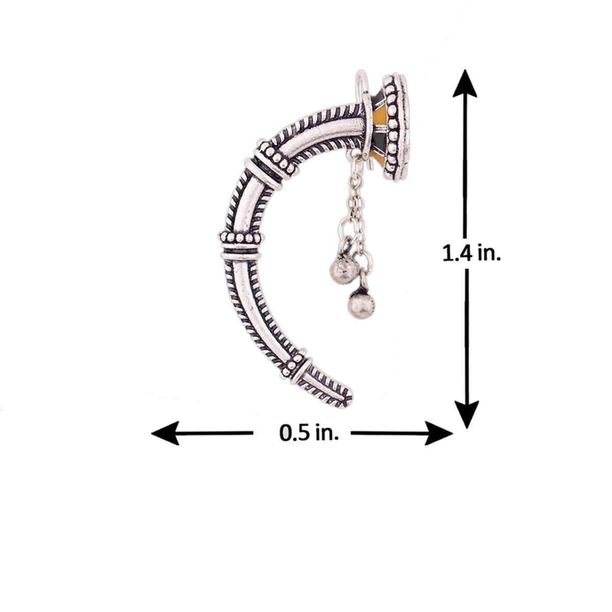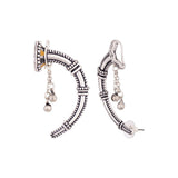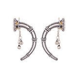Inspired by traditional Indian musical instruments, these shehnai earrings have been crafted from brass. Oxidised silver plated and adorned with carefully crafted details. Lightly embellished and a good match for Indian and Indo-Western attire.