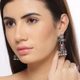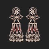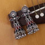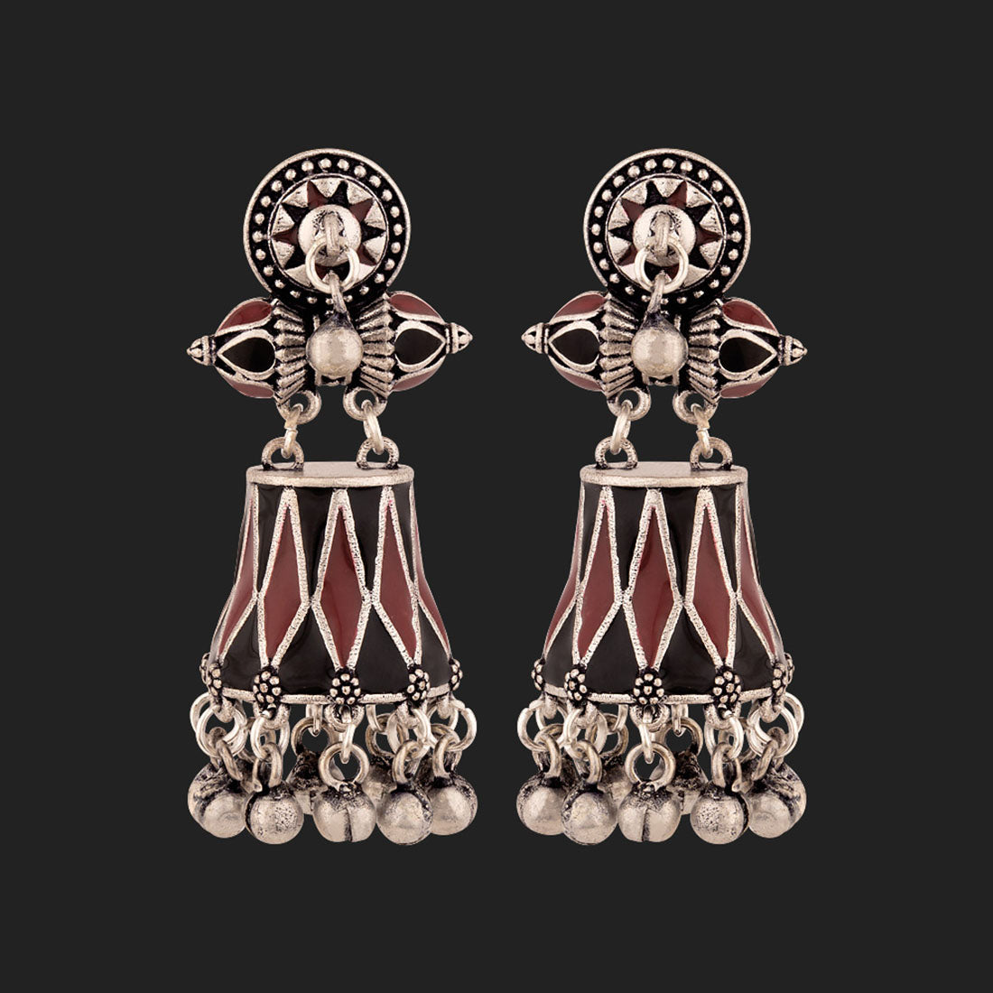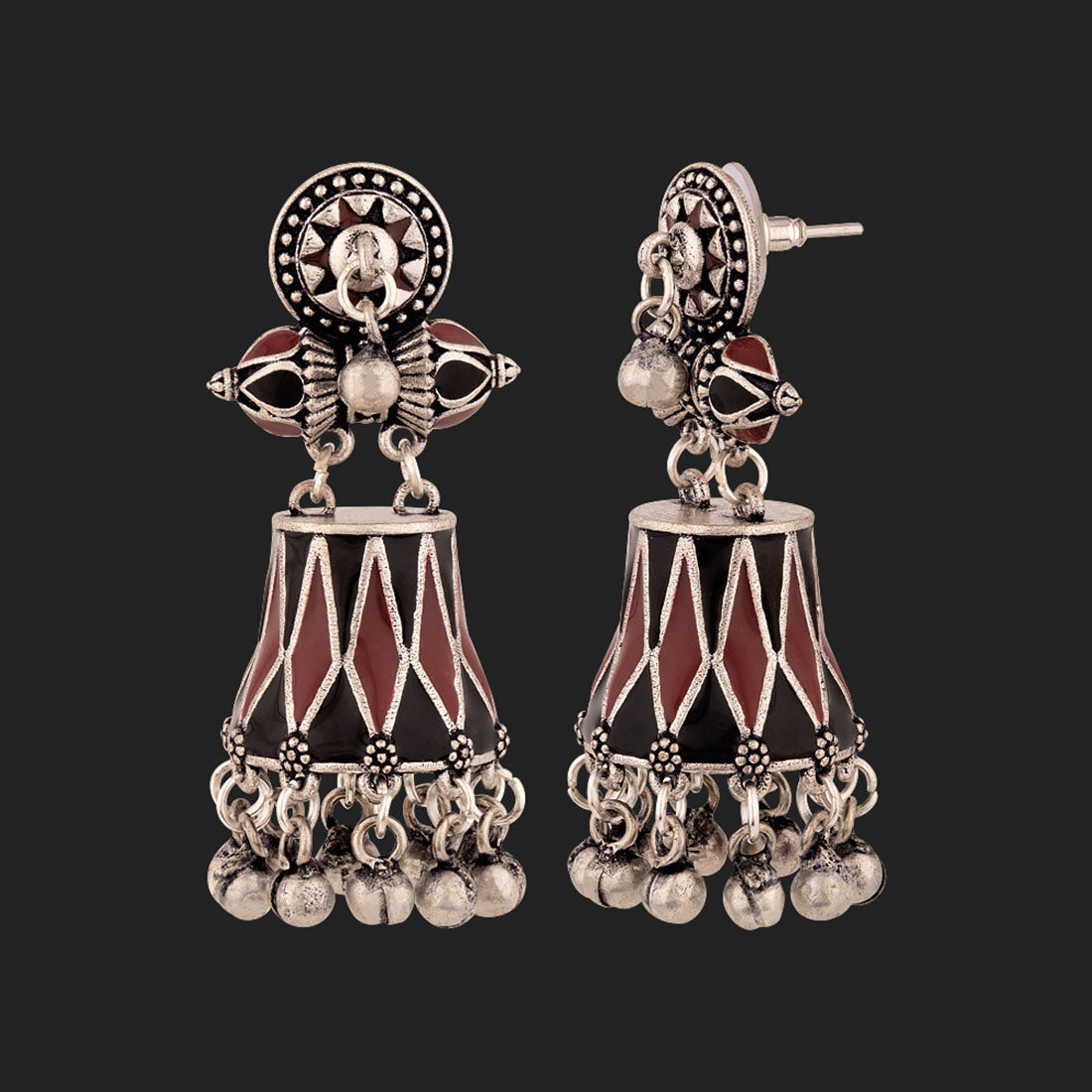 Jhumka style drop earrings inspired by classical Indian music and musical instruments. The enameled pair has been crafted from brass. Oxidized silver plated and embellished with metal ghungroos. Wear with a traditional saree or Indo-Western kurta.