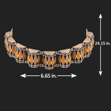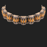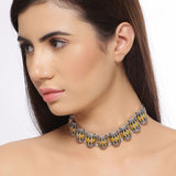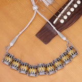 Designed as a tribute to soulful and melodious Indian musical instruments and the spirit of classical Indian music, this dholak motifs necklace has been crafted from brass. Oxidized silver plated and enameled, this choker style necklace is comfortable, lightweight and will look splendid with a casual cotton saree. This piece of jewelry comes with the Voylla assurance of quality and durability.