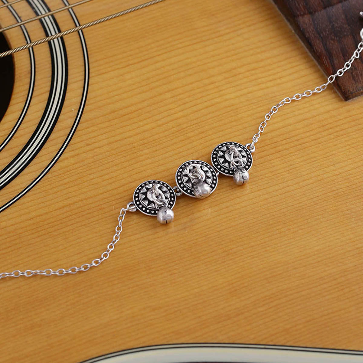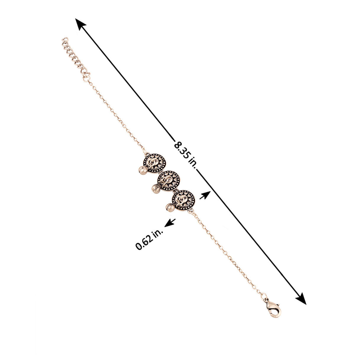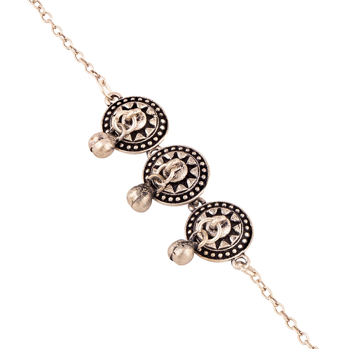 Brass anklet with tabla motifs, designed as a tribute to classical Indian music and musical instruments. Embellished lightly with ghungroos, the oxidized silver plated anklet features a lobster claw closure and can be paired with casual looks of all kinds. This piece of jewelry comes with the Voylla assurance of quality and durability.
