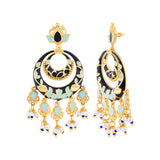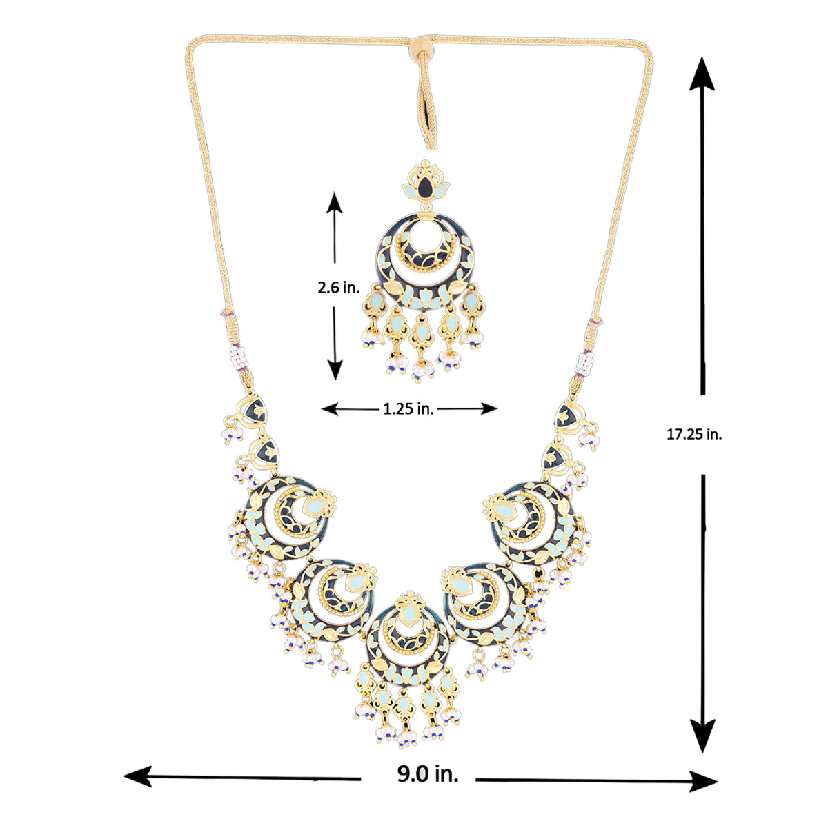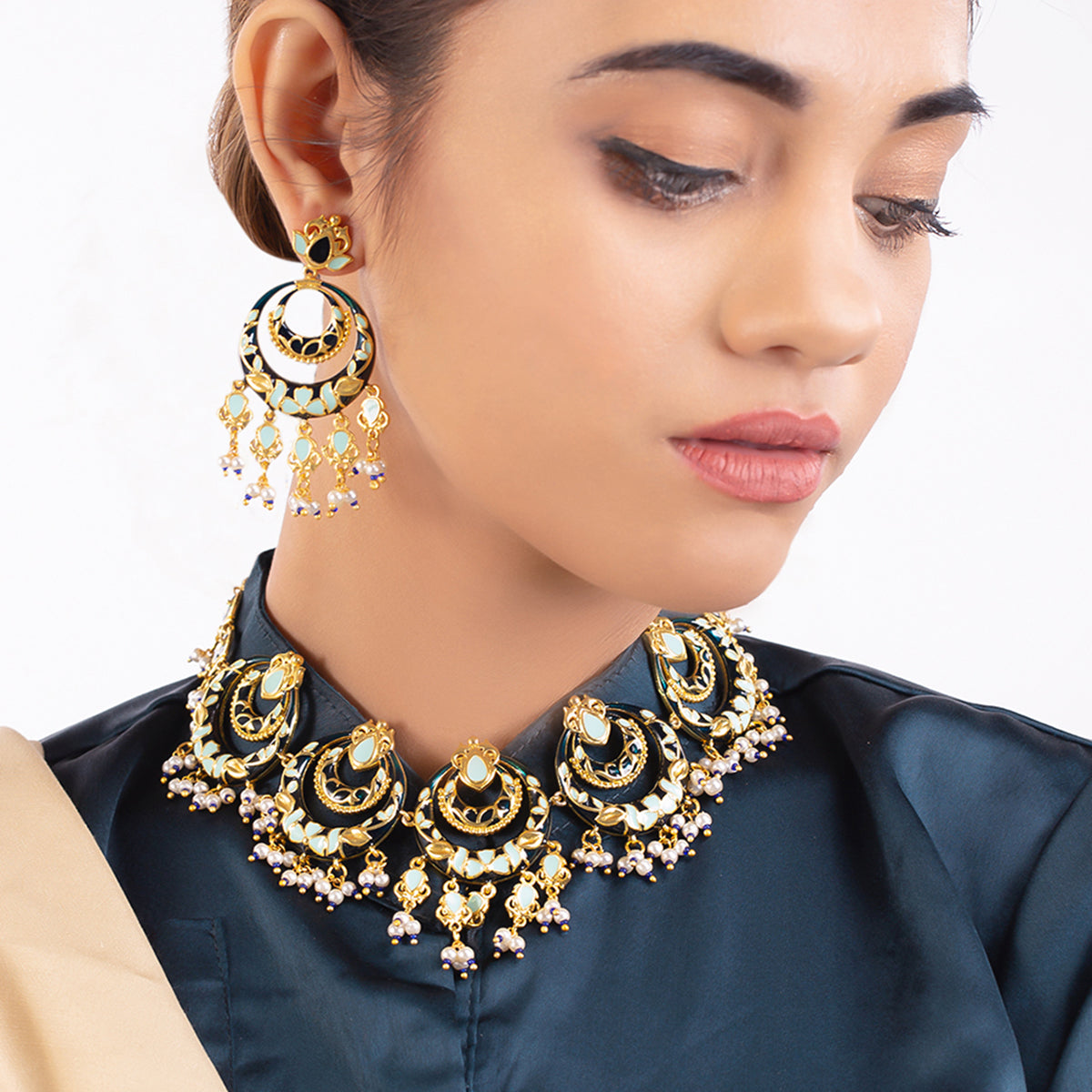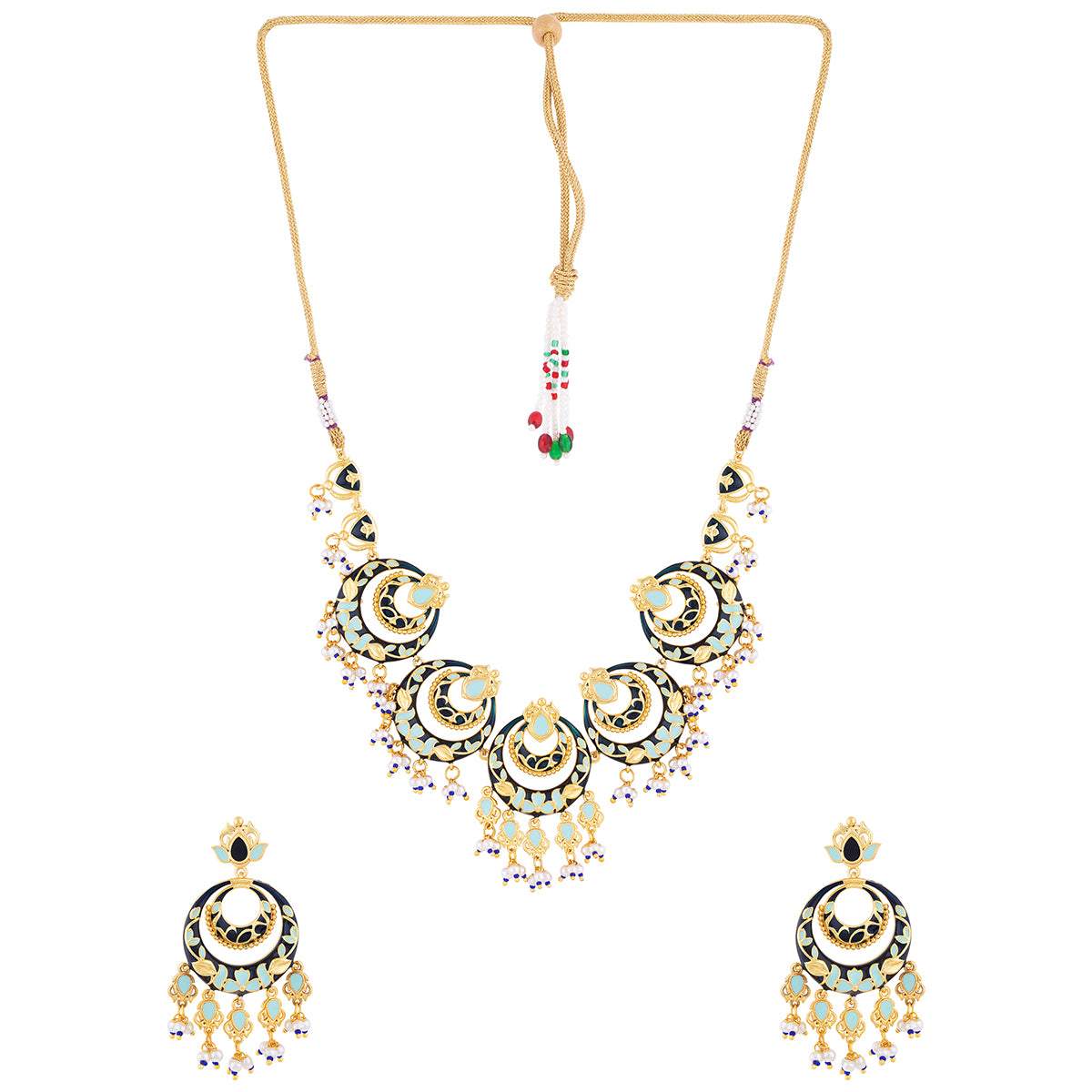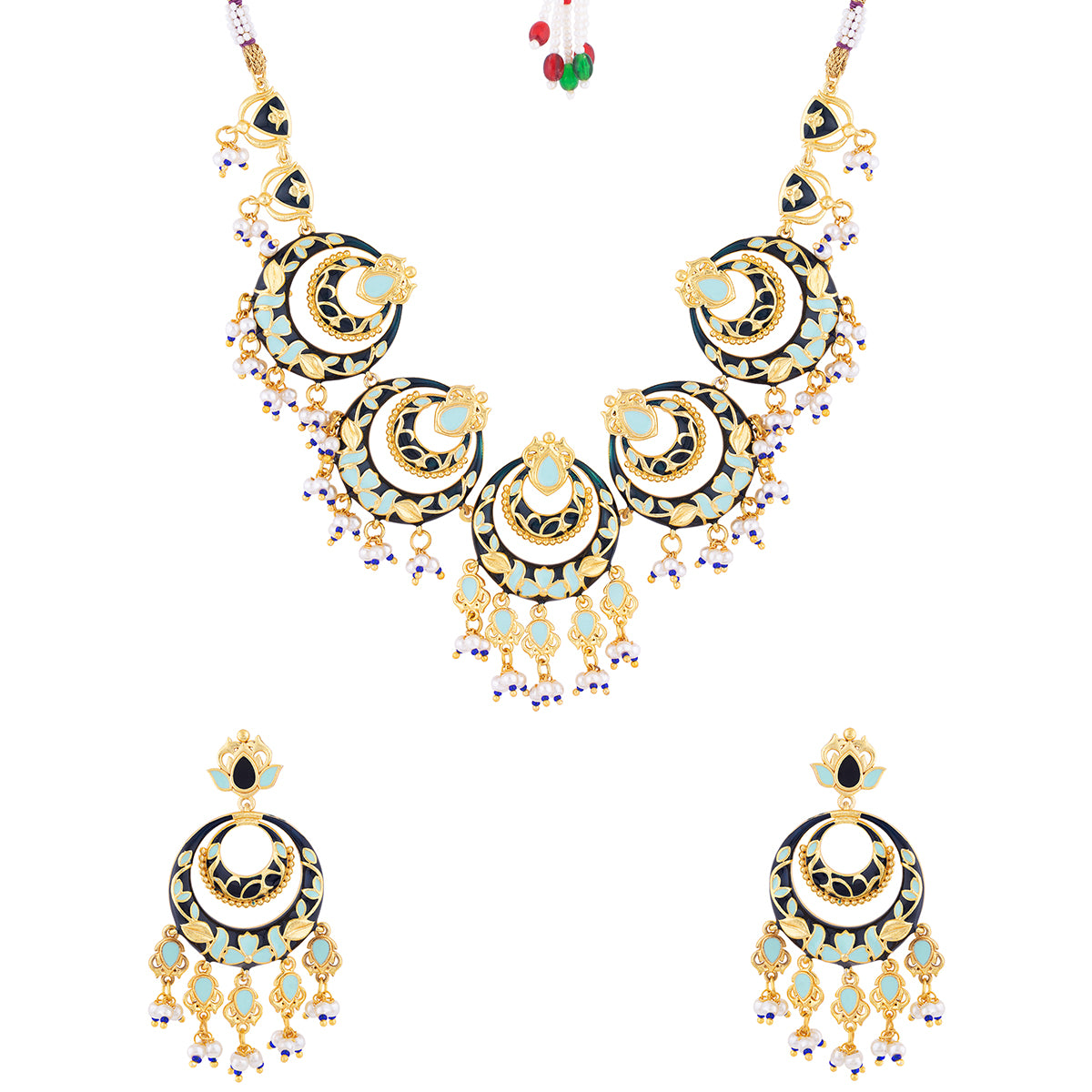 Brass necklace set inspired by Rajasthan's traditional artform Pichhwai, and its recurrent motifs. Heavily embellished with faux pearls, the chandbali necklace and earrings have been given a yellow gold plating. Wear the enameled set with a formal ethnic gown.