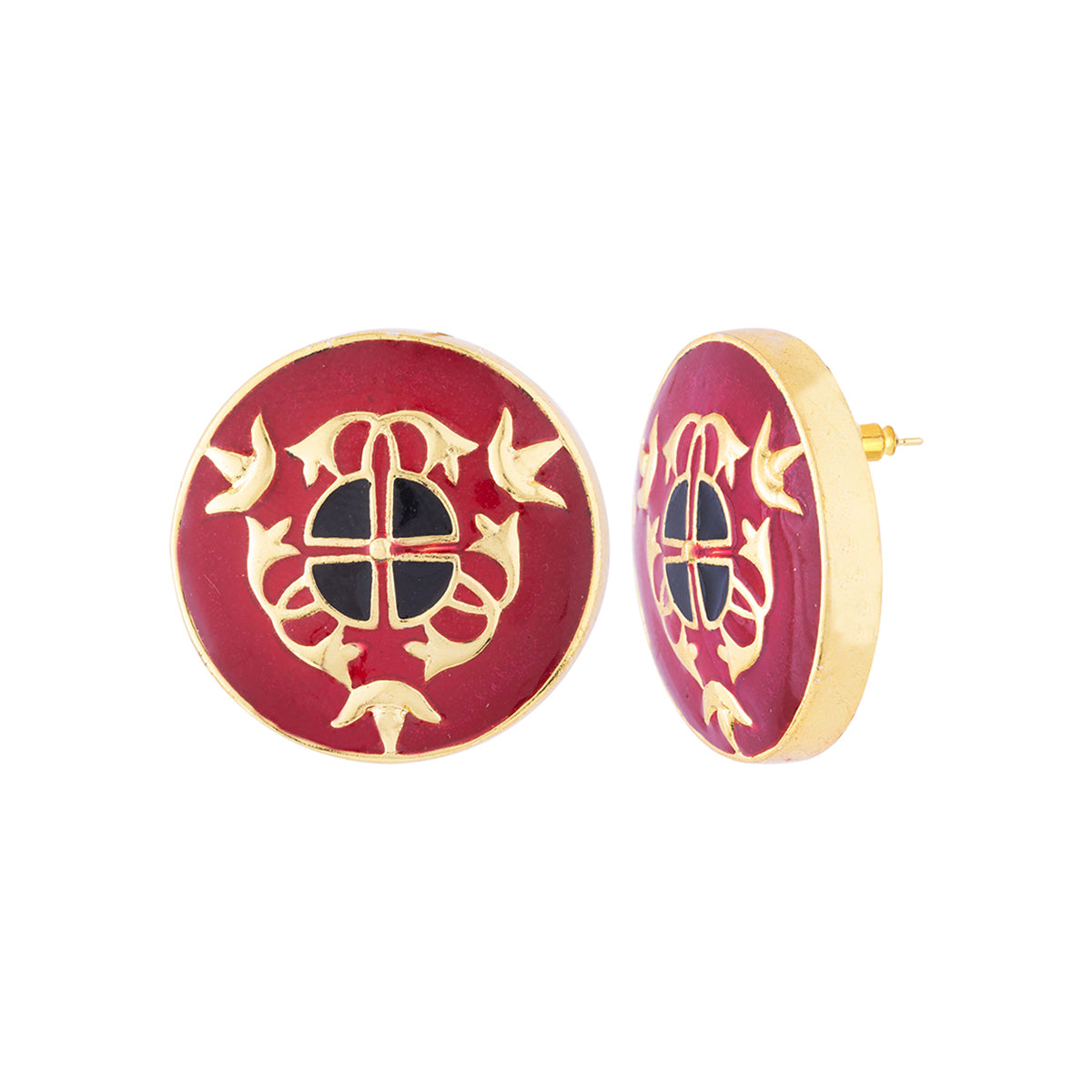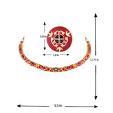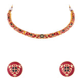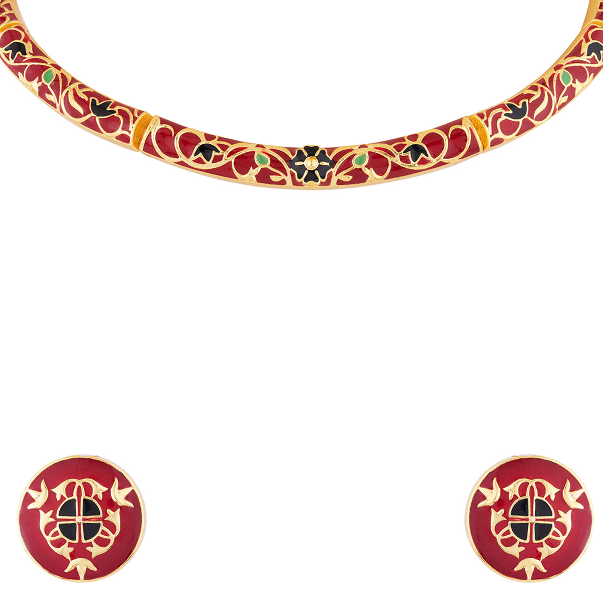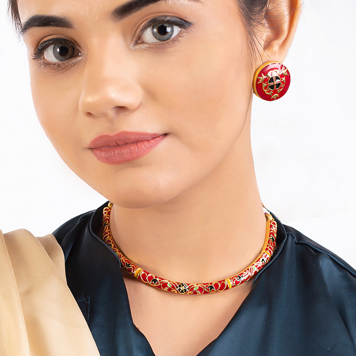 Inspired by the traditional Rajasthani artform of Pichhwai, this choker necklace set has been fashioned out of brass. Featuring floral details, the enameled set has been given a yellow gold plating. Pair with a formal ethnic gown or traditional saree.