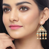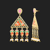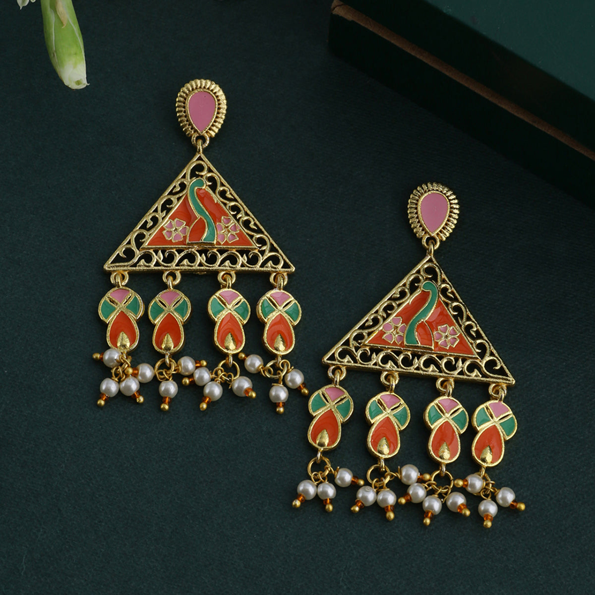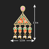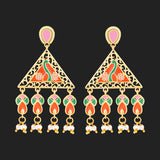 The auspicious triangular form inspires the Tahira Festive Trikone Earrings. In festive colours and pearl detailing, this one is a must have.