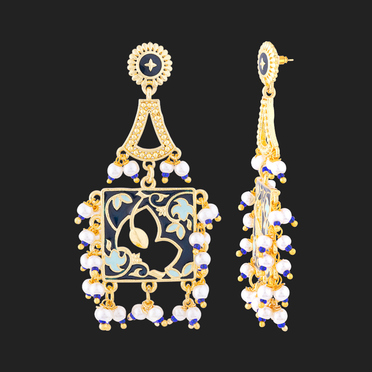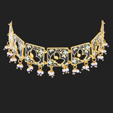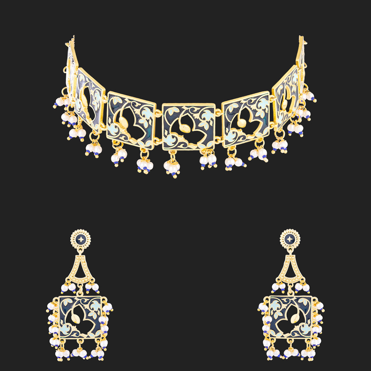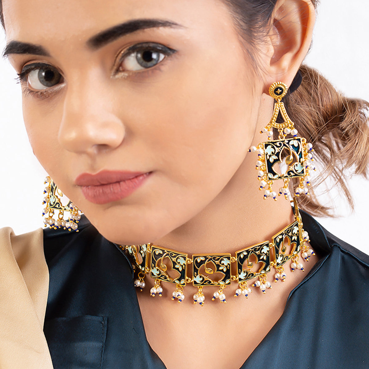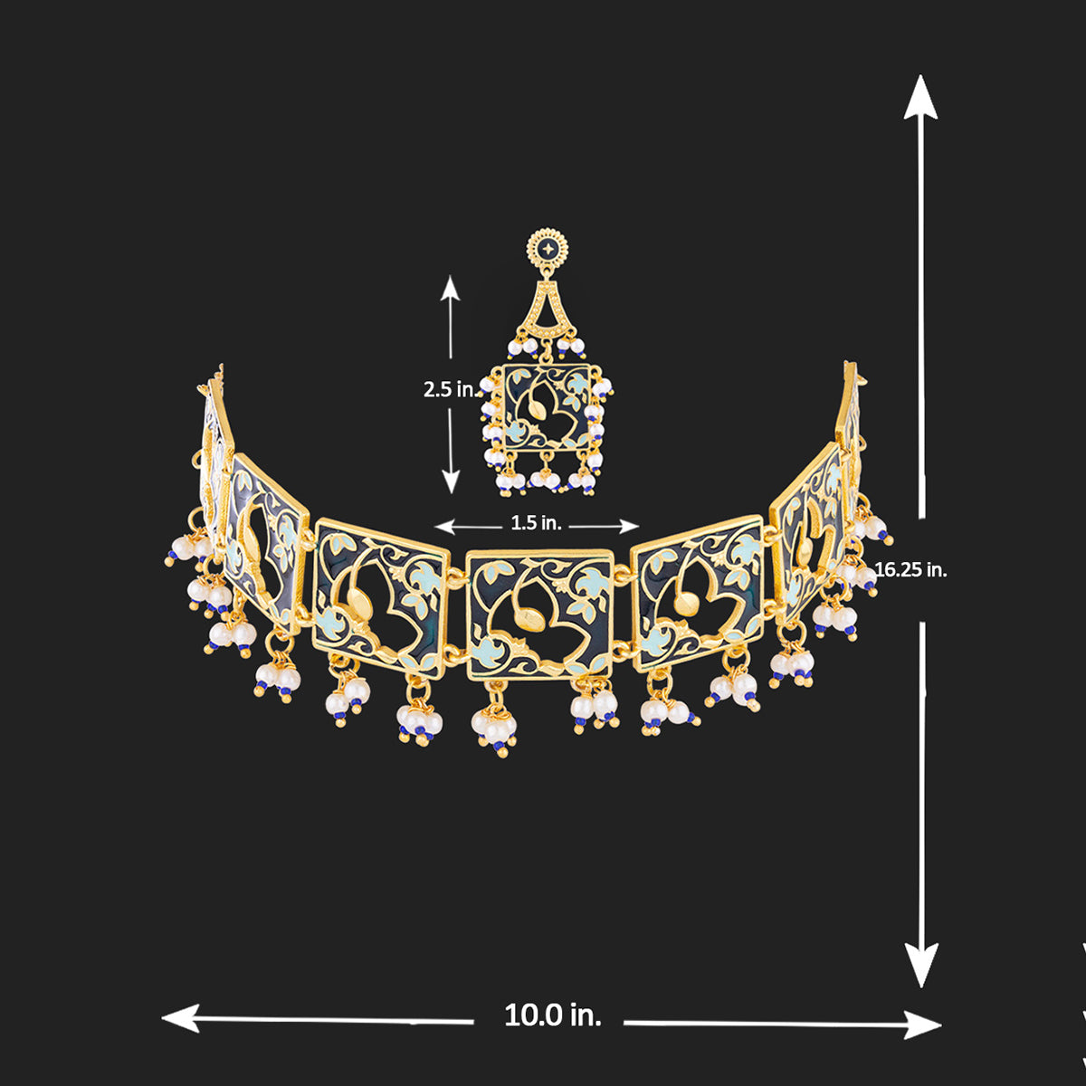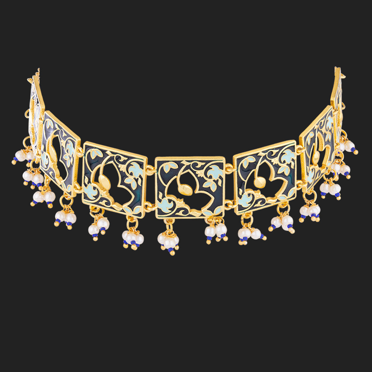 Inspired by Pichhwai, Rajasthan's traditional artform featuring flower and bird motifs, this floral necklace set has been fashioned out of brass. Enameled and faux pearls embellished, the set has been given a yellow gold plating. Pair it with formal Indian attire.