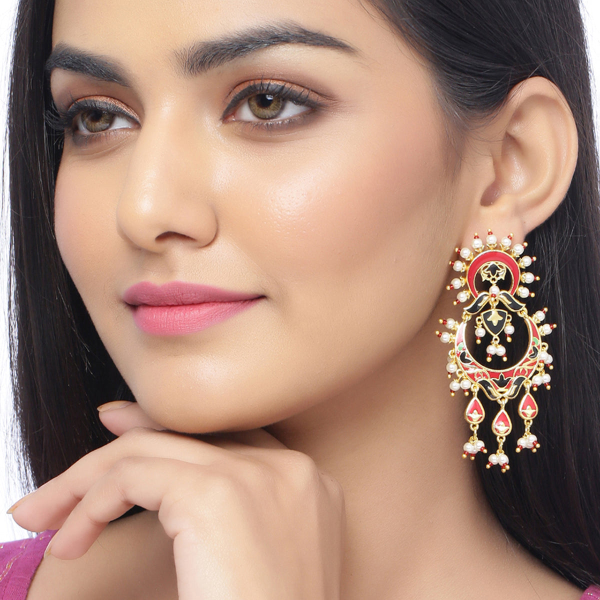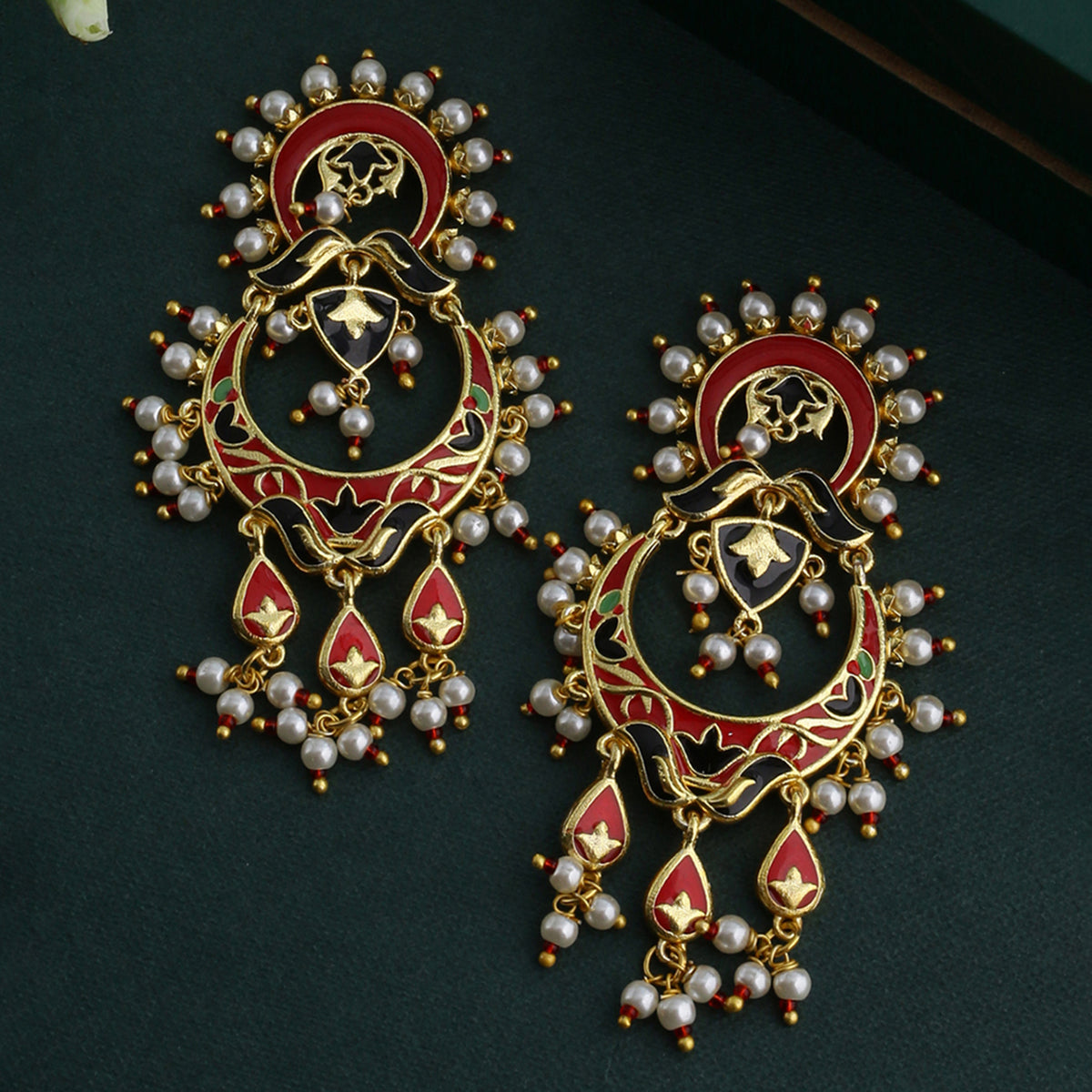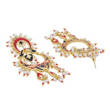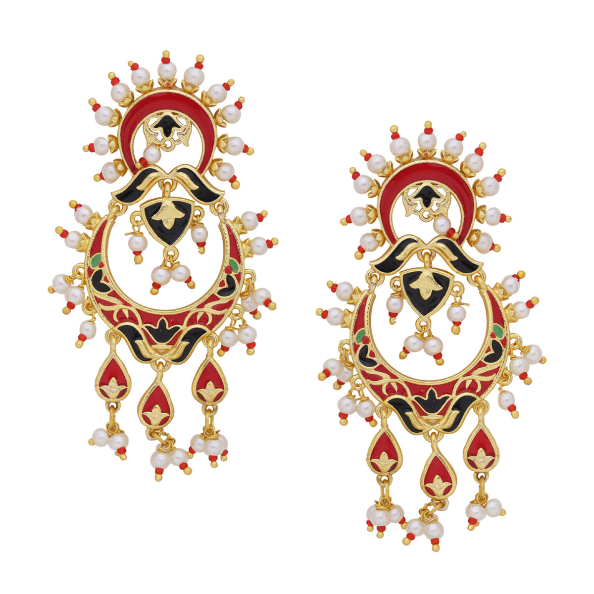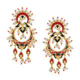 The dance of circles captured in this elegant Tahira Glorious Red Circles Earrings. Hand enamelled detailing on a glossy gold surface gives it a festive look. This piece of jewelry comes with the Voylla assurance of quality and durability.