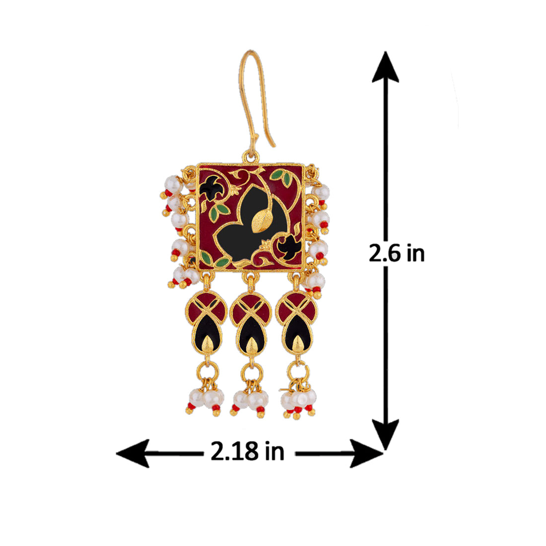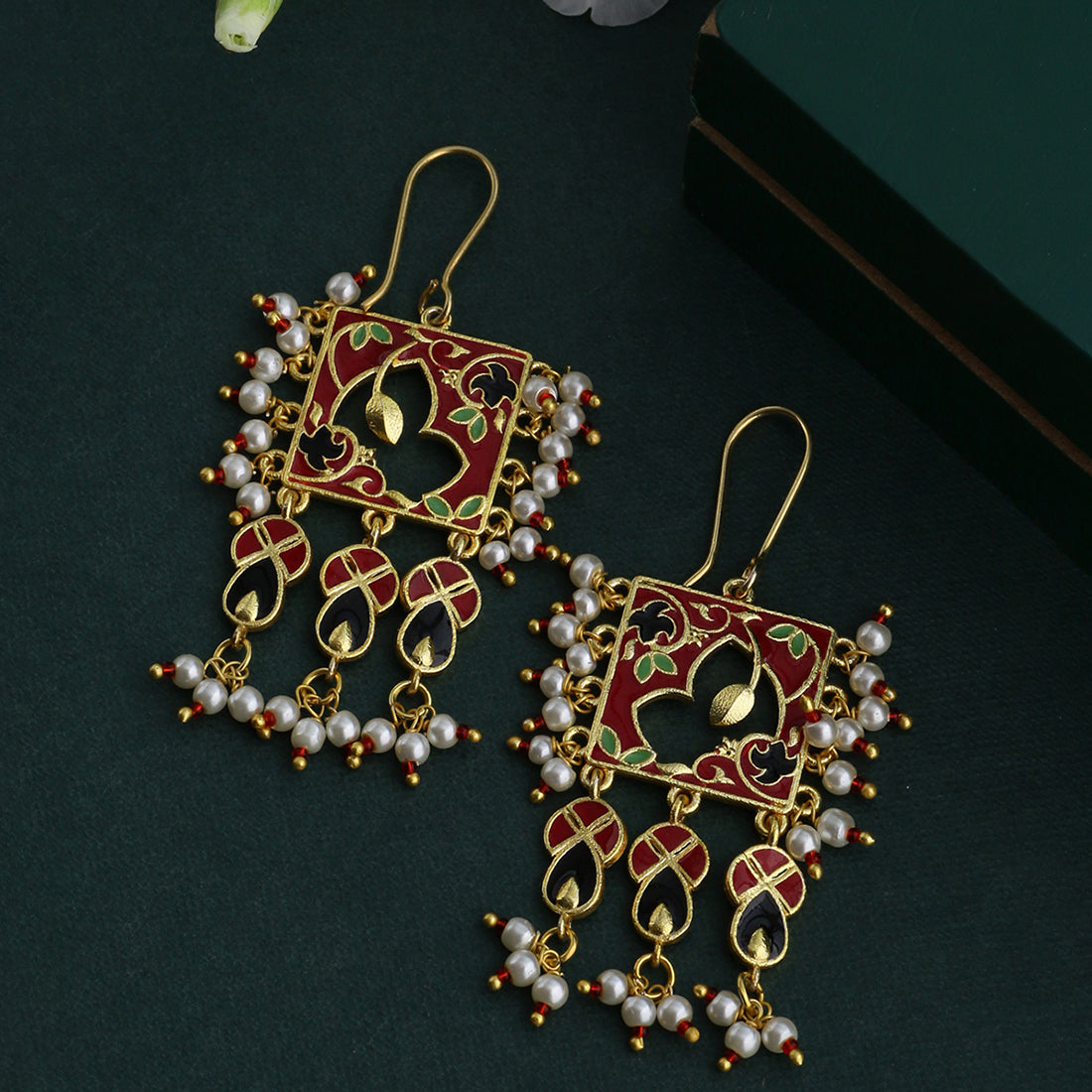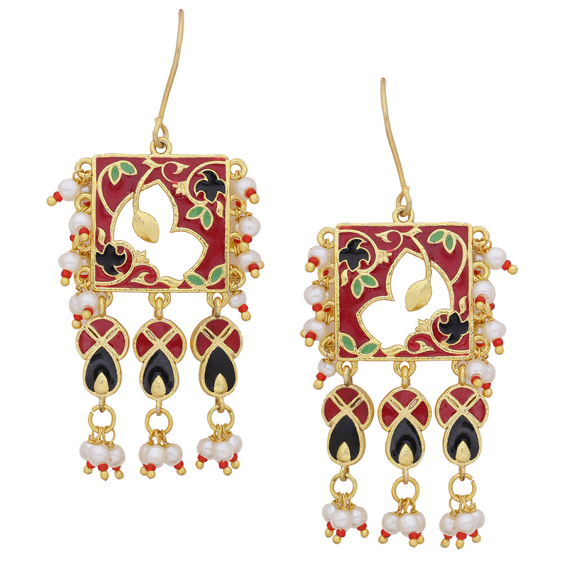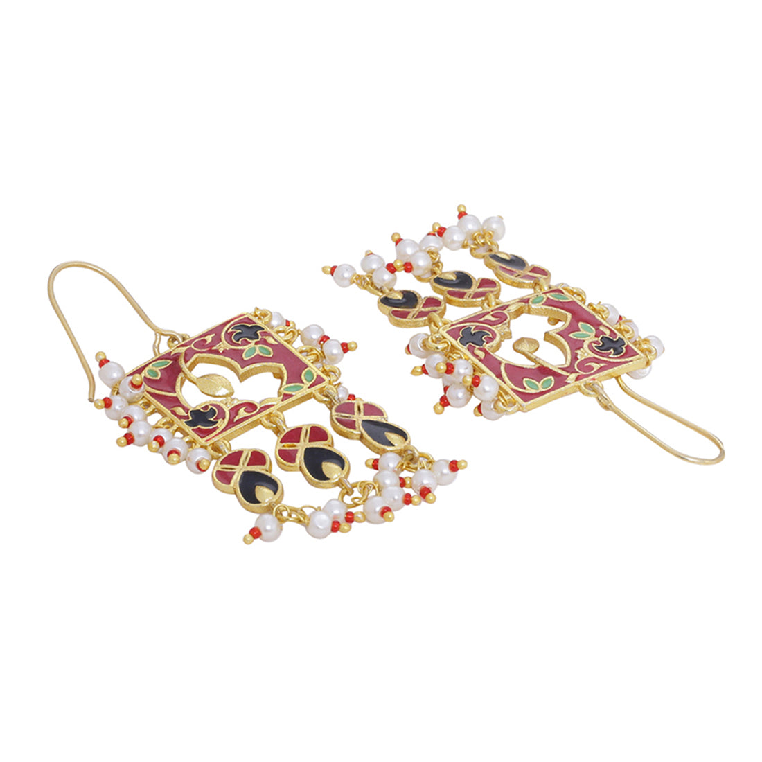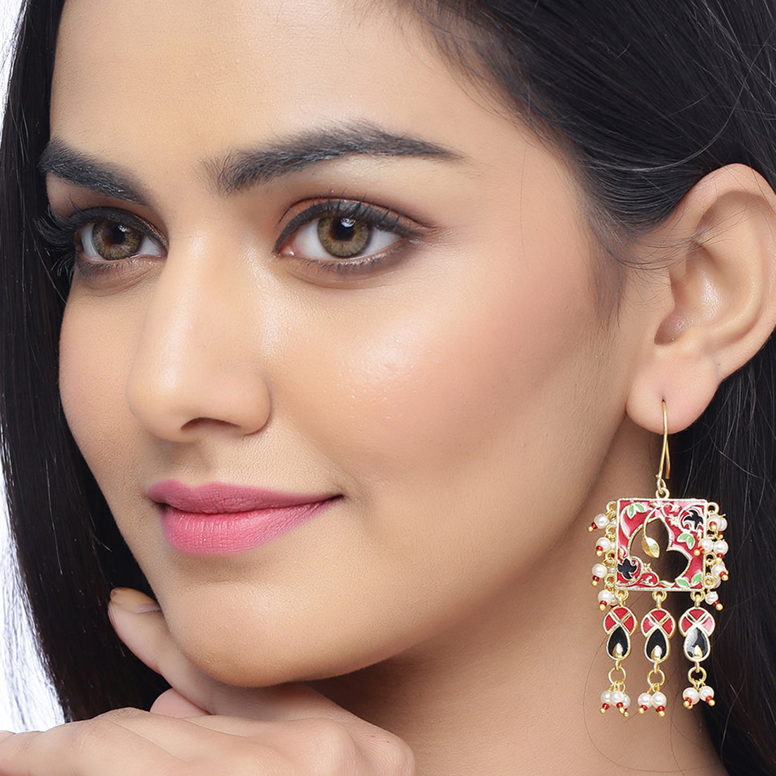 Whimsical cutwork with hand enamelled flowers make the Tahira Cutwork Red Earrings a stylish accessory for special days. This piece of jewelry comes with the Voylla assurance of quality and durability.
