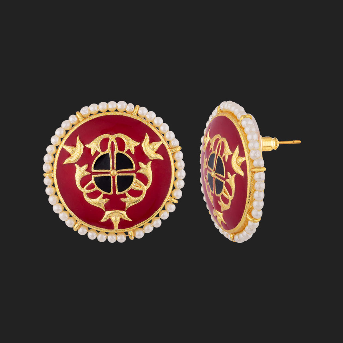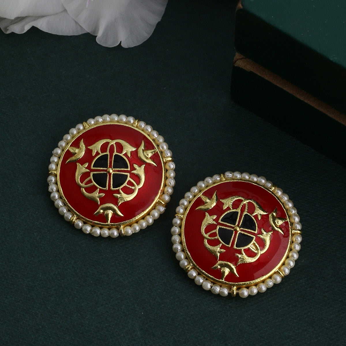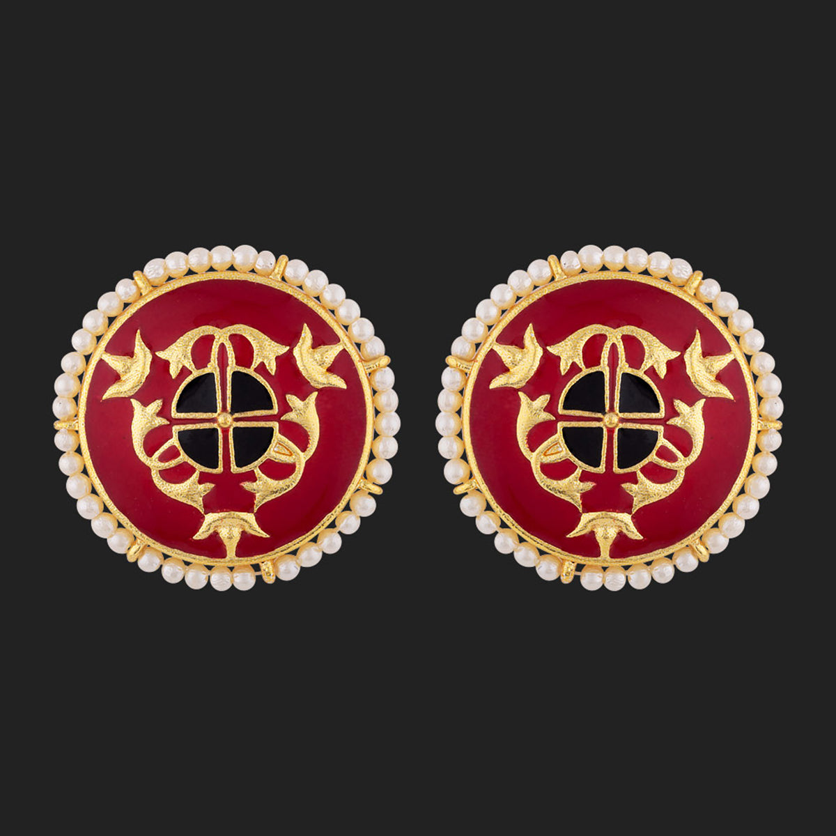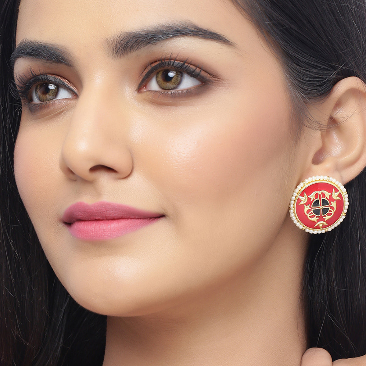 Chic and classy, the Tahira Red Bloom Studs are perfect for adding fun to your everyday ensemble. Hand enamelled detailing on gold plated surface. This piece of jewelry comes with the Voylla assurance of quality and durability.