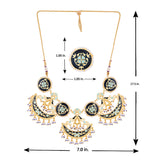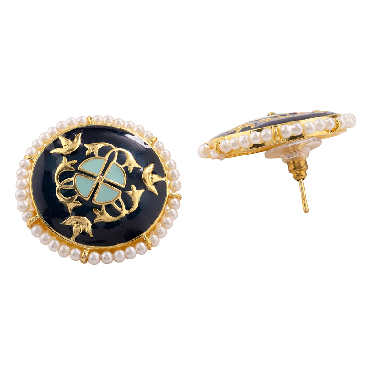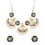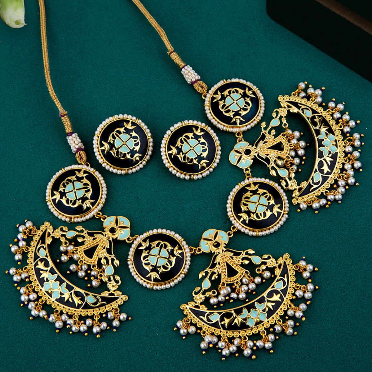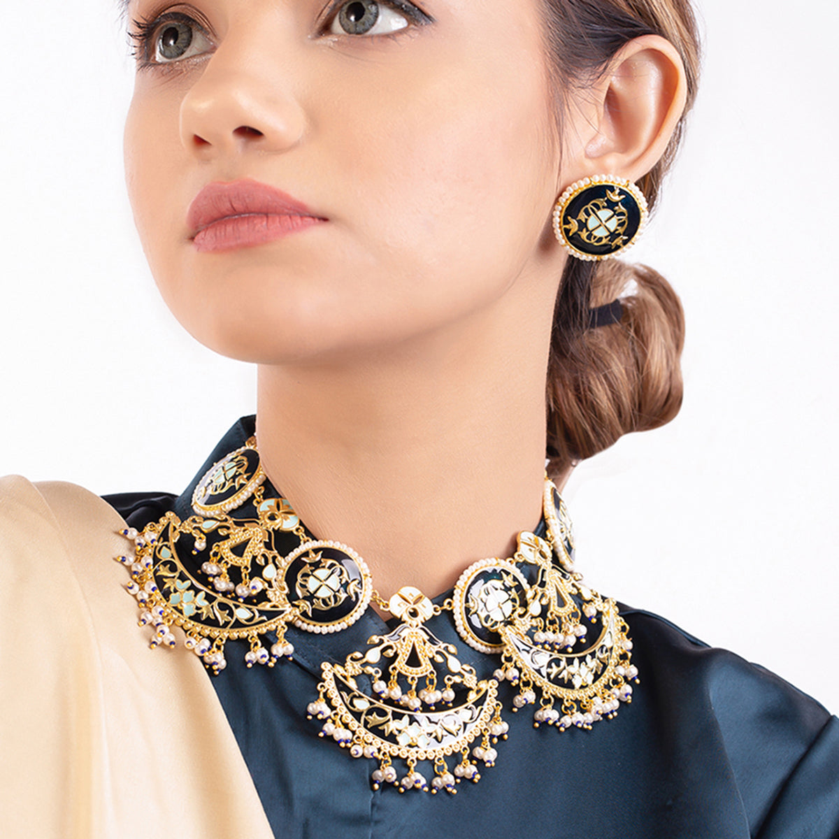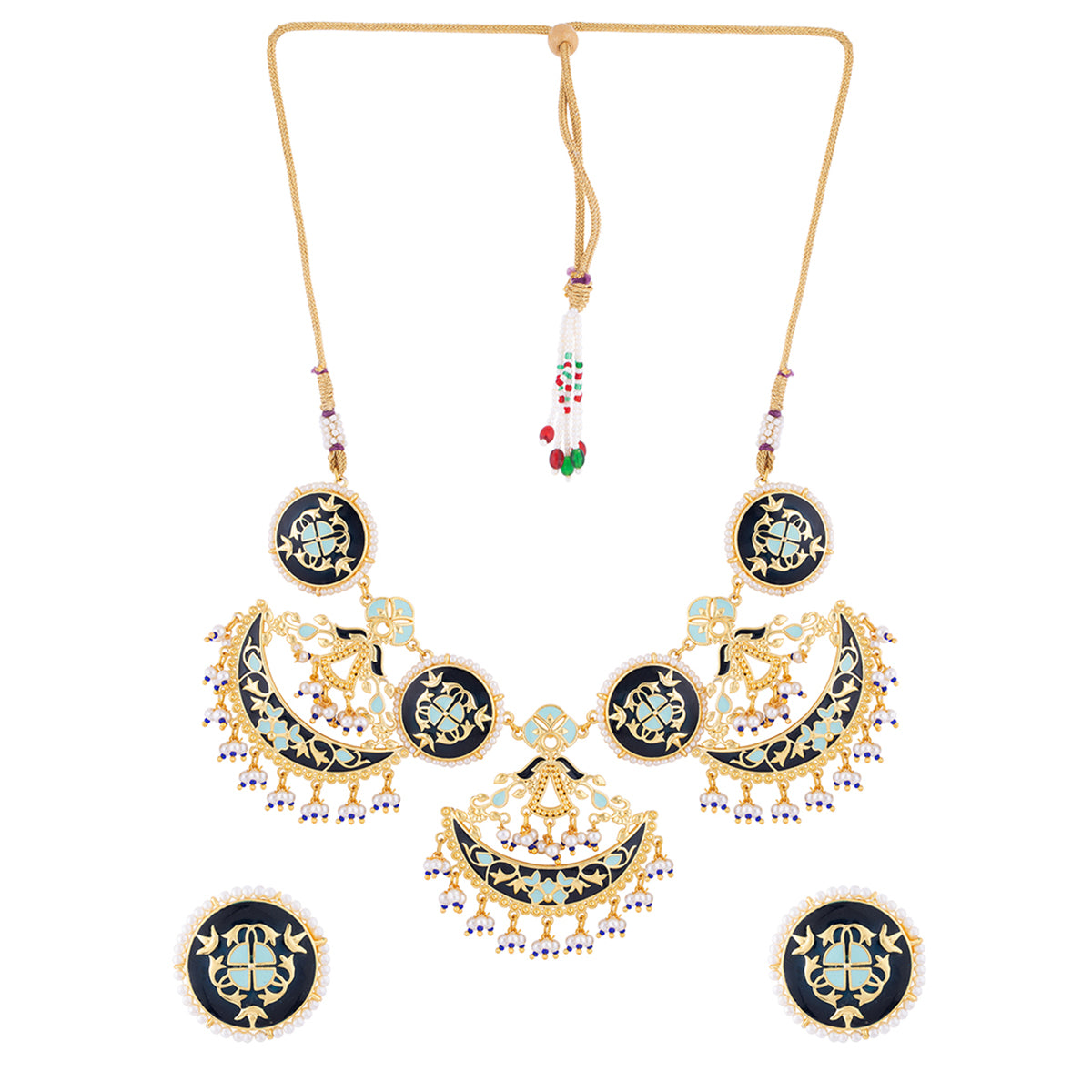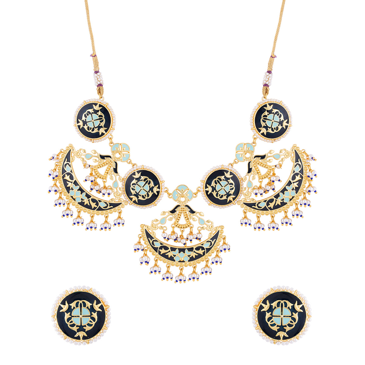 Pichhwai, Rajasthan's classic artform laden with bird and floral motifs, has inspired this brass necklace set, which has been heavily embellished with faux pearls. The enameled necklace and stud earrings have been given a yellow gold plating, making it the perfect match for formal Indian and Indo-Western attire.