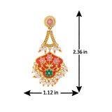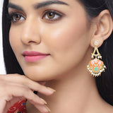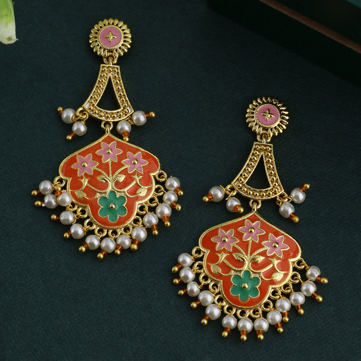 A pop of joyous colours in the Tahira Orange Bloom Chandelier Earrings make for a festive look. Gold plating on premium brass, pearl and hand enamelled detailing.
