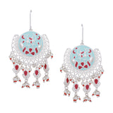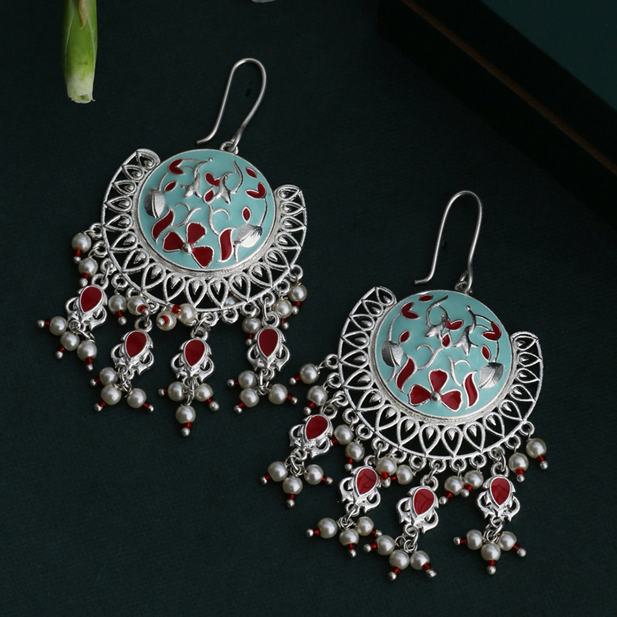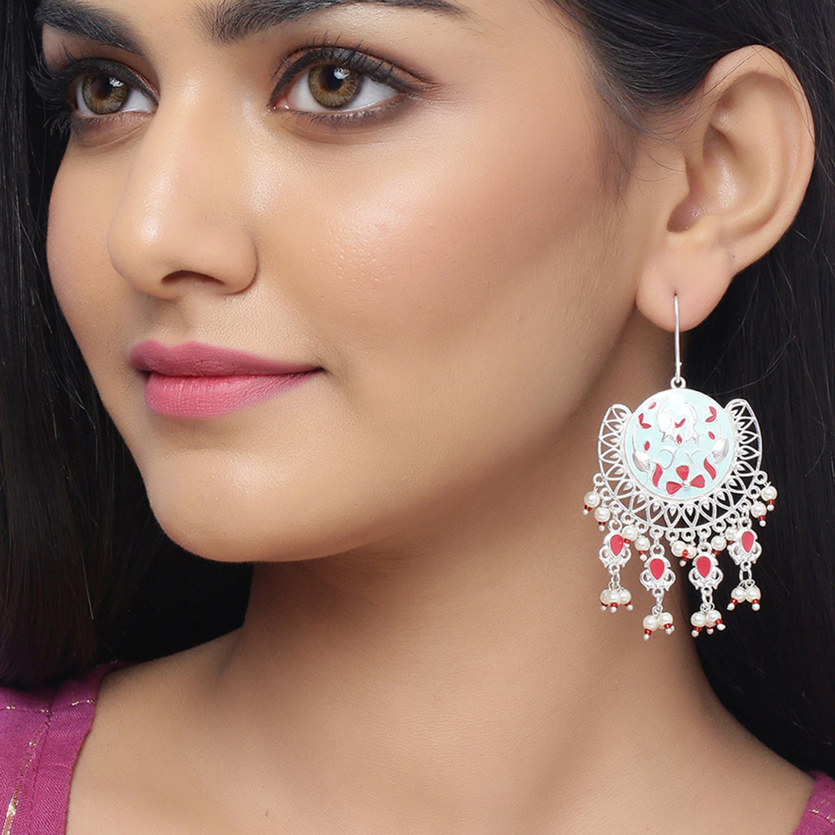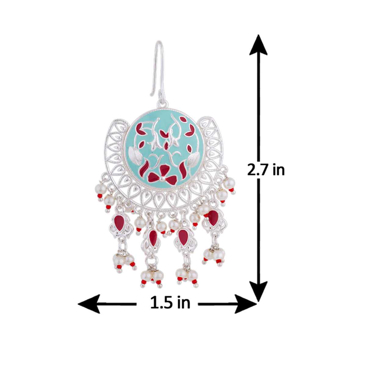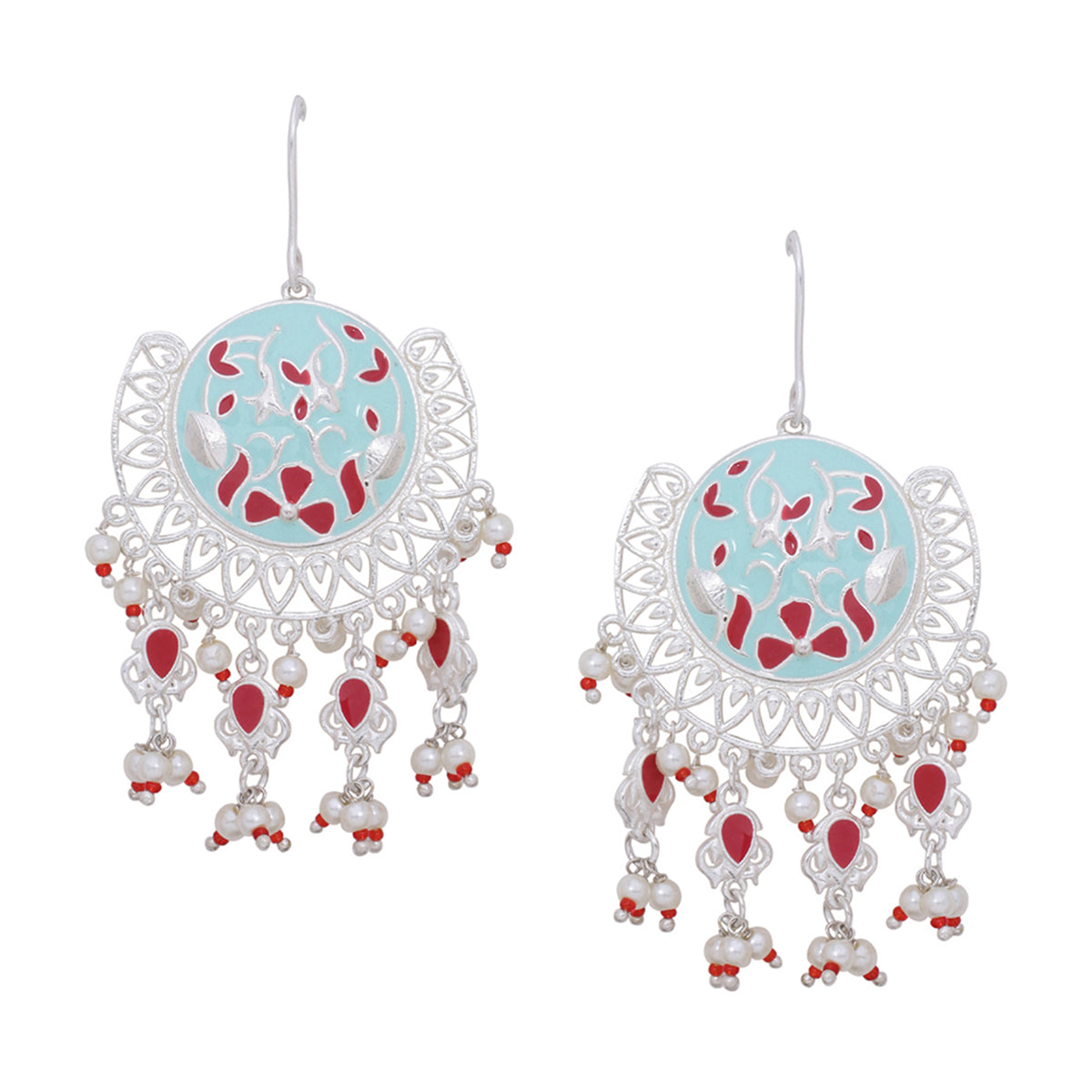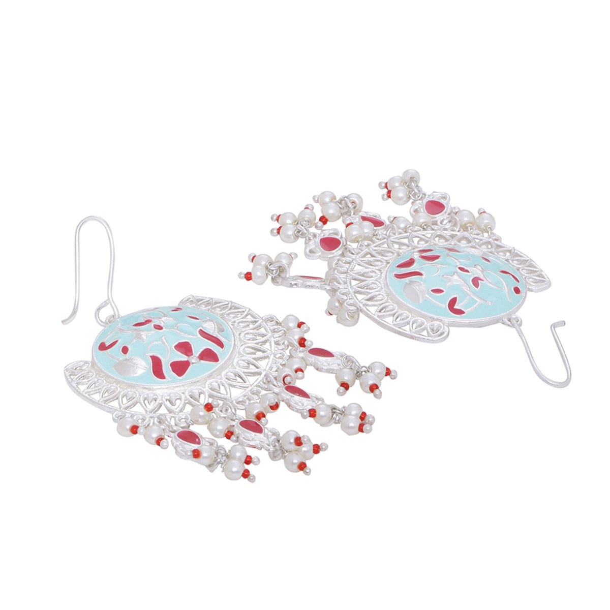 Shimmer and shine in the Tahira Silver Sparkle Chand Bali Earrings. Perfect for day time parties, these come enhanced with pearl and hand enamelled detailing. This piece of jewelry comes with the Voylla assurance of quality and durability.