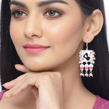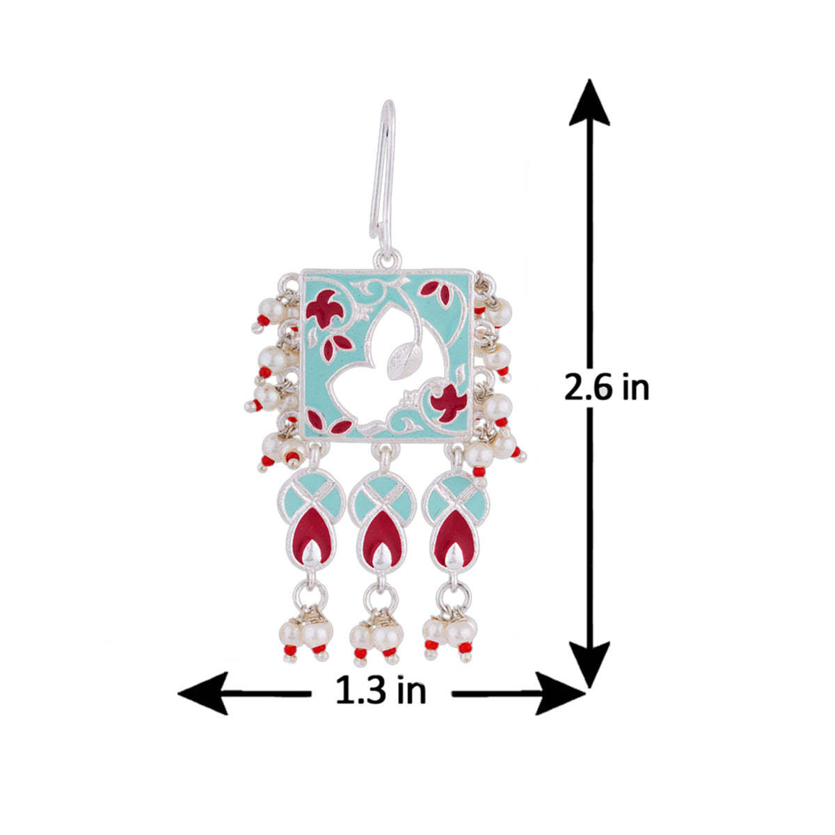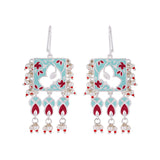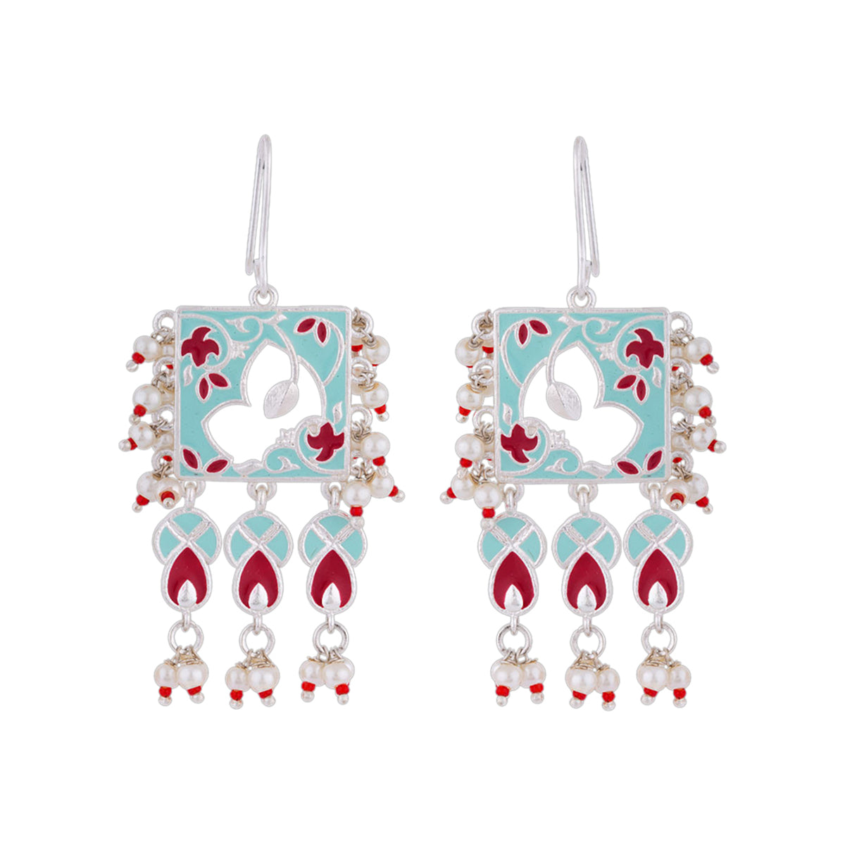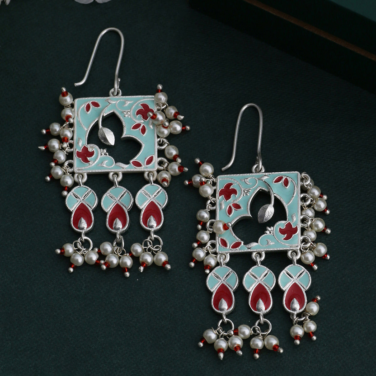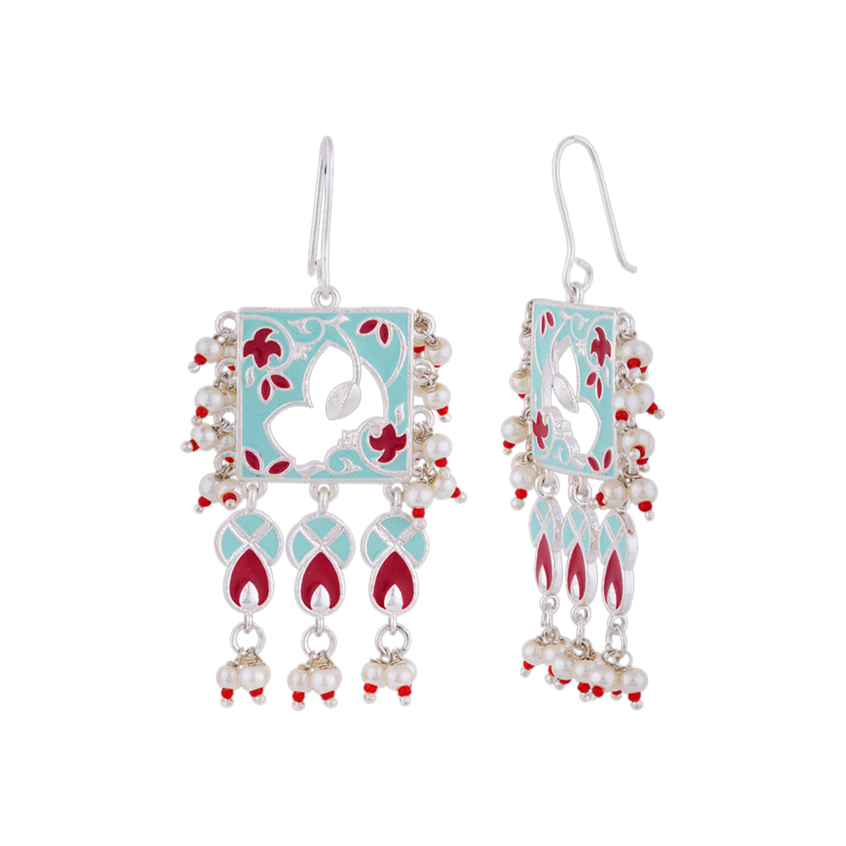 Romance of silver with elegant hand enamelling makes Tahira Cutwork Ferozi Earrings a must have for everyday fun.