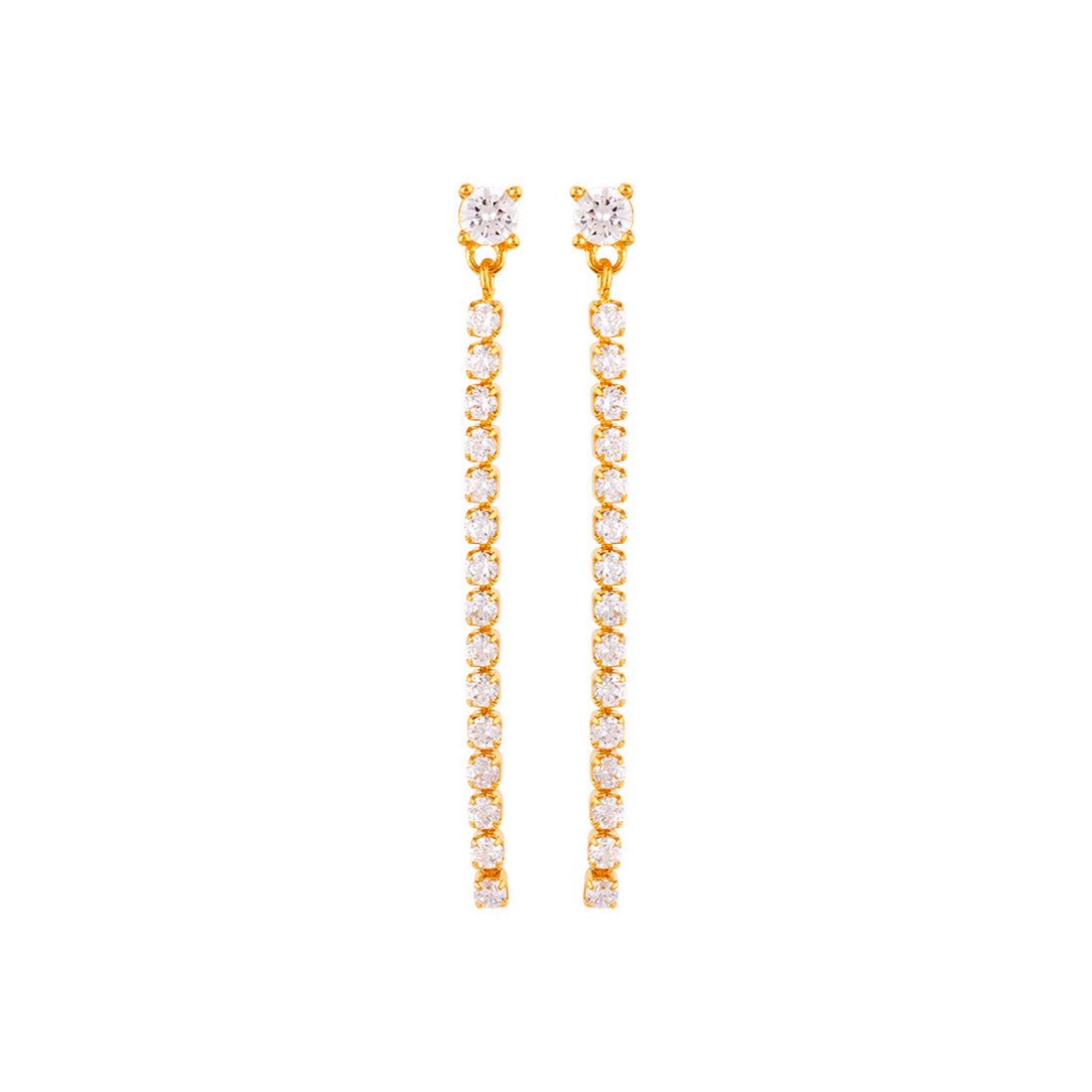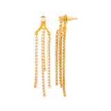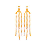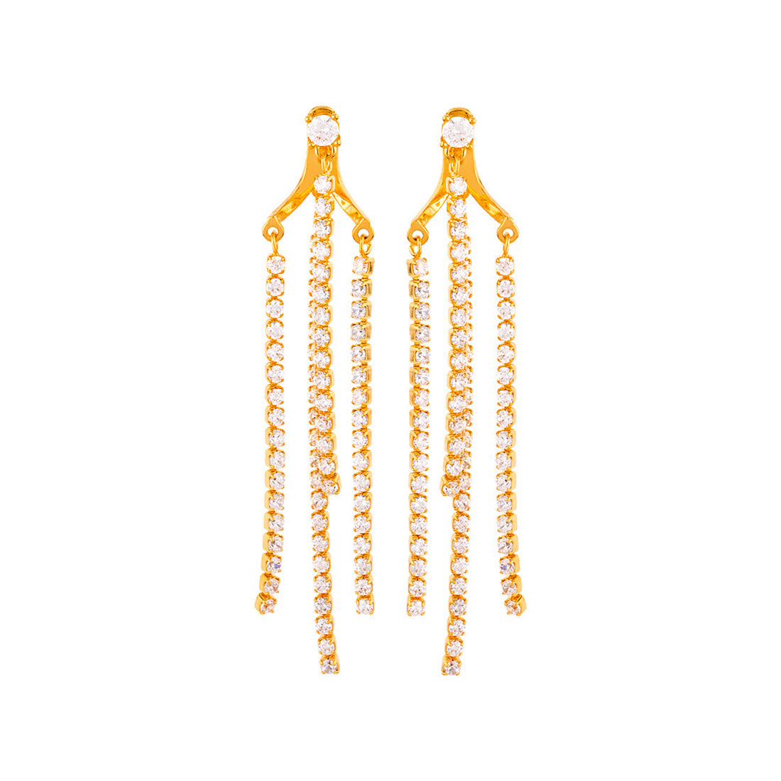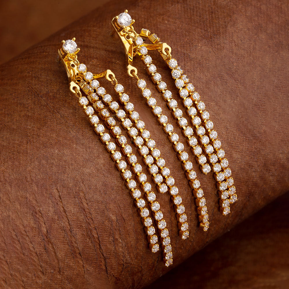 Tassels drop brass earrings with yellow gold plating. American Diamond gems embellished. Wear with a summer dress. This piece of jewelry comes with the Voylla assurance of quality and durability.