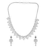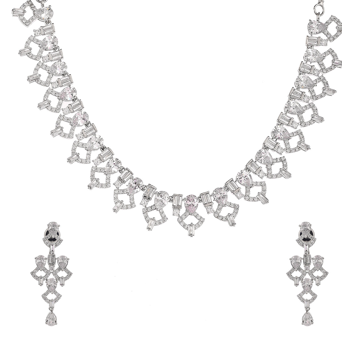 Embellished with teardrop cut cubic zirconia gemstones, this jewellery set has been fashioned out of brass. The silver plated necklace and drop earrings are lightweight and comfortable. The set will pair splendidly with cocktail dresses, evening gowns and designer sarees.