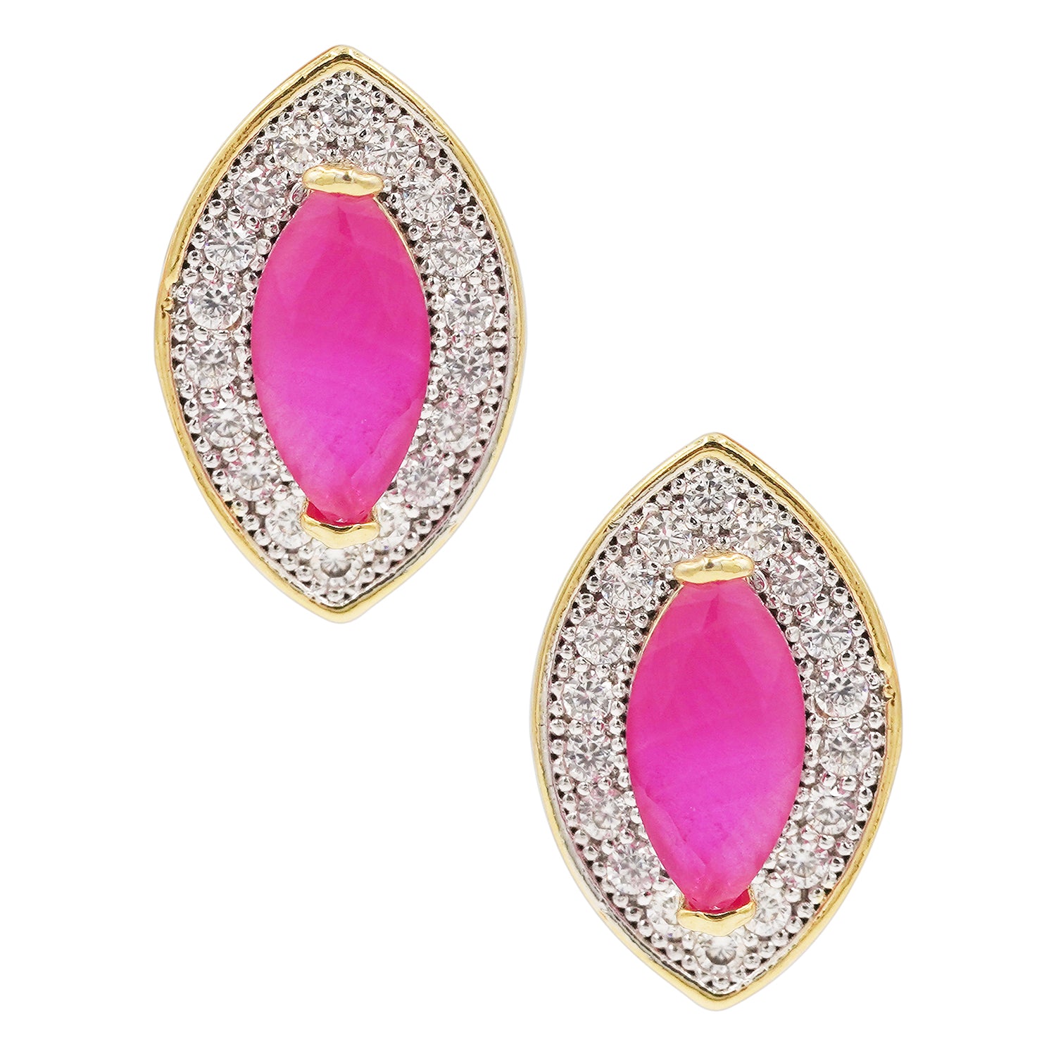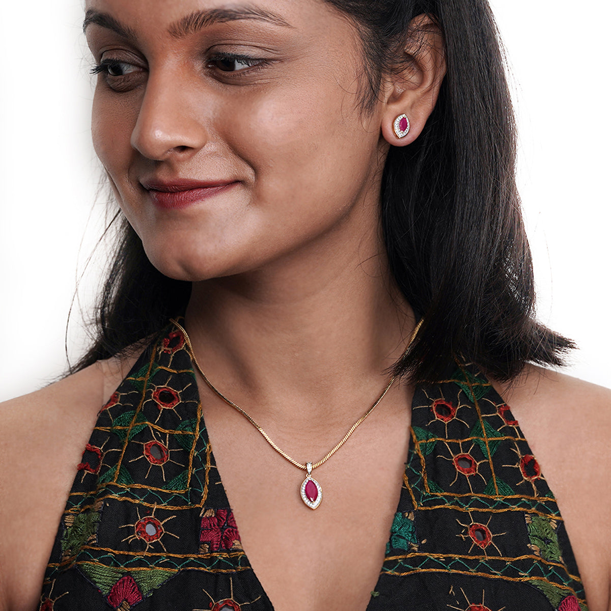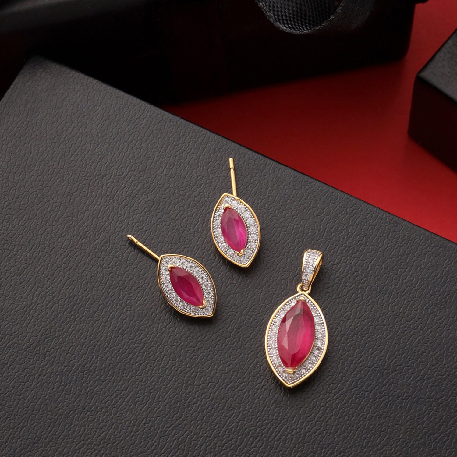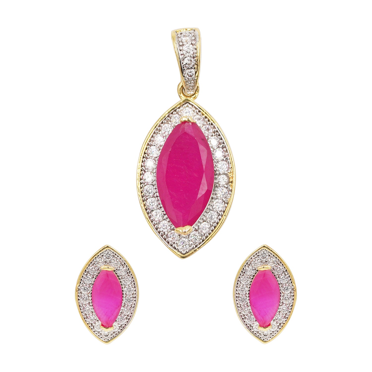 This teardrop-shaped pendant set is for ladies who like to love pink. The CZ work looks expensive while the gorgeous pink faux stone adds the vibrance. Perfect for office wear or a casual day out when you want to look gorgeous but don't want to attract too much attention.
