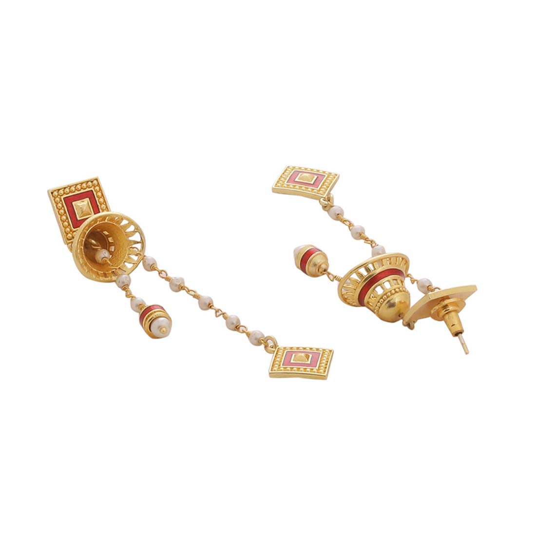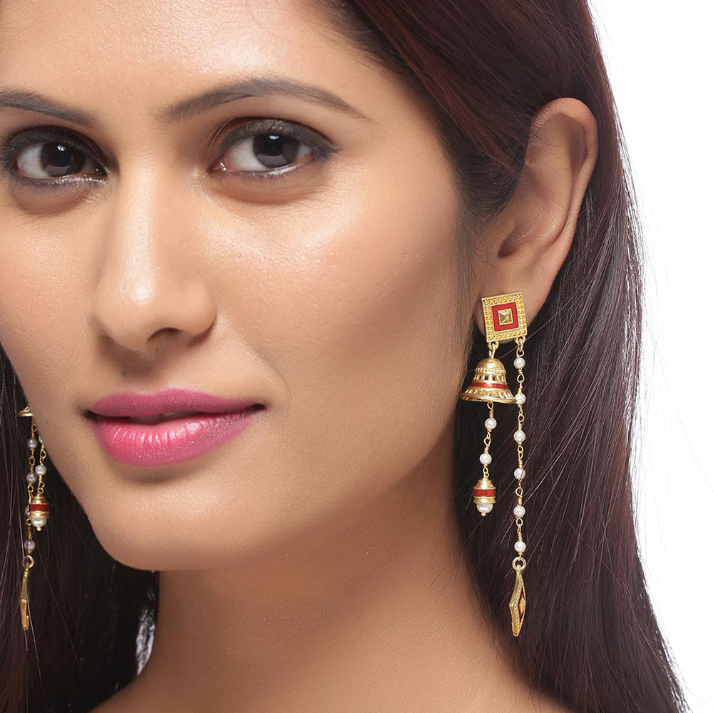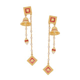 Asymmetrical drop earrings made from brass. Wear the yellow gold plated pair with a trendy saree.