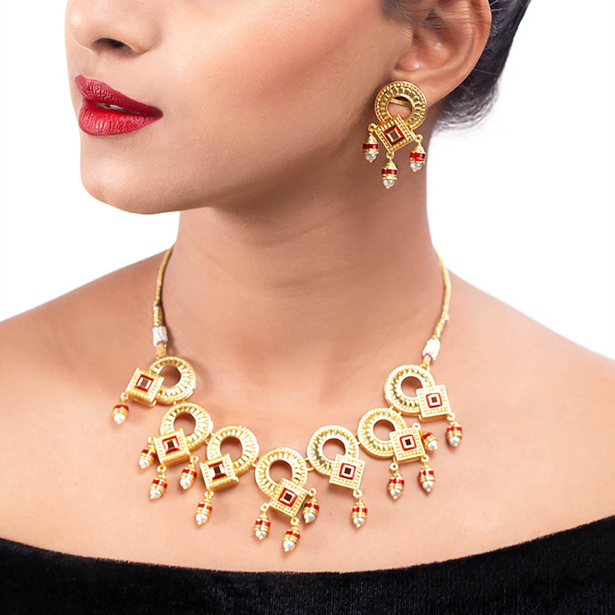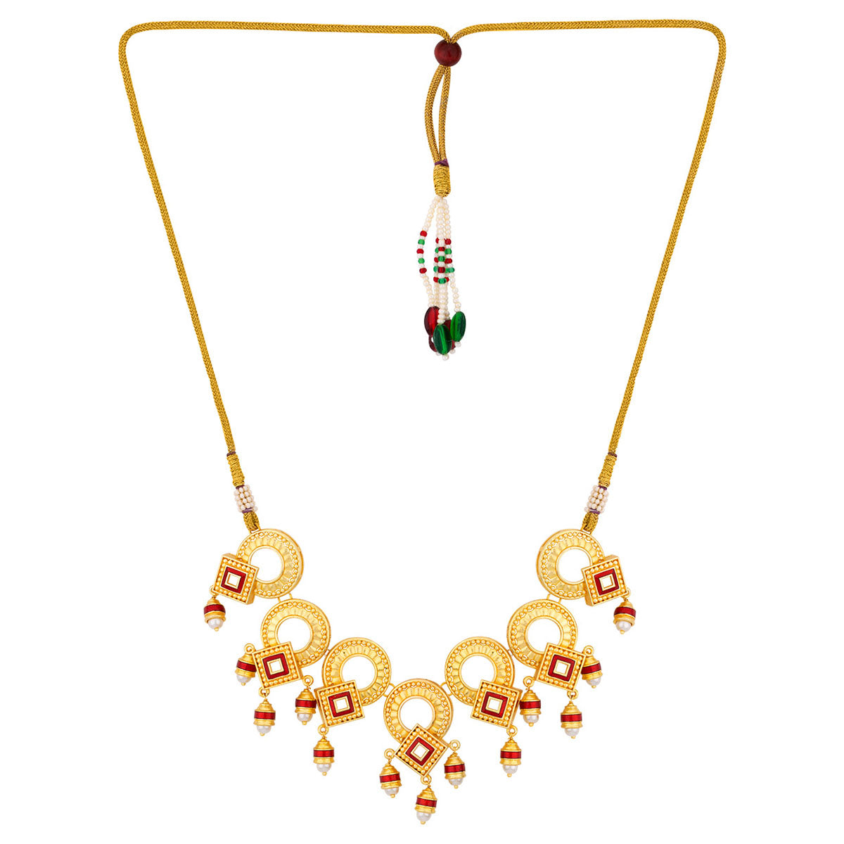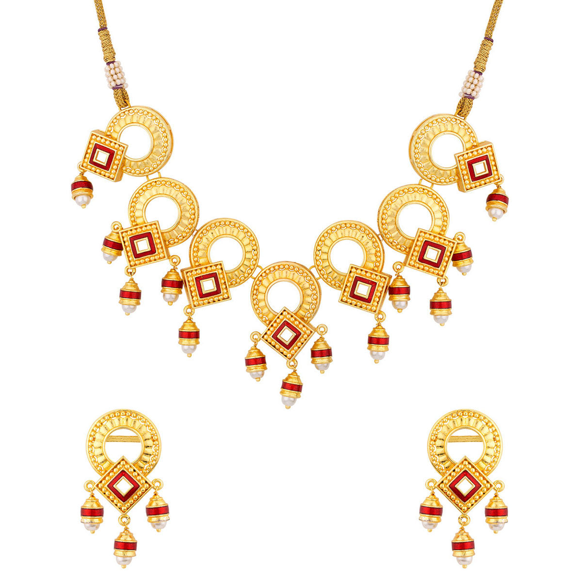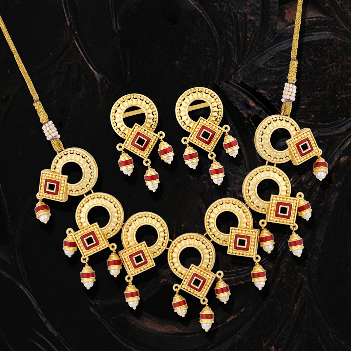 Faux pearls and enamel embellished brass necklace set. Yellow gold plated. Wear with a cocktail dress.