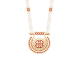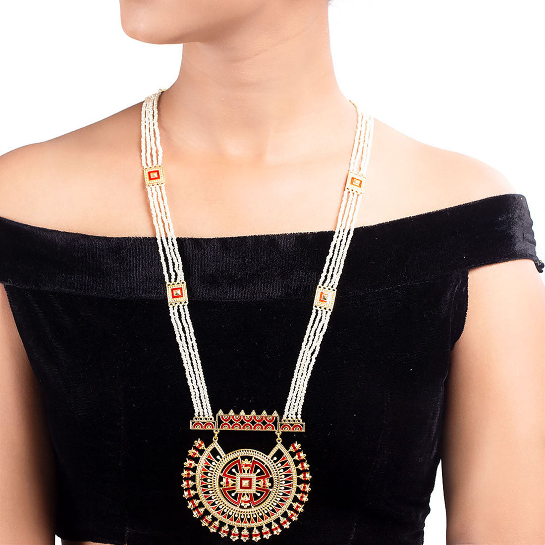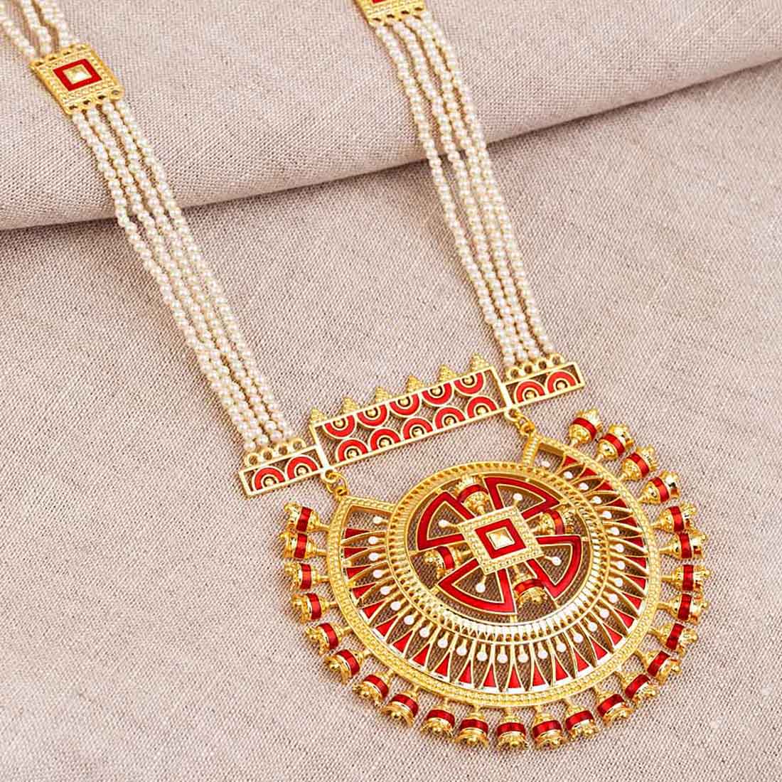 Faux pearls and red enamel embellished brass necklace. Yellow gold plated and a perfect match for formal ethnic looks.