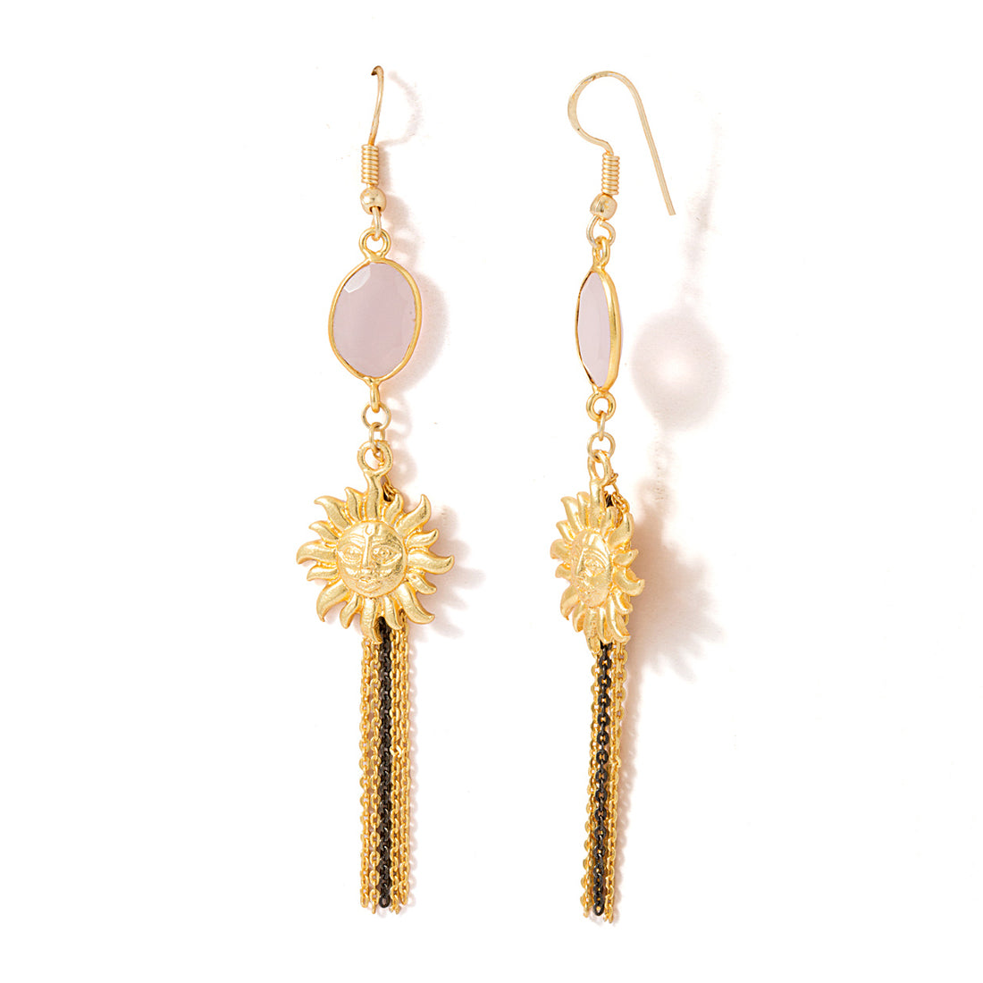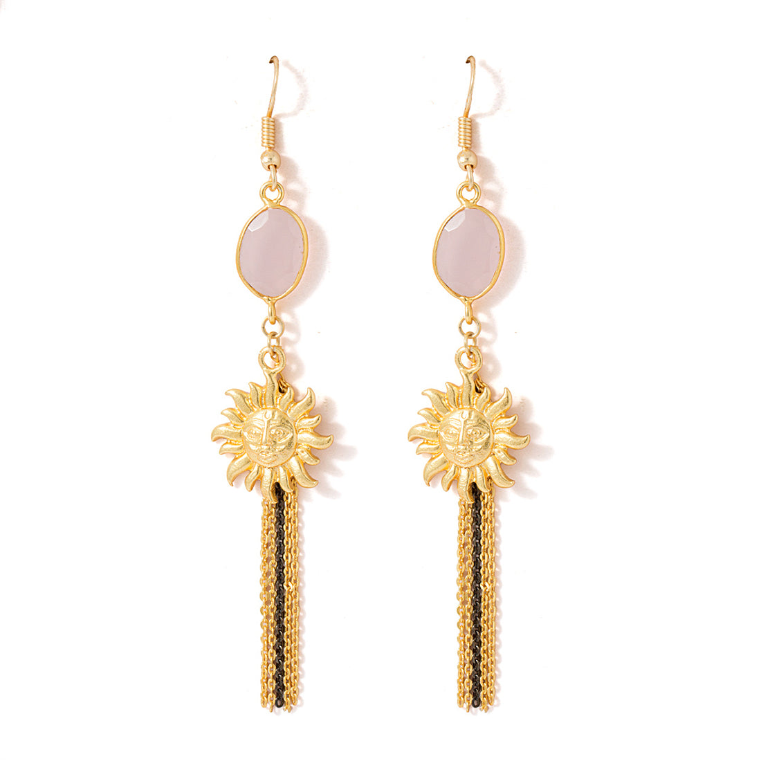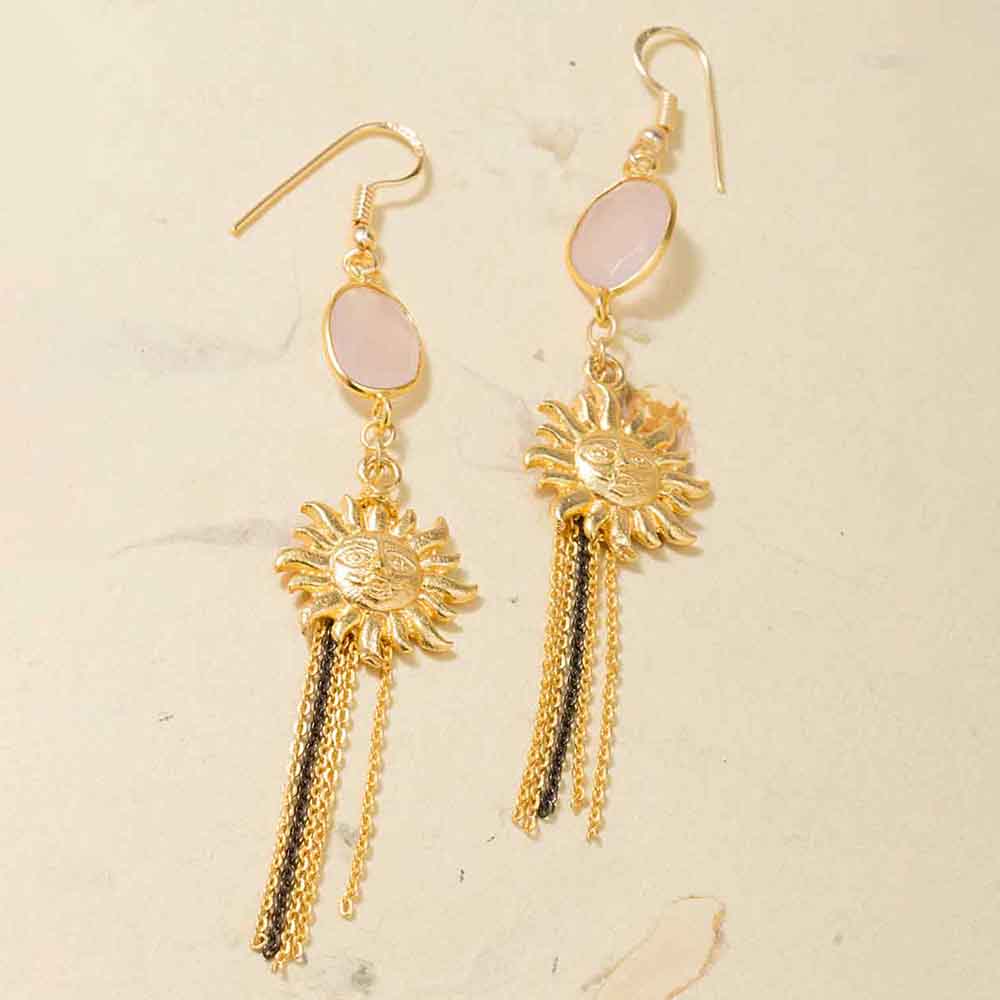 A must have earrings pair in your collection, add a bling to all your outfits. This sun themed dangler earrings pair comes with delicate gold tone. Encrustation of pink gleaming fuax stone adds glamour to it.
