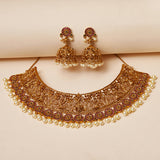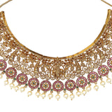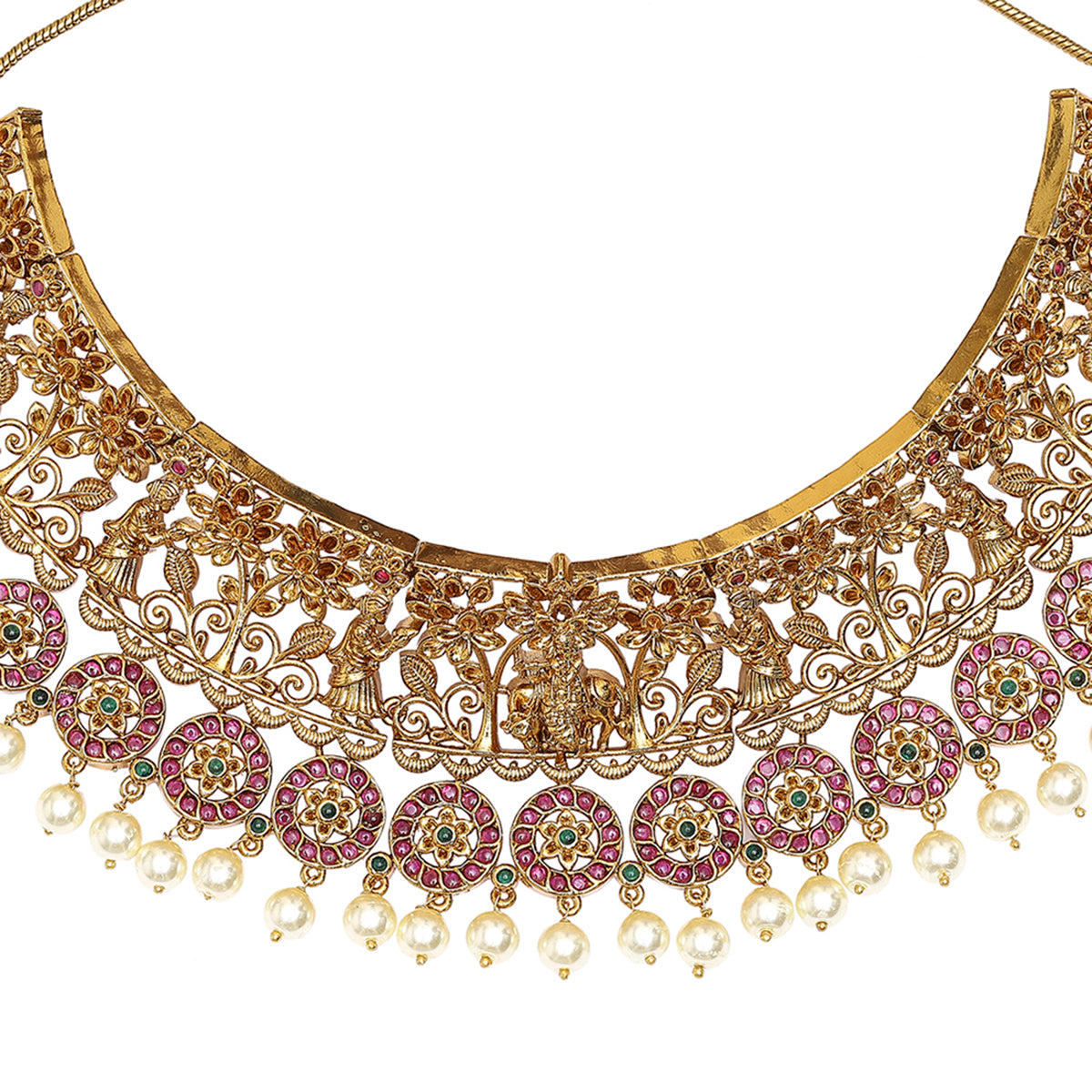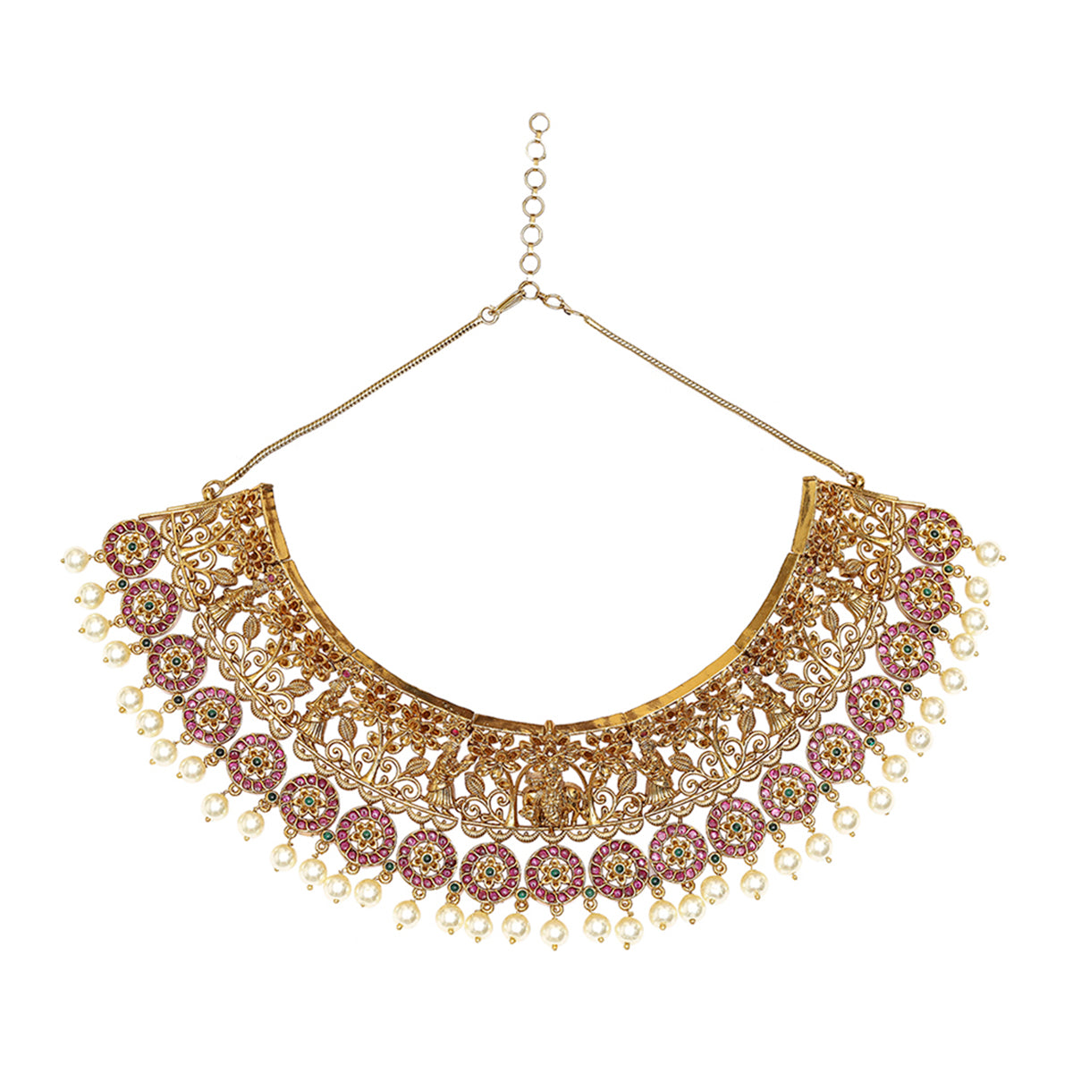 Classic gold plated brass jewellery set fashioned into a traditional temple inspired design. Embossed with divine motifs, the necklace and drop earrings have been embellished with faux pearls and zirconia gemstones. The set will pair well with formal Indian outfits.