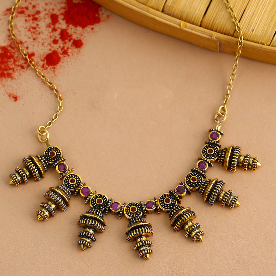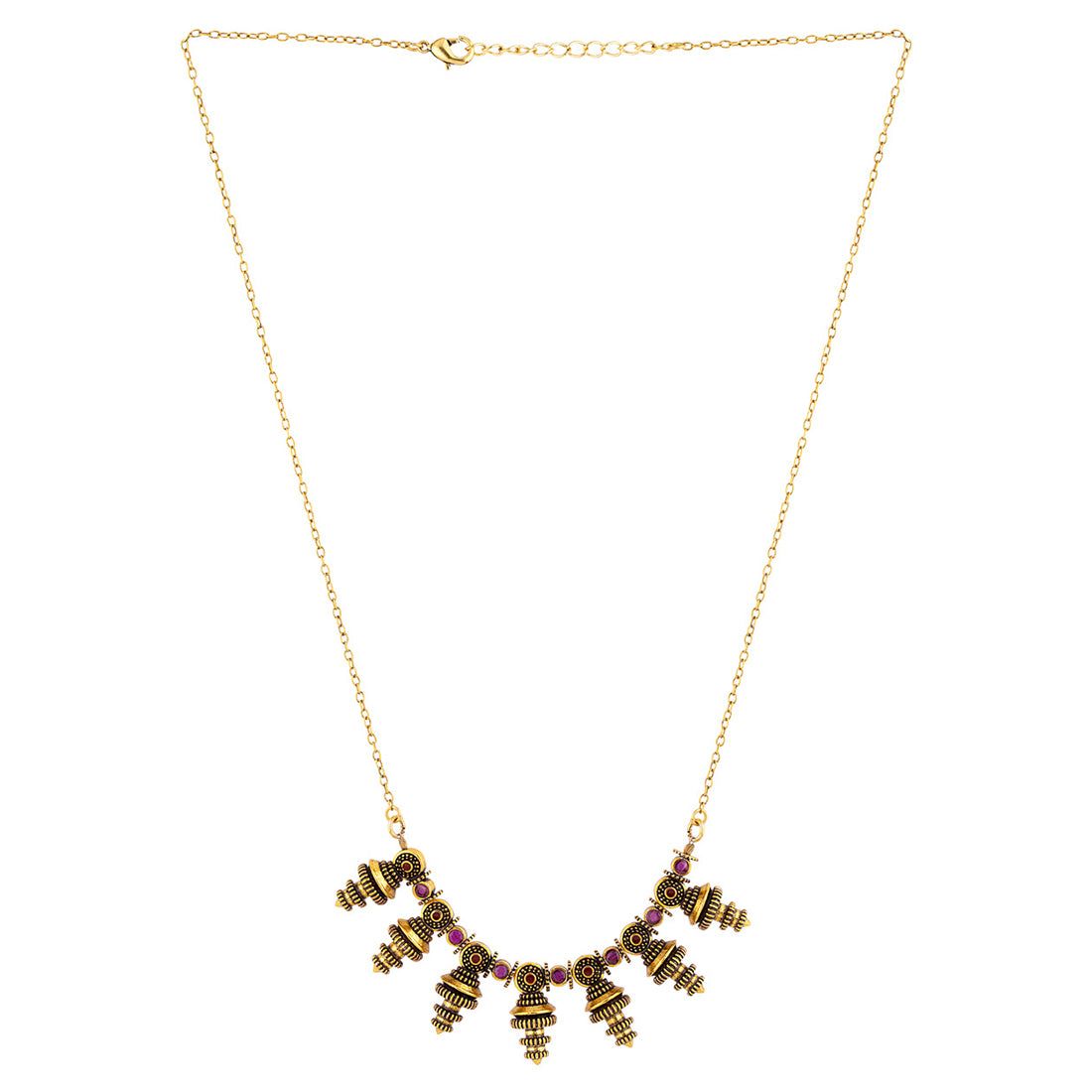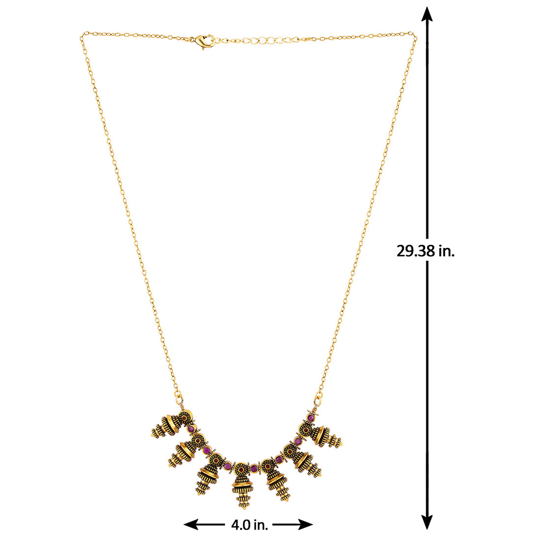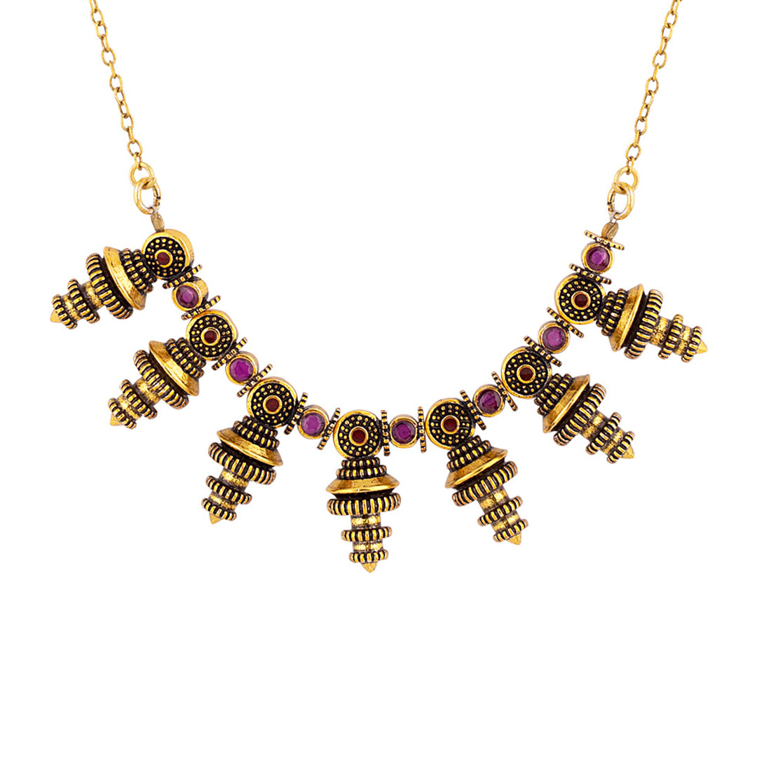Antique motifs necklace fashioned out of brass and featuring an antique gold plating. Pair with a causal dress.